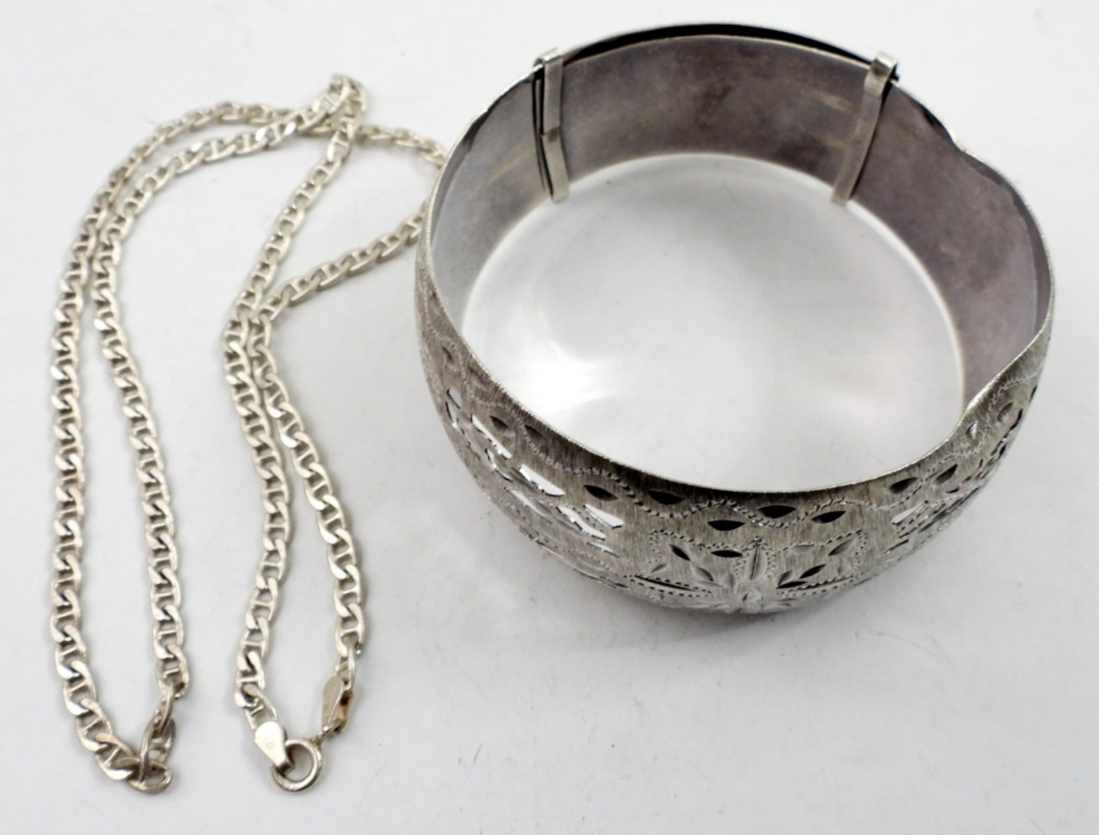 18 IN STERLING NECKLACE AND A STERLING BANGEL BRACELET . 31.8 DWT