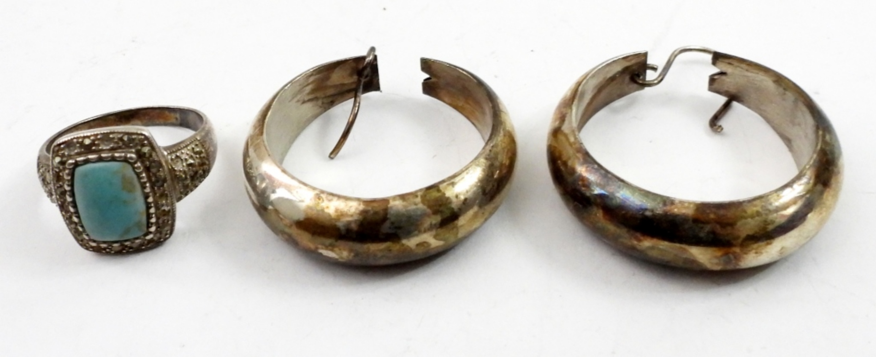 16 IN MEXICO STERLING NECKLACE , A PAIR OF MEXICO STERLING EARRINGS AND A SIZE 9 RING WITH BLUE STONE 59.3 DWT