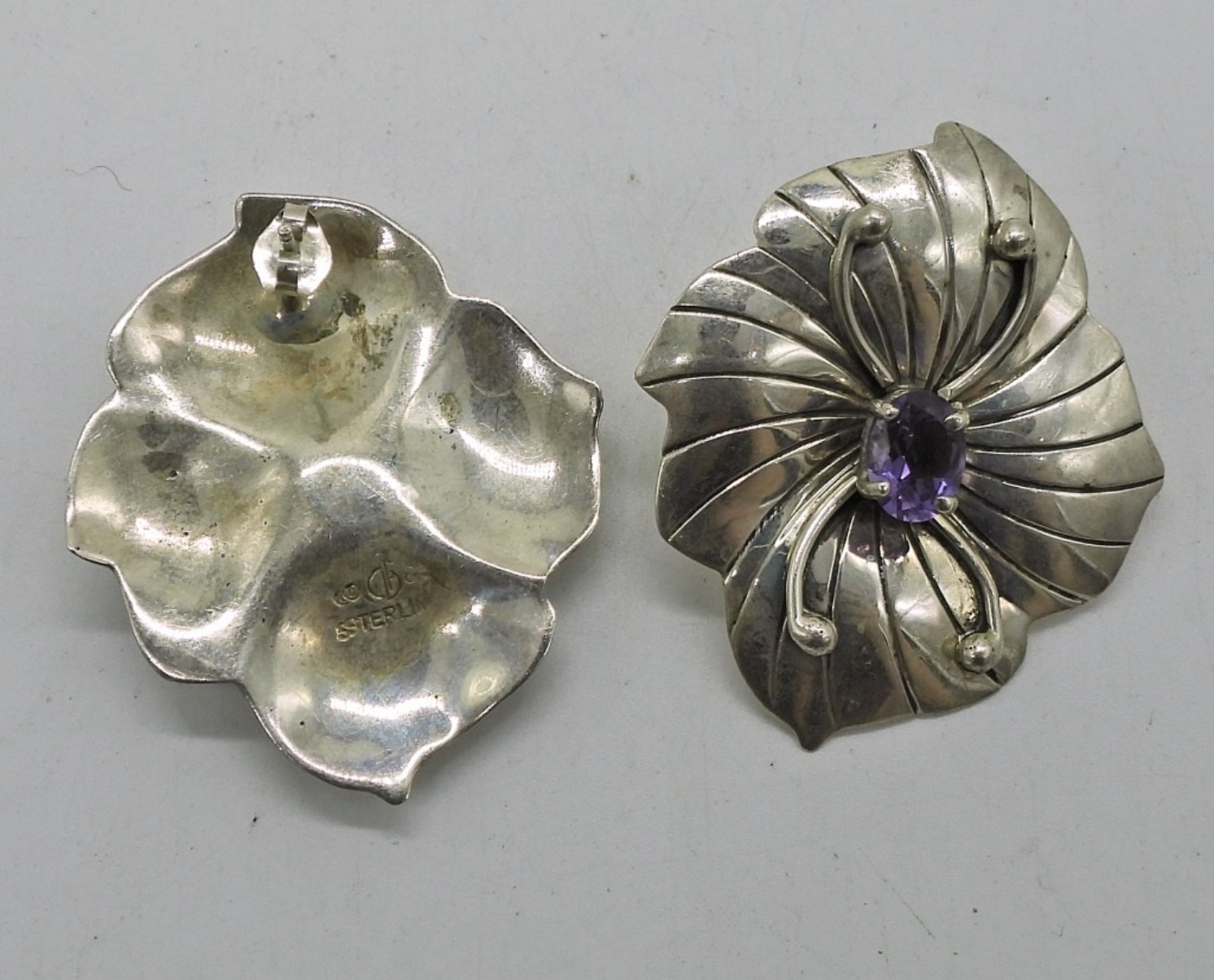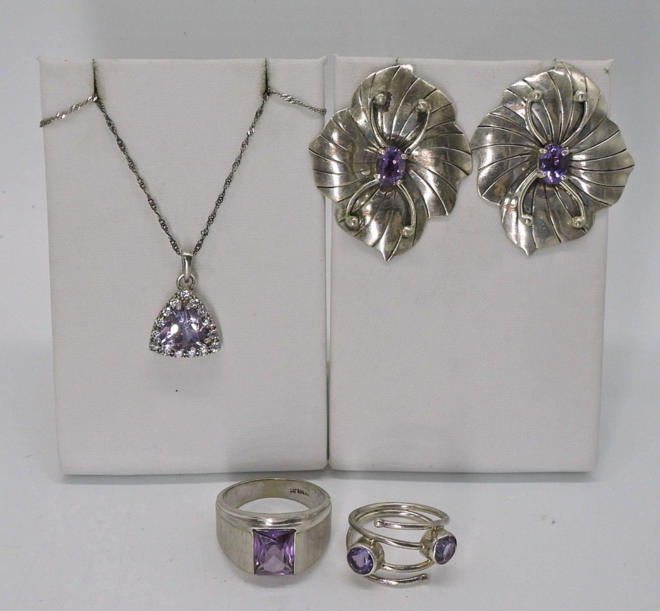 TWO STERLING RINGS WITH AMETHYST GEMSTONES, SIZES 7 & 10. STERLING AMETHYST NECKLACE, 18″. FLORAL AMETHYST PIERCED EARRINGS, 1.5″. 17.1 DWT