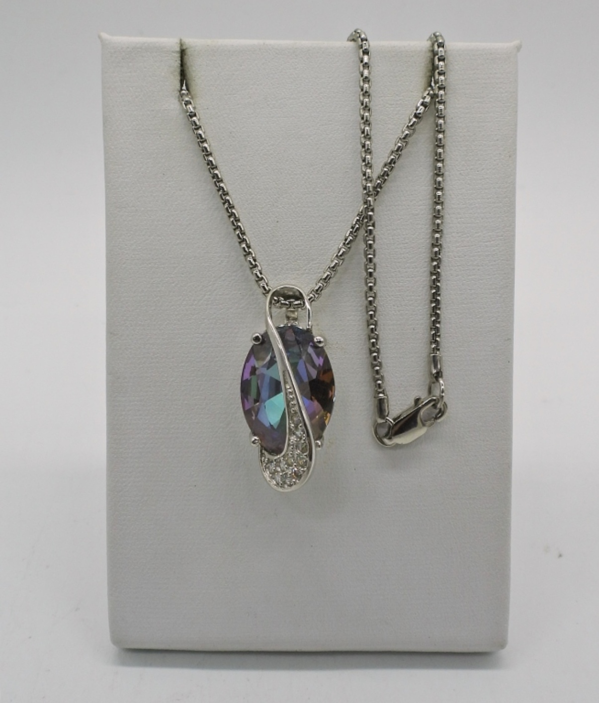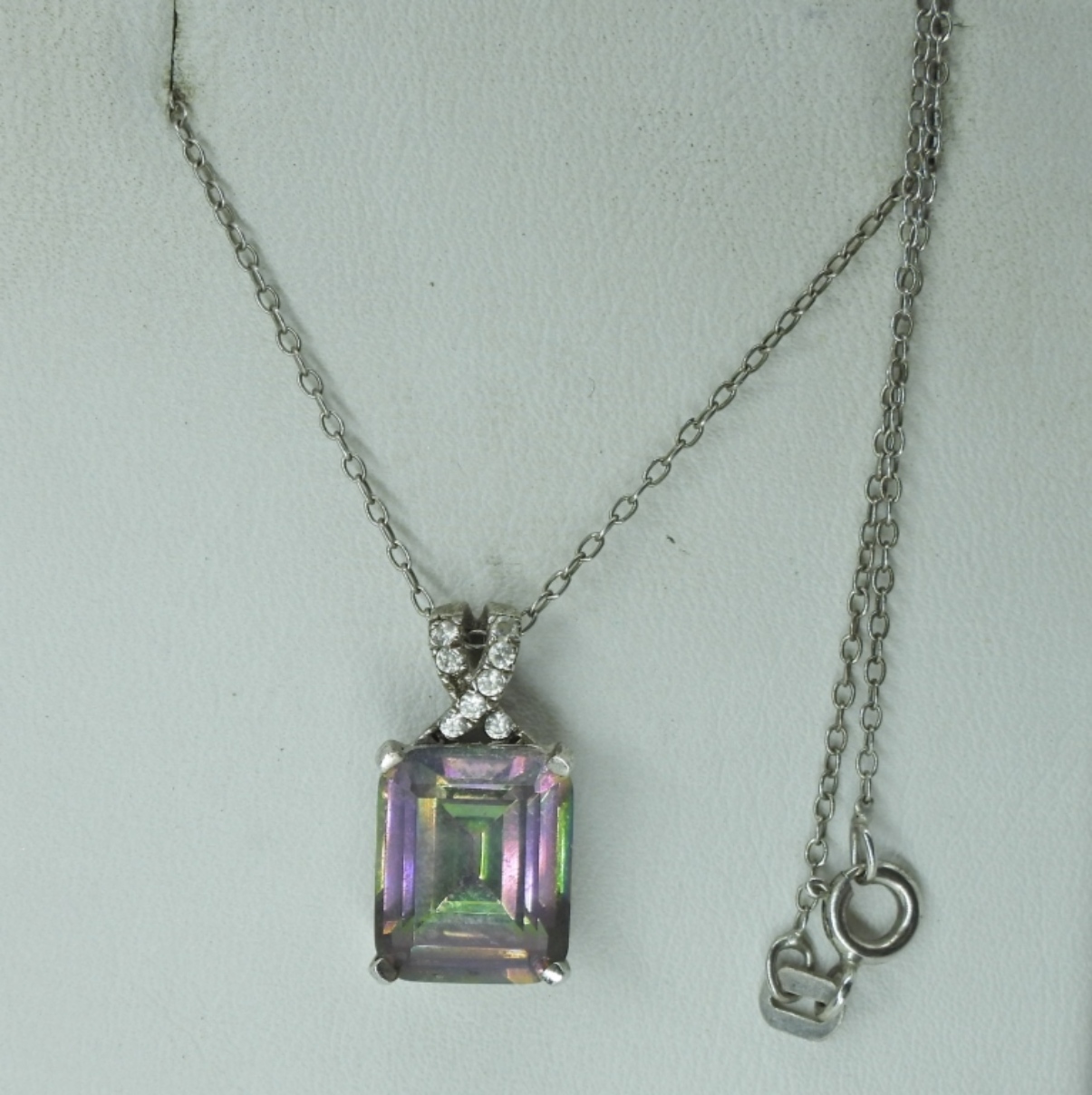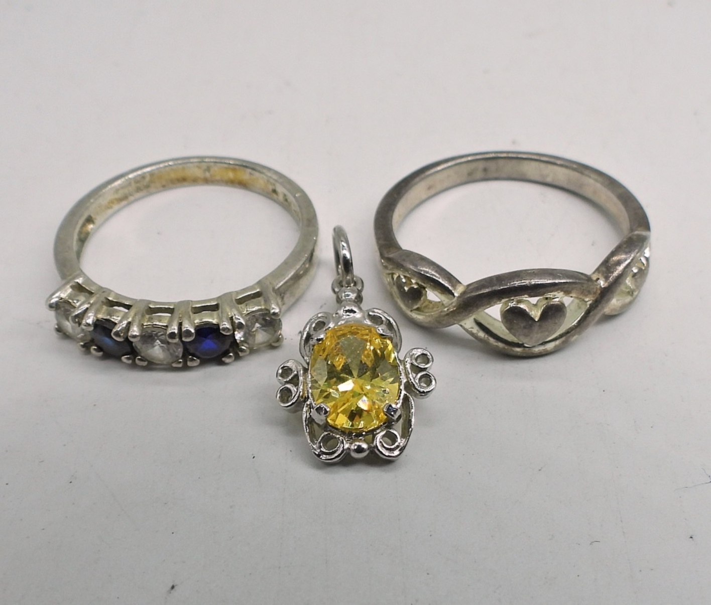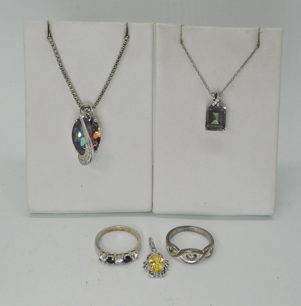 TWO MYSTIC TOPAZ NECKLACES, 18″. YELLOW GEMSTONE PENDANT AND TWO STERLING RINGS, SIZES 7 & 8. 13.3 DWT