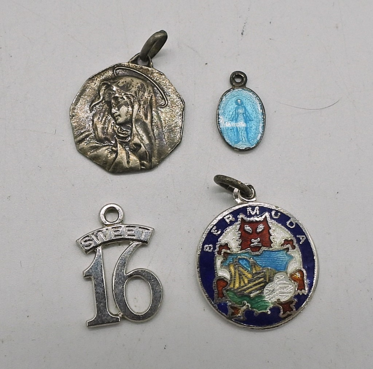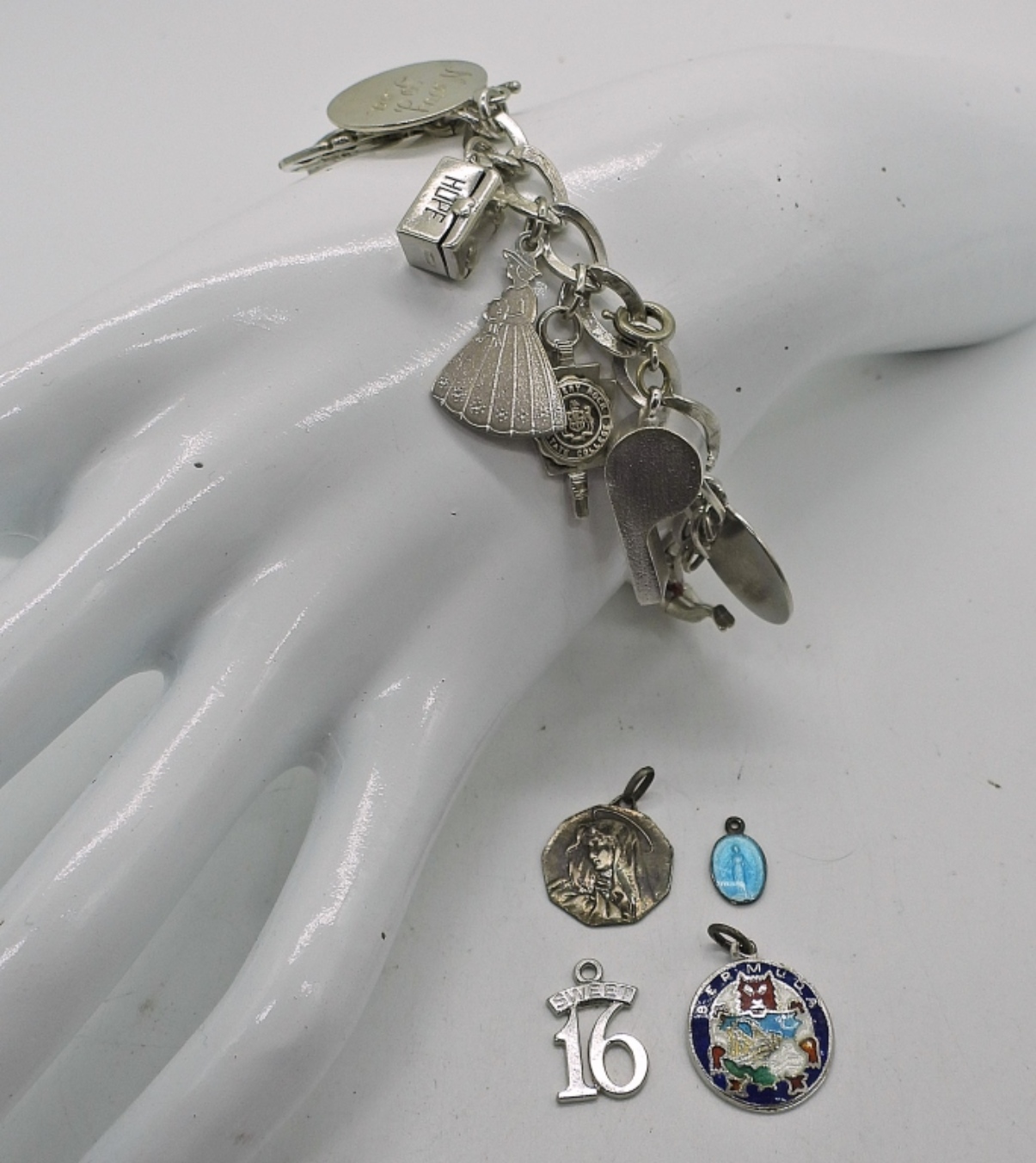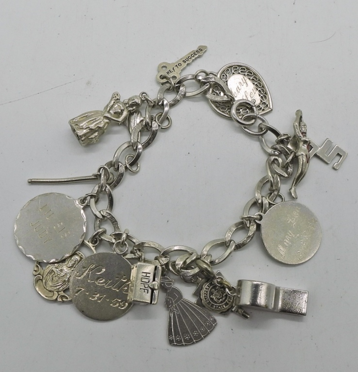 7″ STERLING VINTAGE CHARM BRACELET WITH 19 STERLING CHARMS. 30.5 DWT