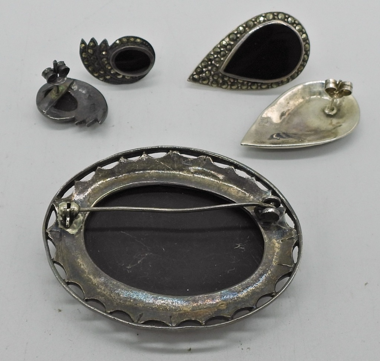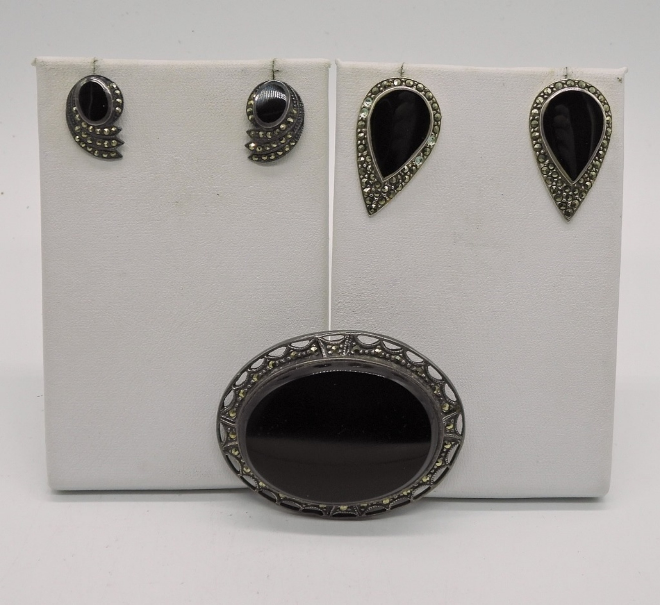 LARGE VINTAGE STERLING BLACK ONYX MARCASITE BROOCH, 2″. TWO PAIR OF PIERCED STERLING EARRINGS WITH BLACK ONYX LIKE GEMSTONES AND MARCASITE. 21 DWT