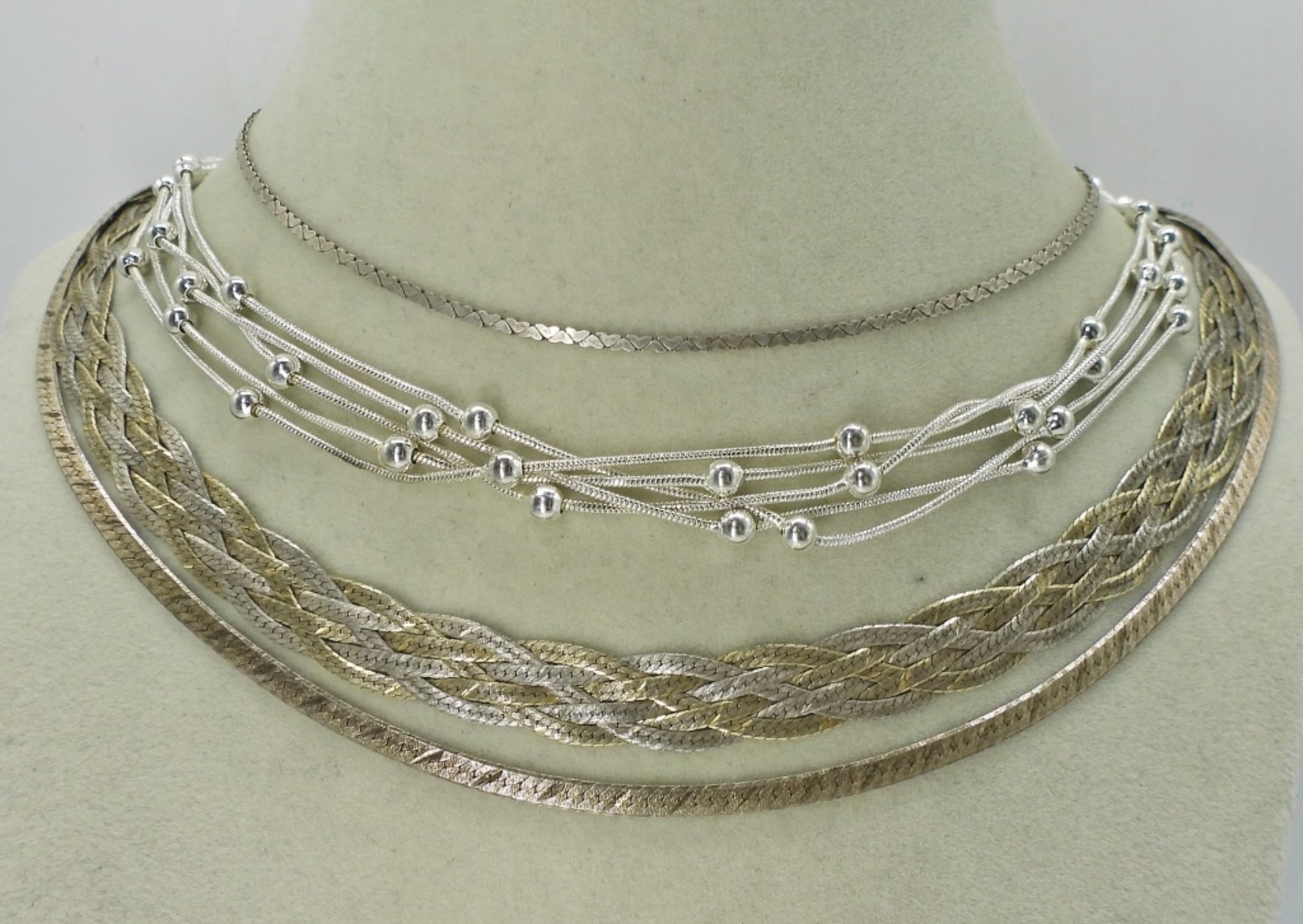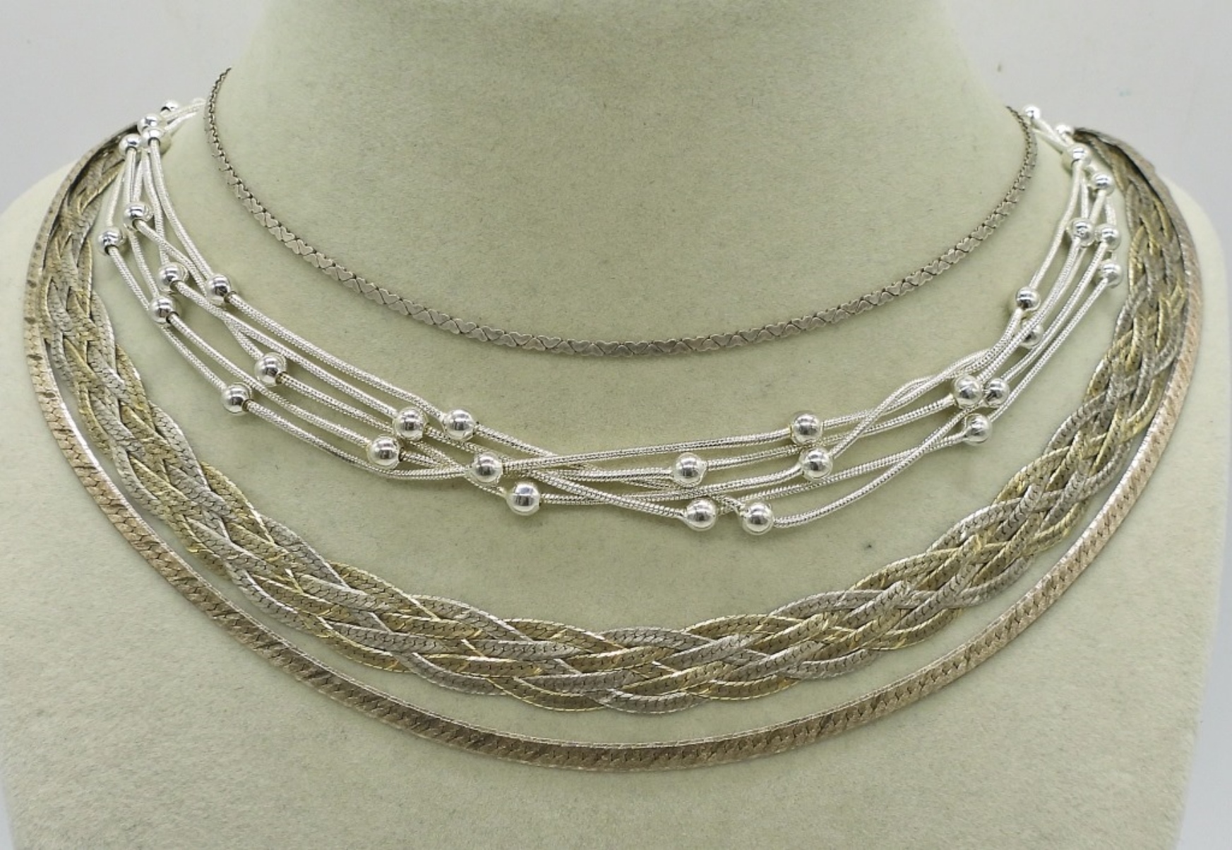 FOUR STERLING 18″ CHAINS IN VARIOUS STYLES. 34.7 DWT