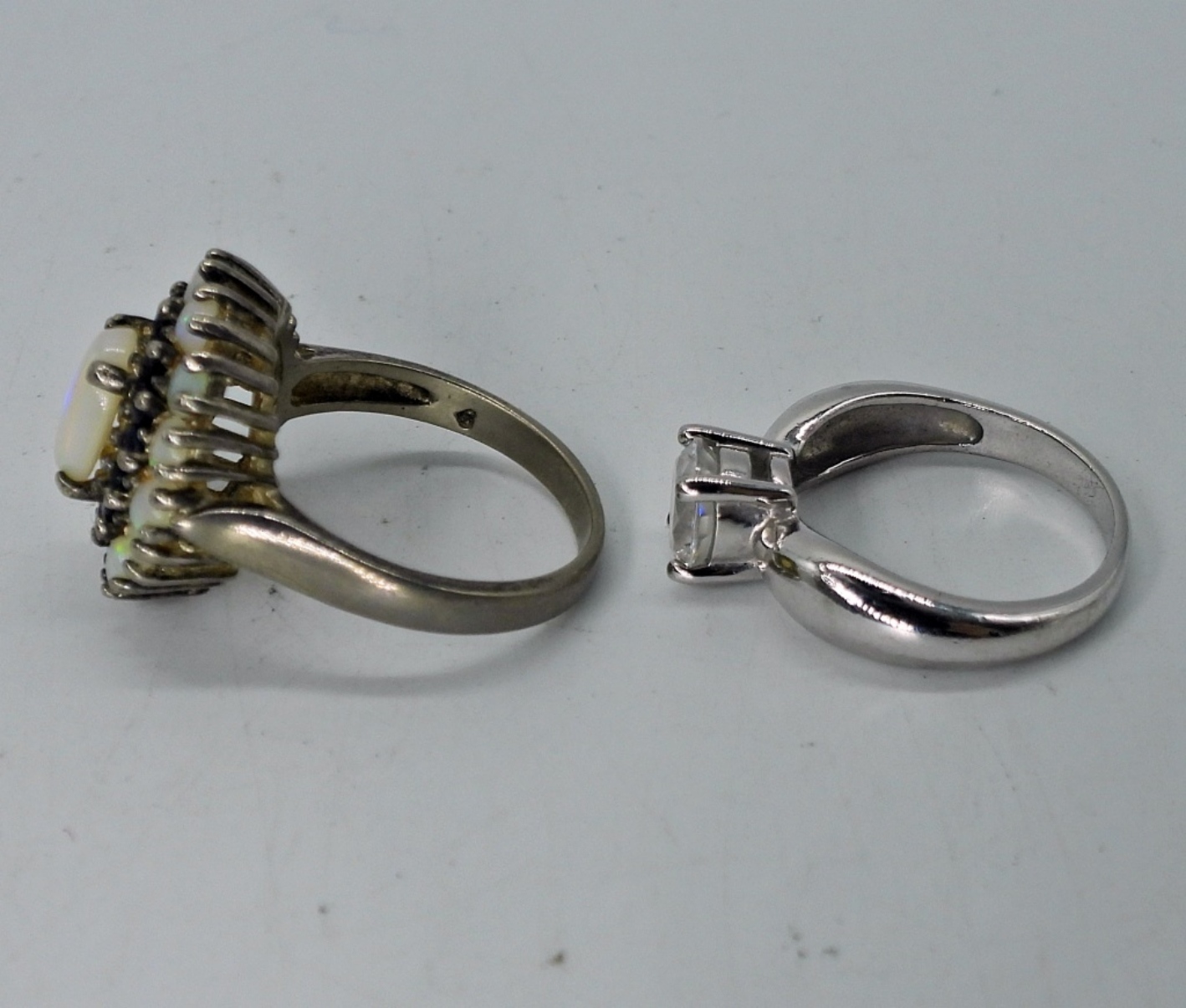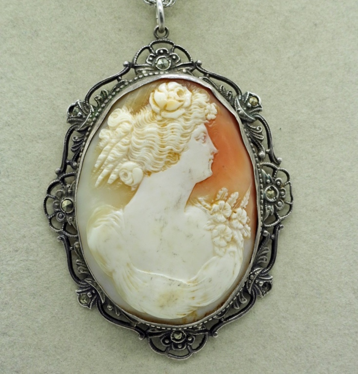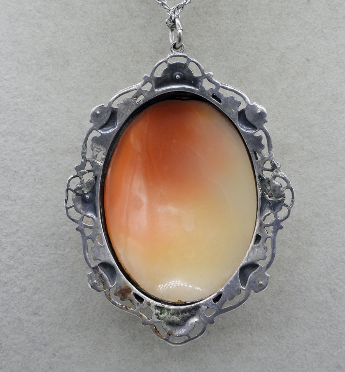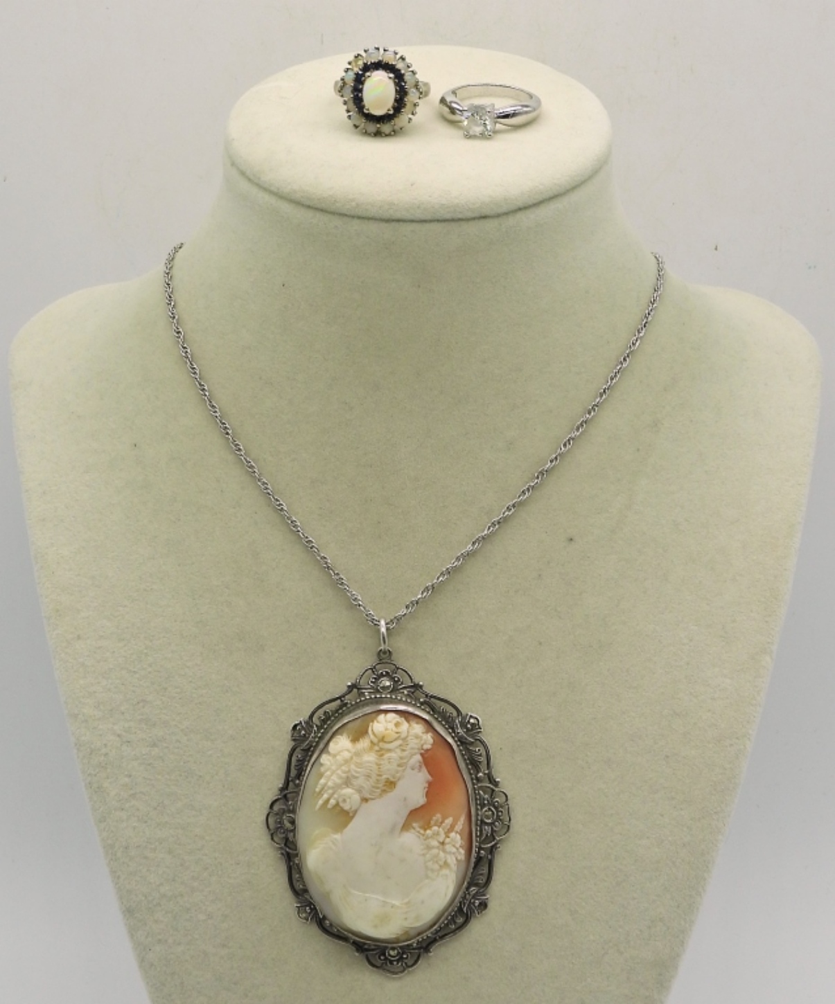 VERY DETAILED STERLING CAMEO NECKLACE (CAMEO 2.5″, CHAIN 24″). TWO STERLING GEMSTONE RINGS, SIZES 5 & 6. 21.2 DWT