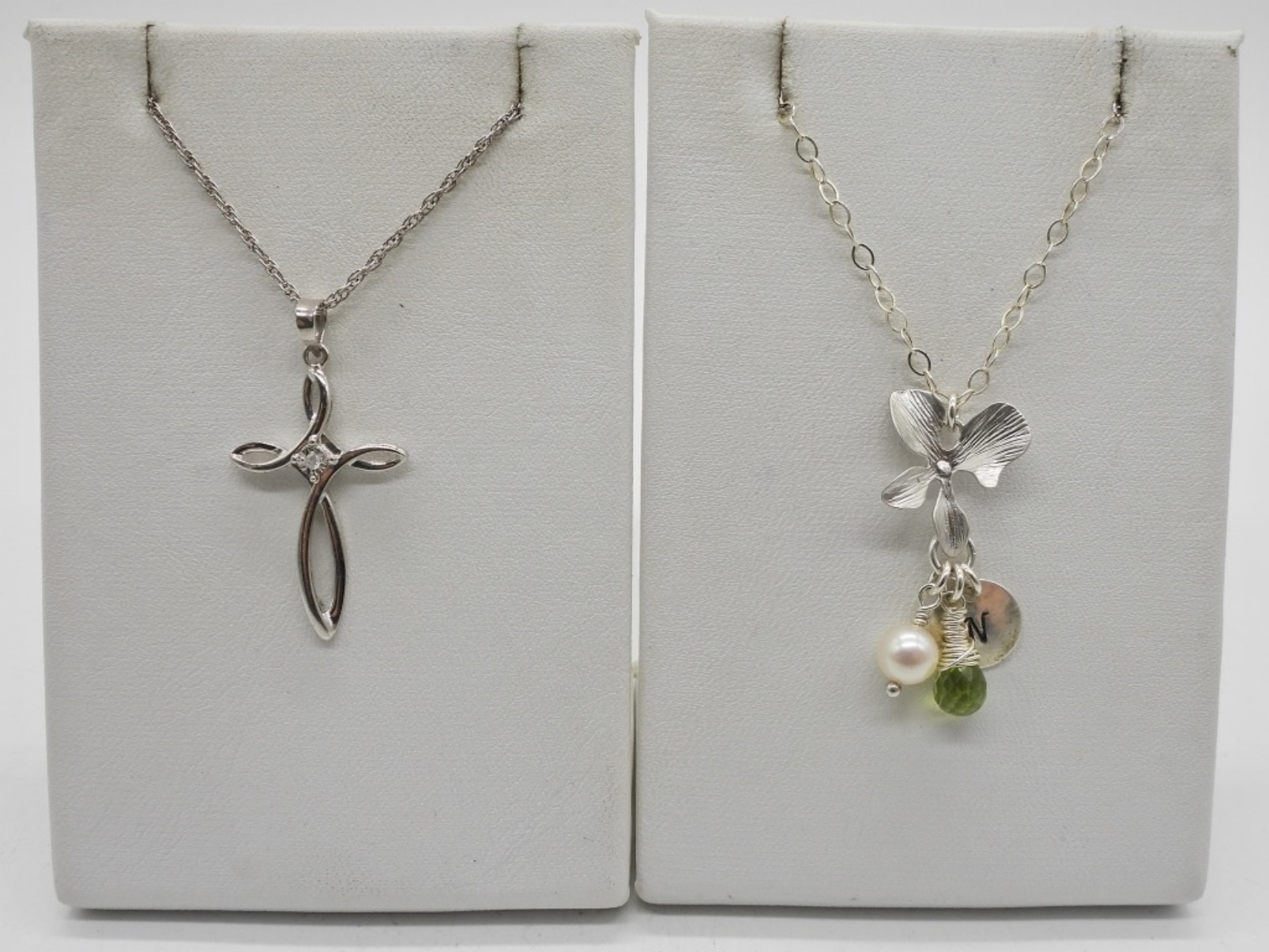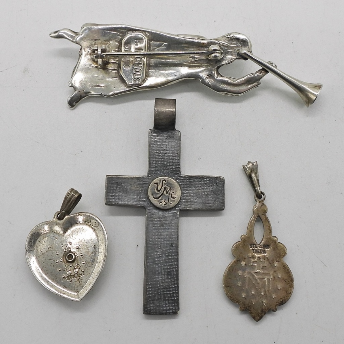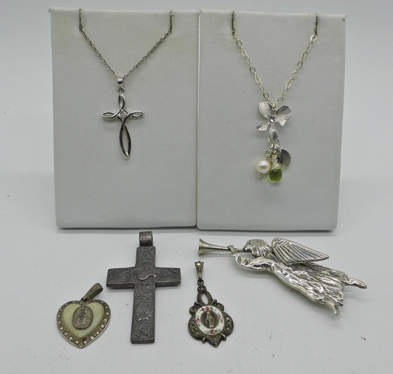 TWO STERLING NECKLACES, 18 & 19″. THREE CHRISTIAN PENDANTS AND AN ANGEL PIN. 24 DWT
