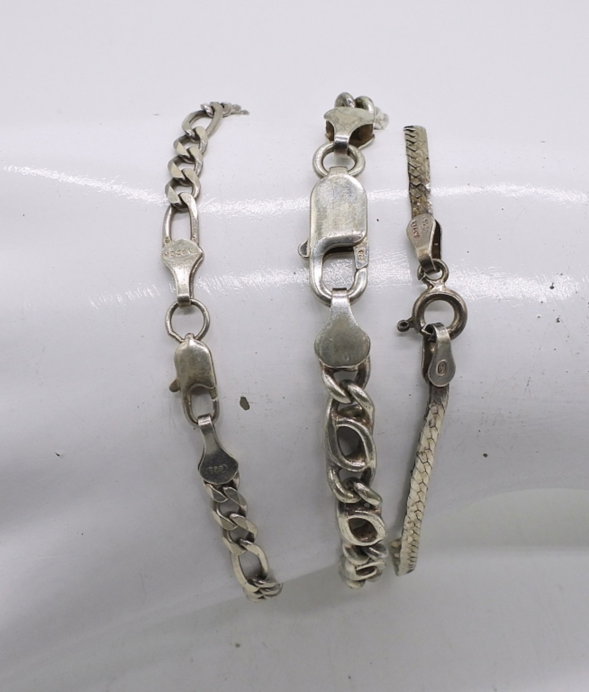 STERLING WEAVE NECKLACE & EARRINGS (PIERCED), MARKED MEXICO 925. CHAIN IS 18″. 3 STERLING BRACELETS, 7″. 22.7 DWT