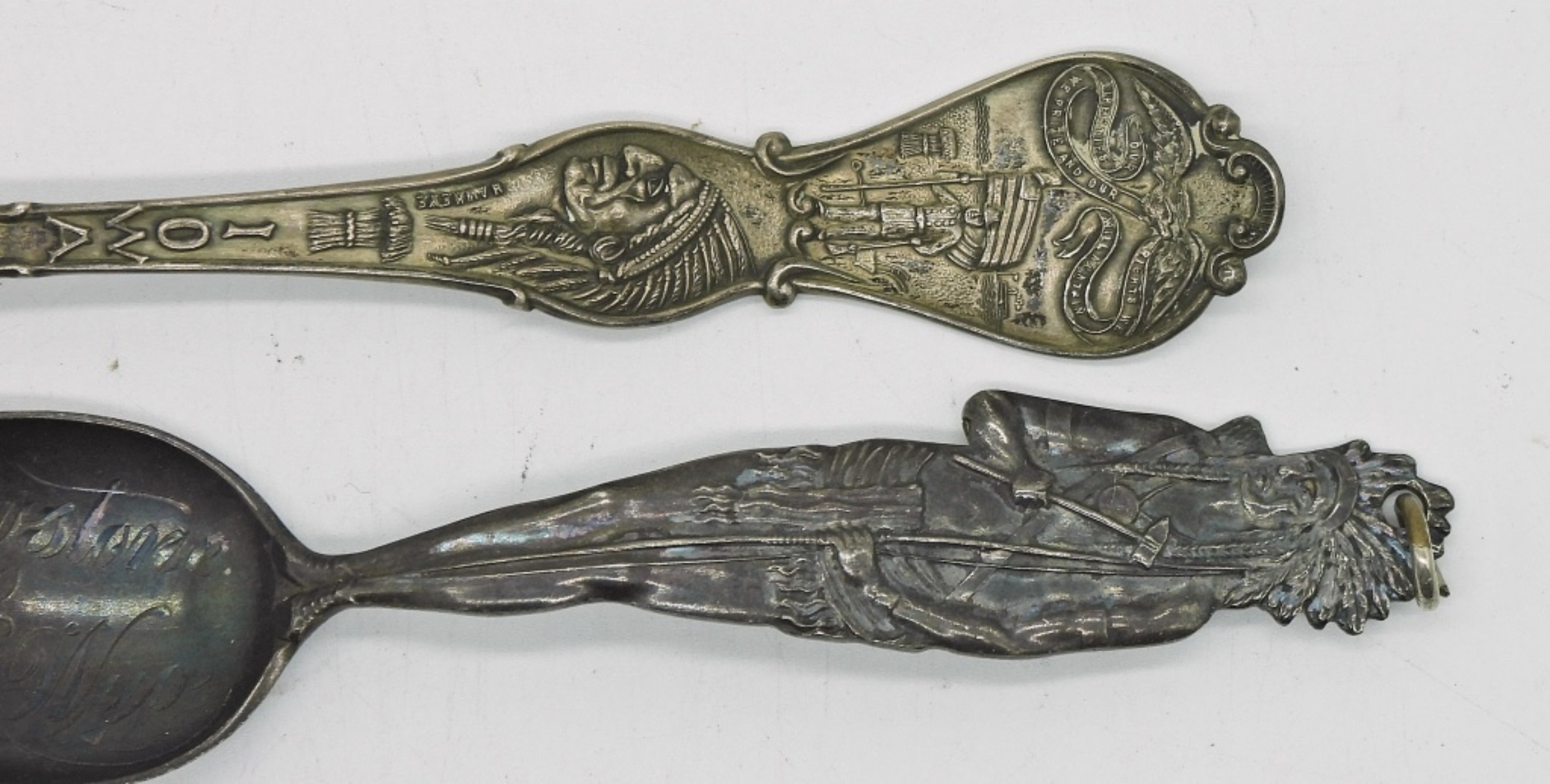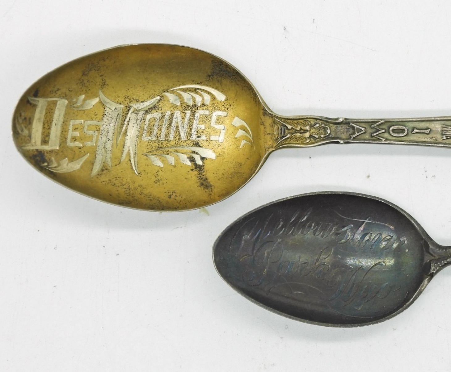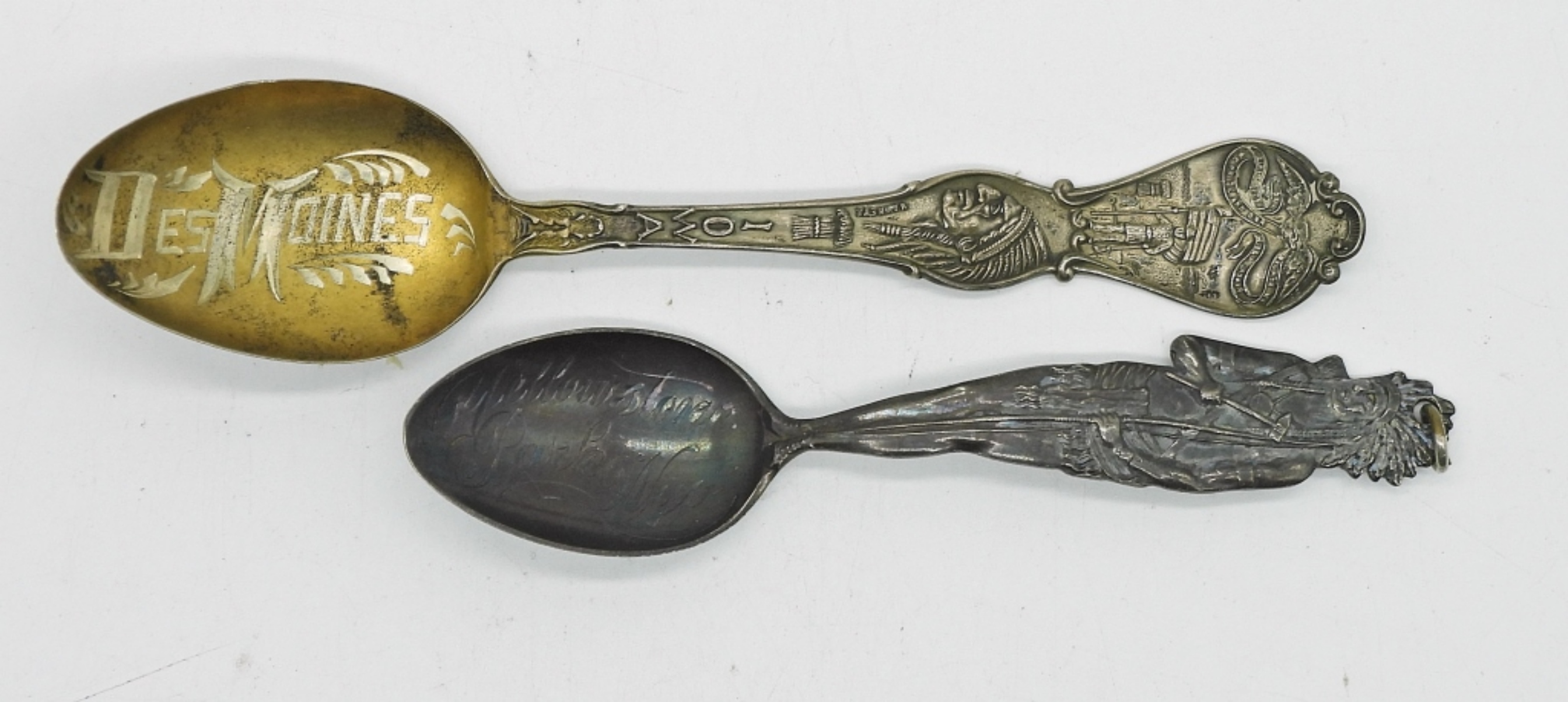 TWO STERLING DECORATIVE SPPONS. DES MOINES & YELLOWSTONE. 18.8 DWT