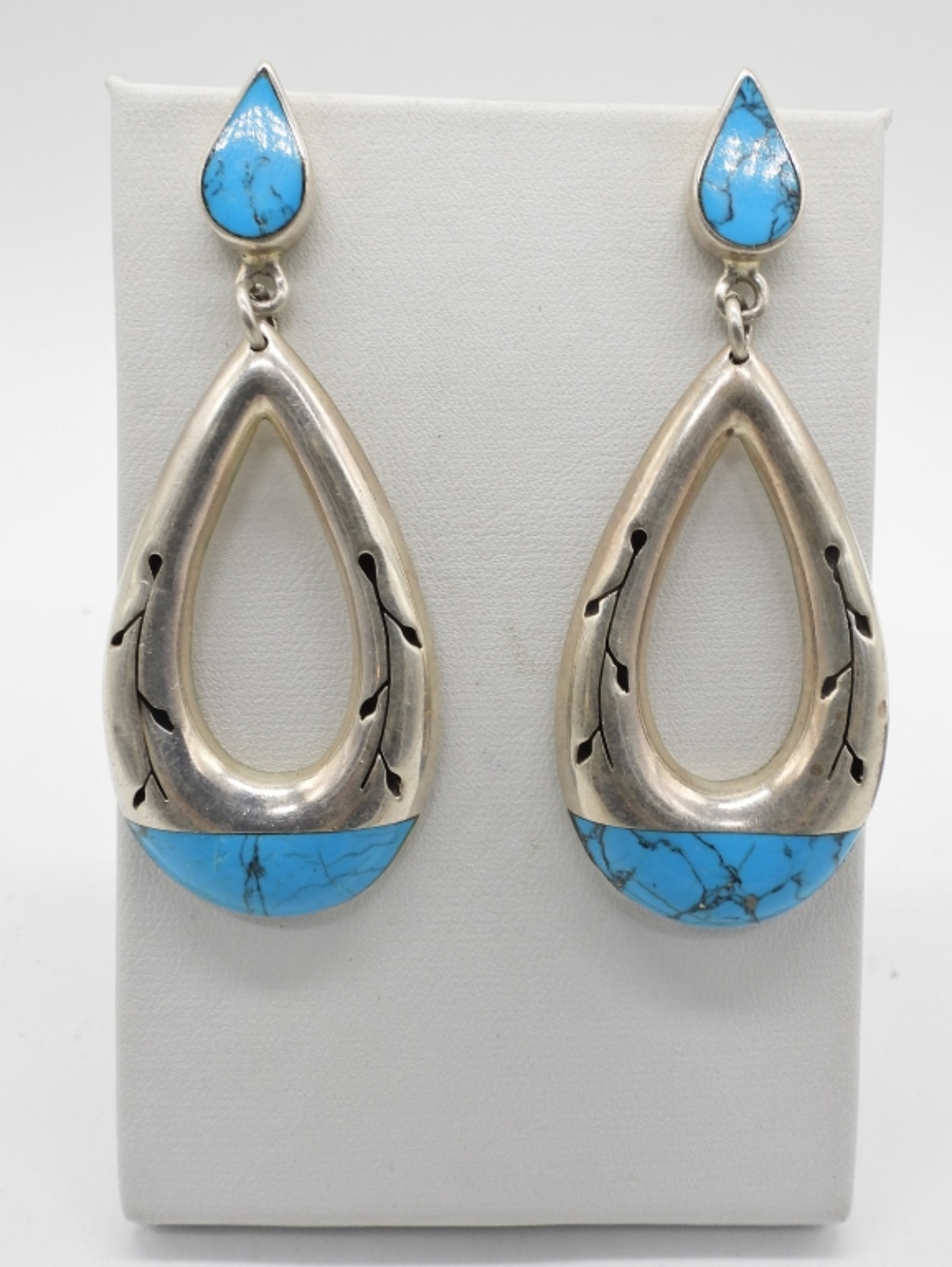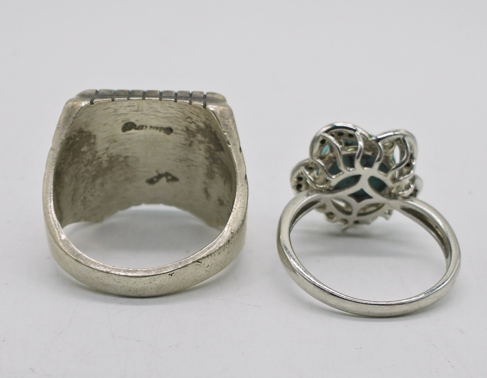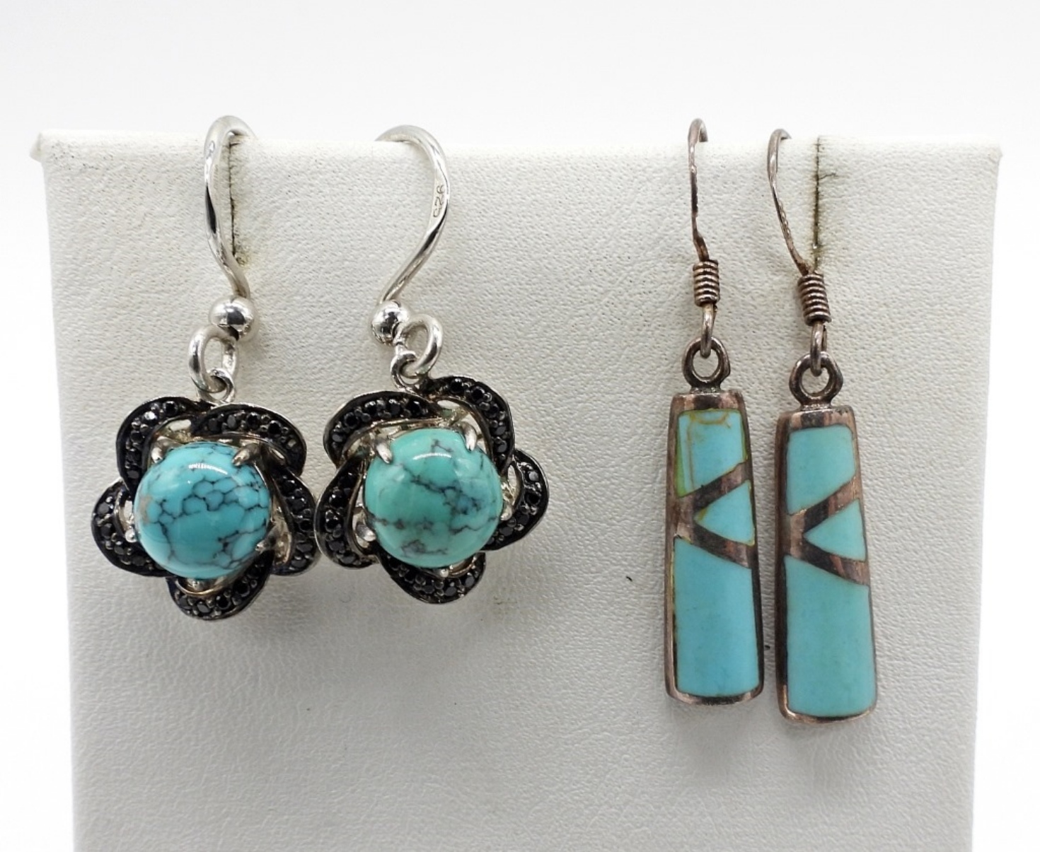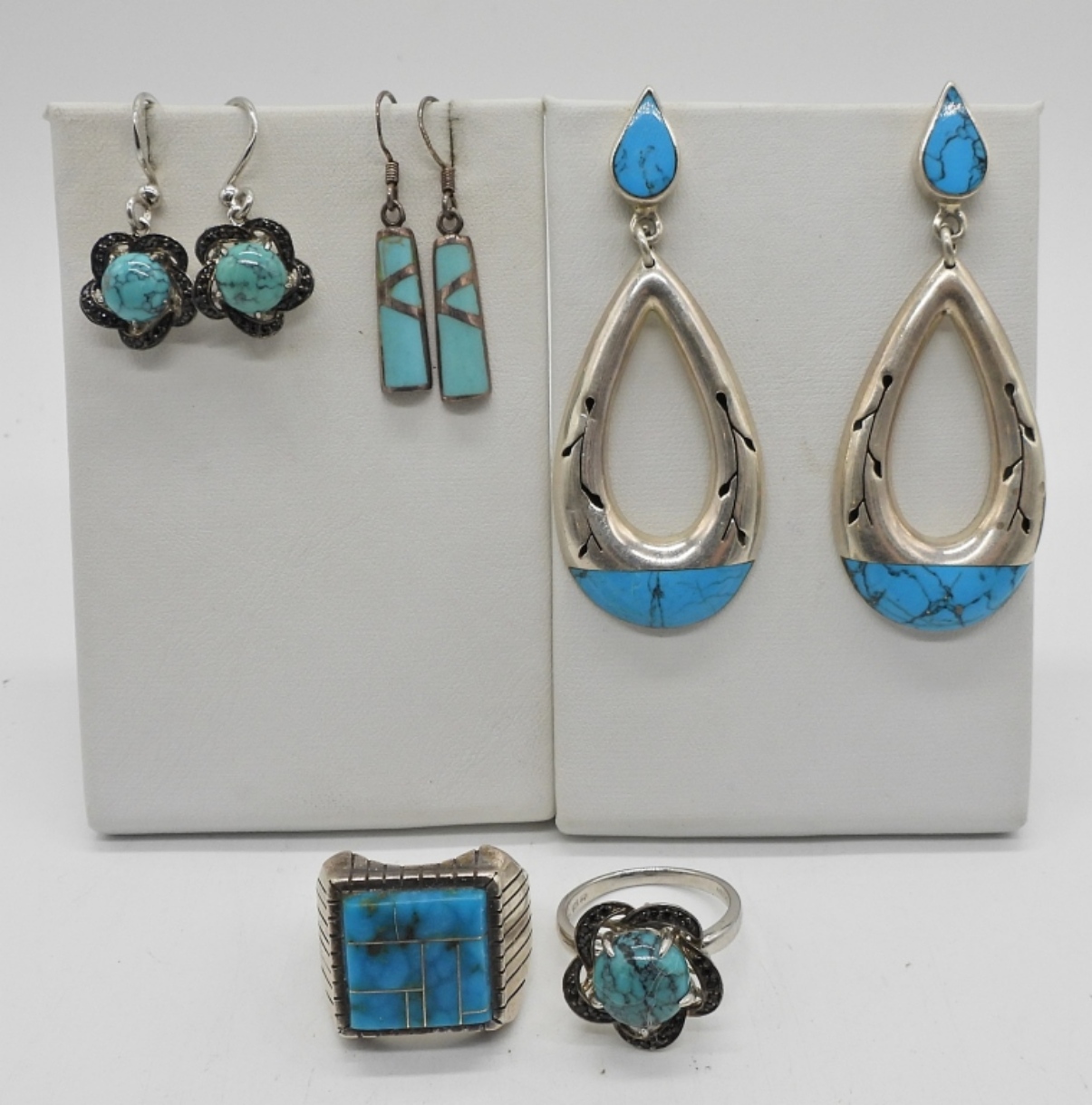 THREE PAIR OF STERLING EARRINGS WITH TURQUOISE-LIKE GEMSTONES, ALL PIERCED. TWO STERLING RINGS, SIZES 8 & 10. 28.8 DWT