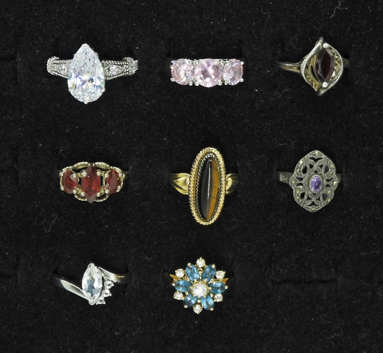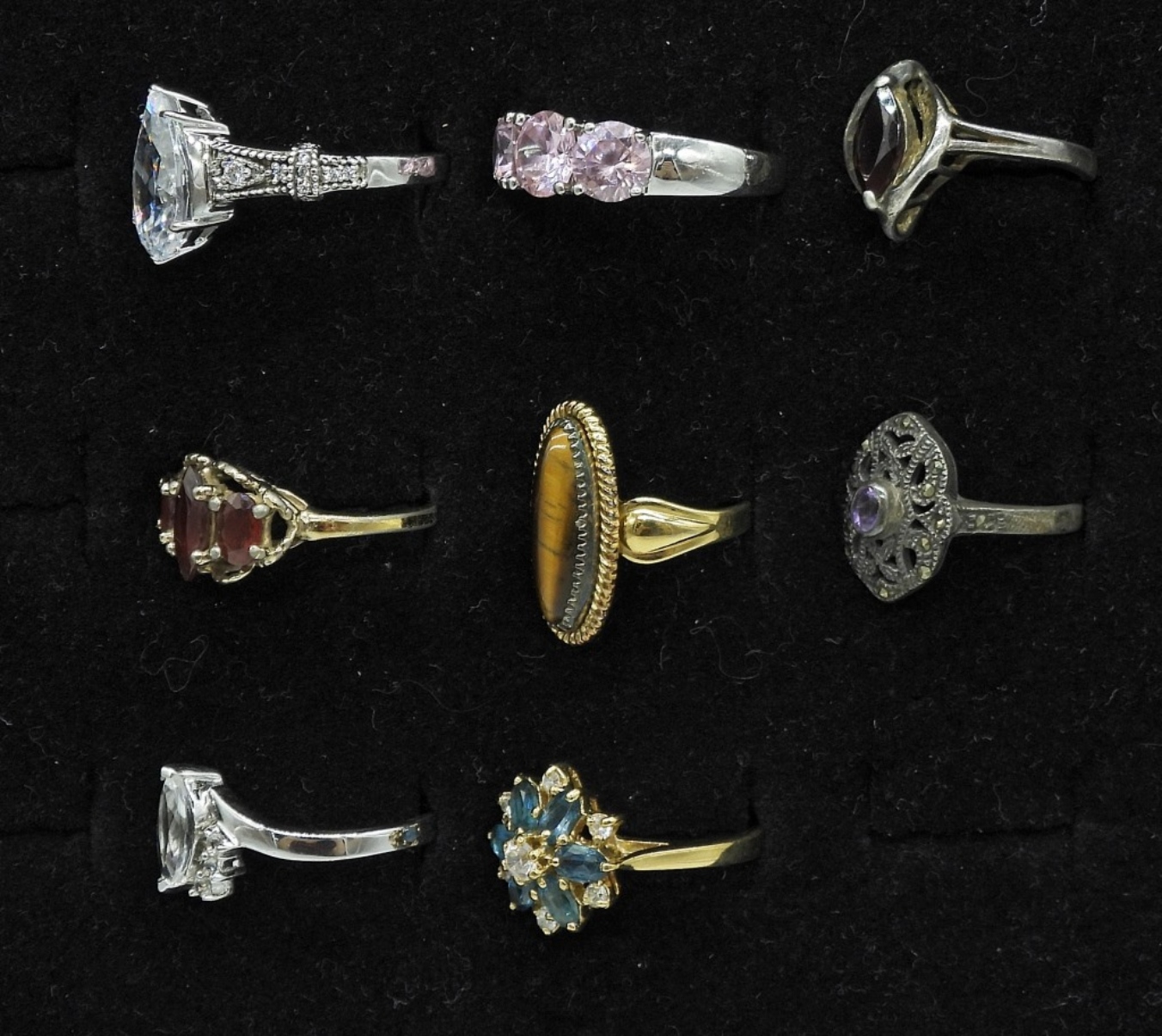 EIGHT STERLING GEMSTONE FASHION RINGS, SIZES 6-10. A FEW RINGS ARE MISSHAPEN. 20.3 DWT