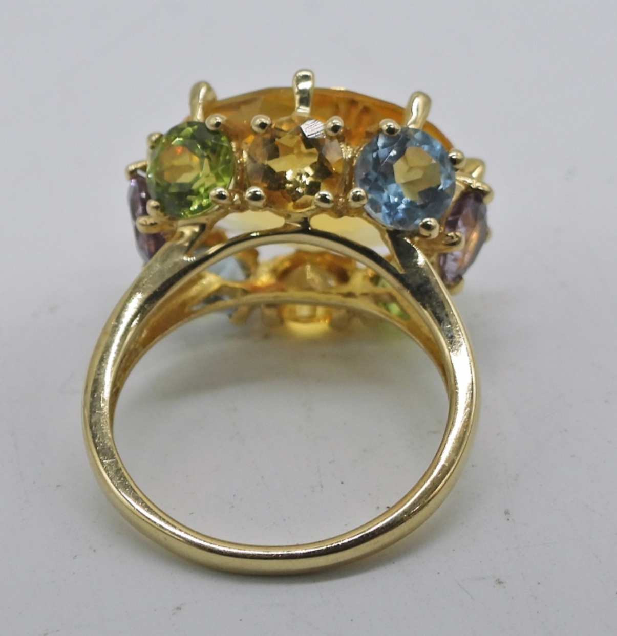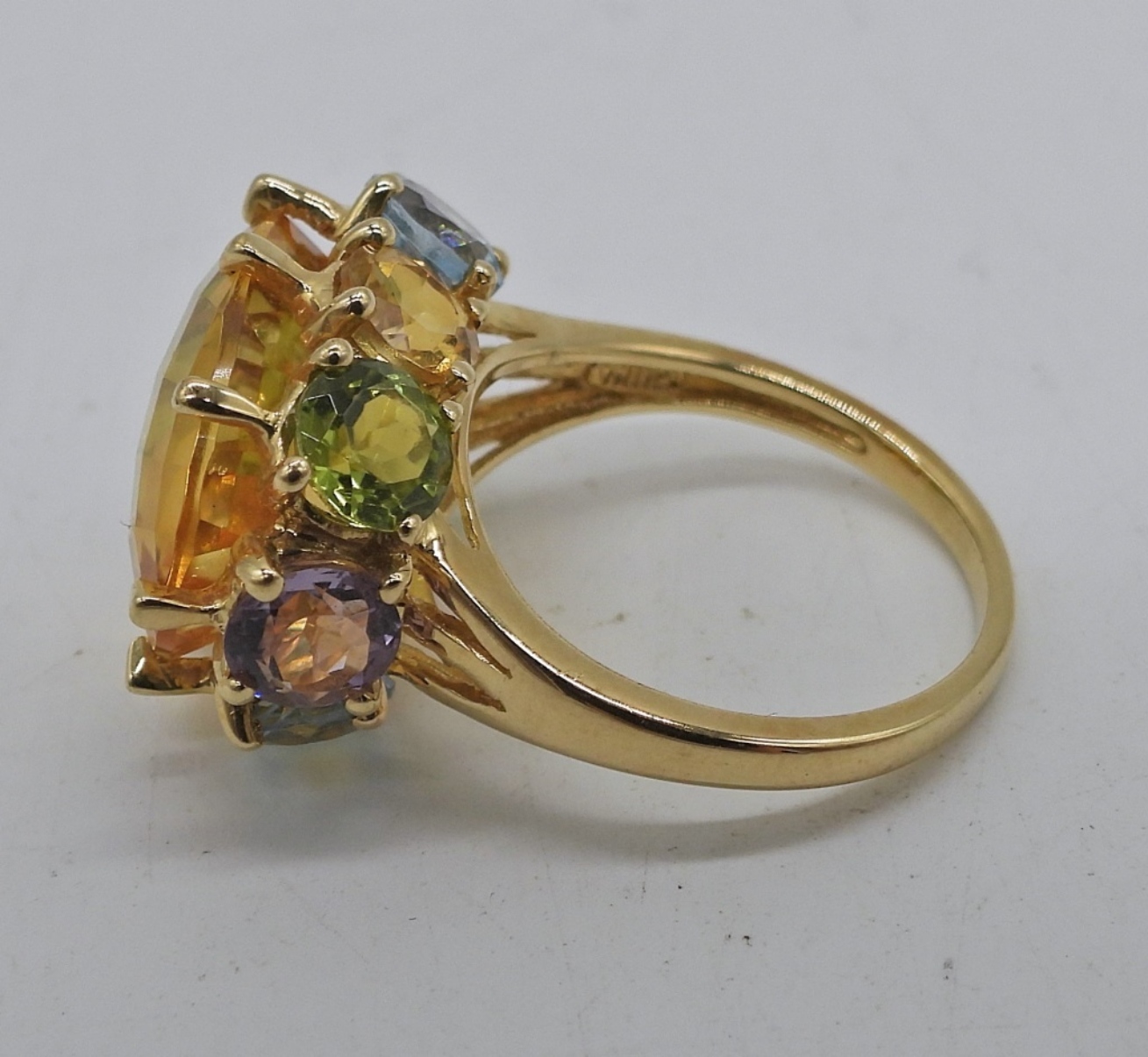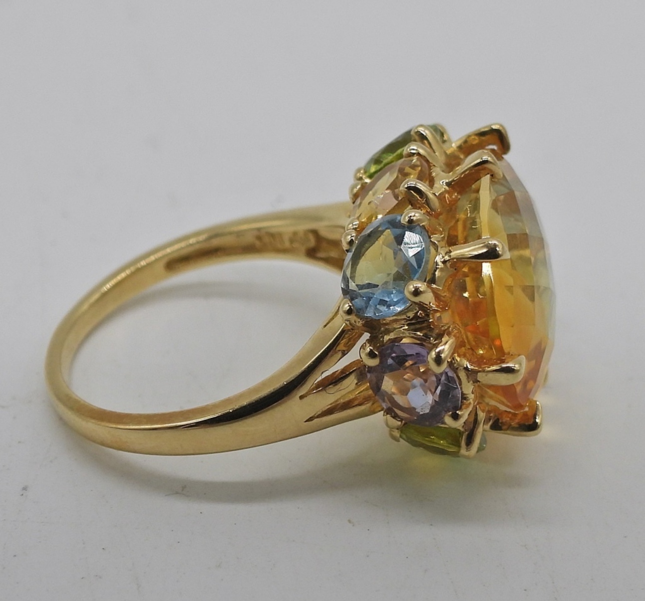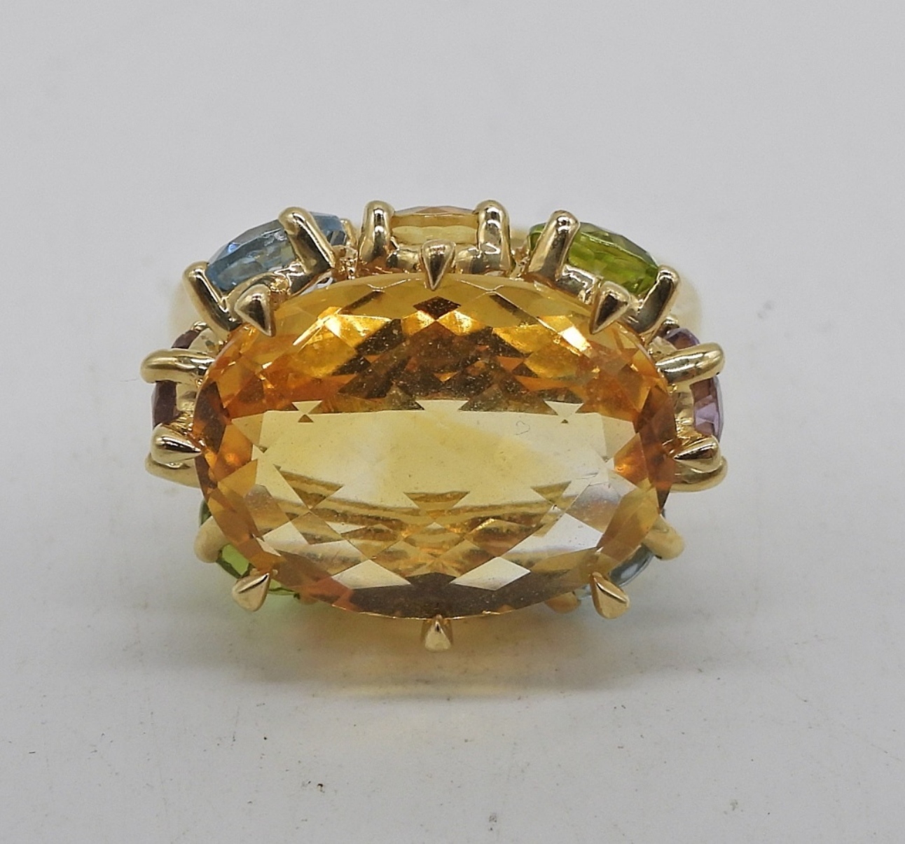 10K YELLOW GOLD, SIZE 6 RING WITH LARGE CITRINE GEMSTONE WITH ACCENT STONES (PERIDOT, BLUE TOPAZ, AMETHYST & MORE CITRINE). 2.5 DWT