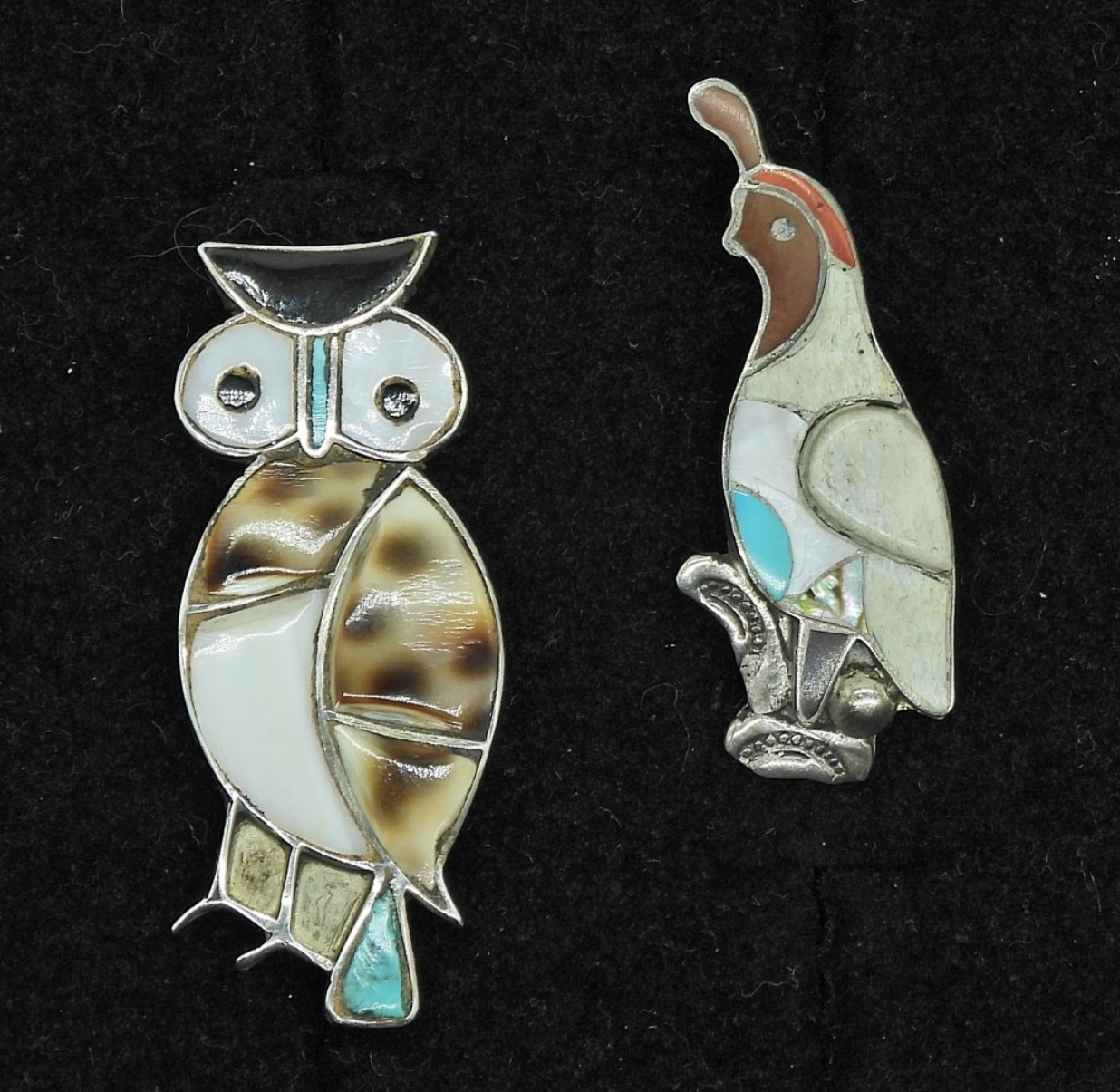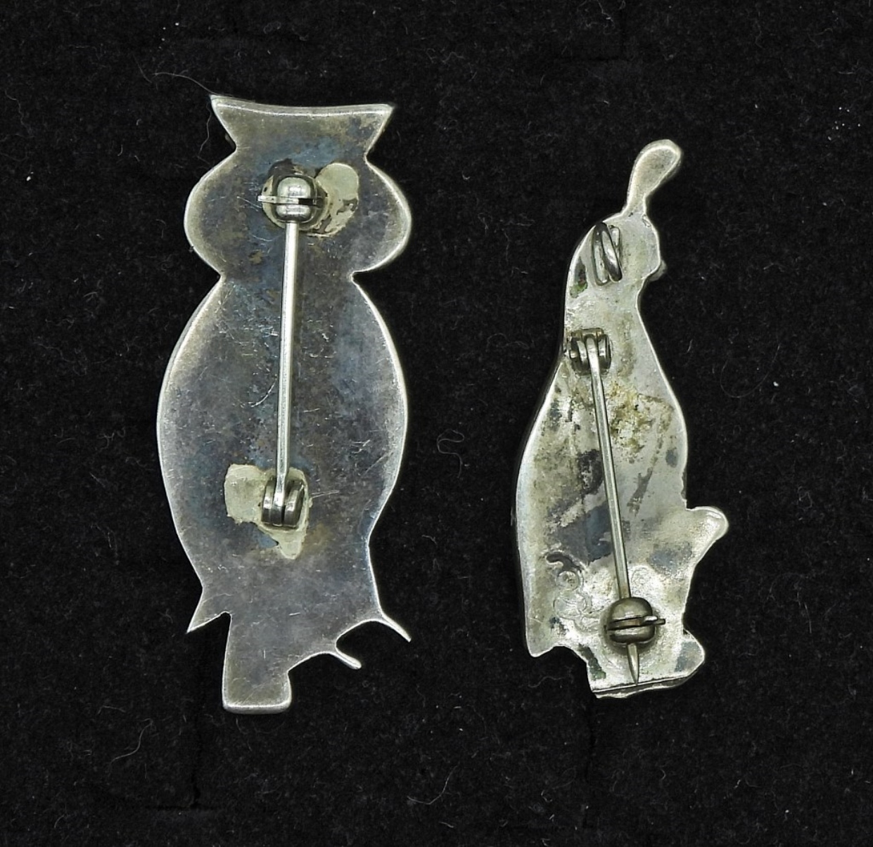 TWO VINTAGE ZUNI PINS. THEY HAVE BEEN TESTED AND COME BACK AS 40% & 60% STERLING SILVER. THEY ARE NOT MARKED! 1.5-2″. 5.3 DWT