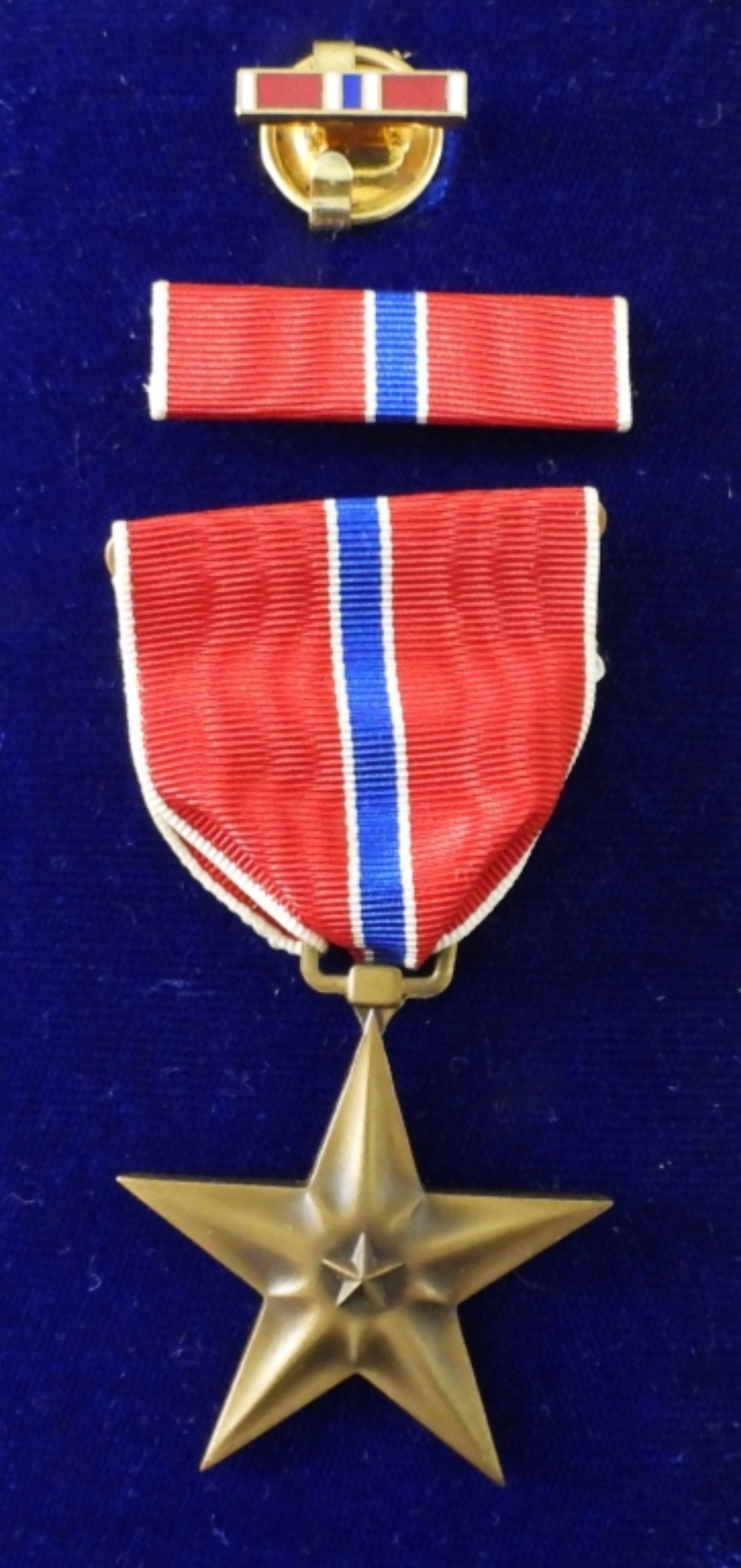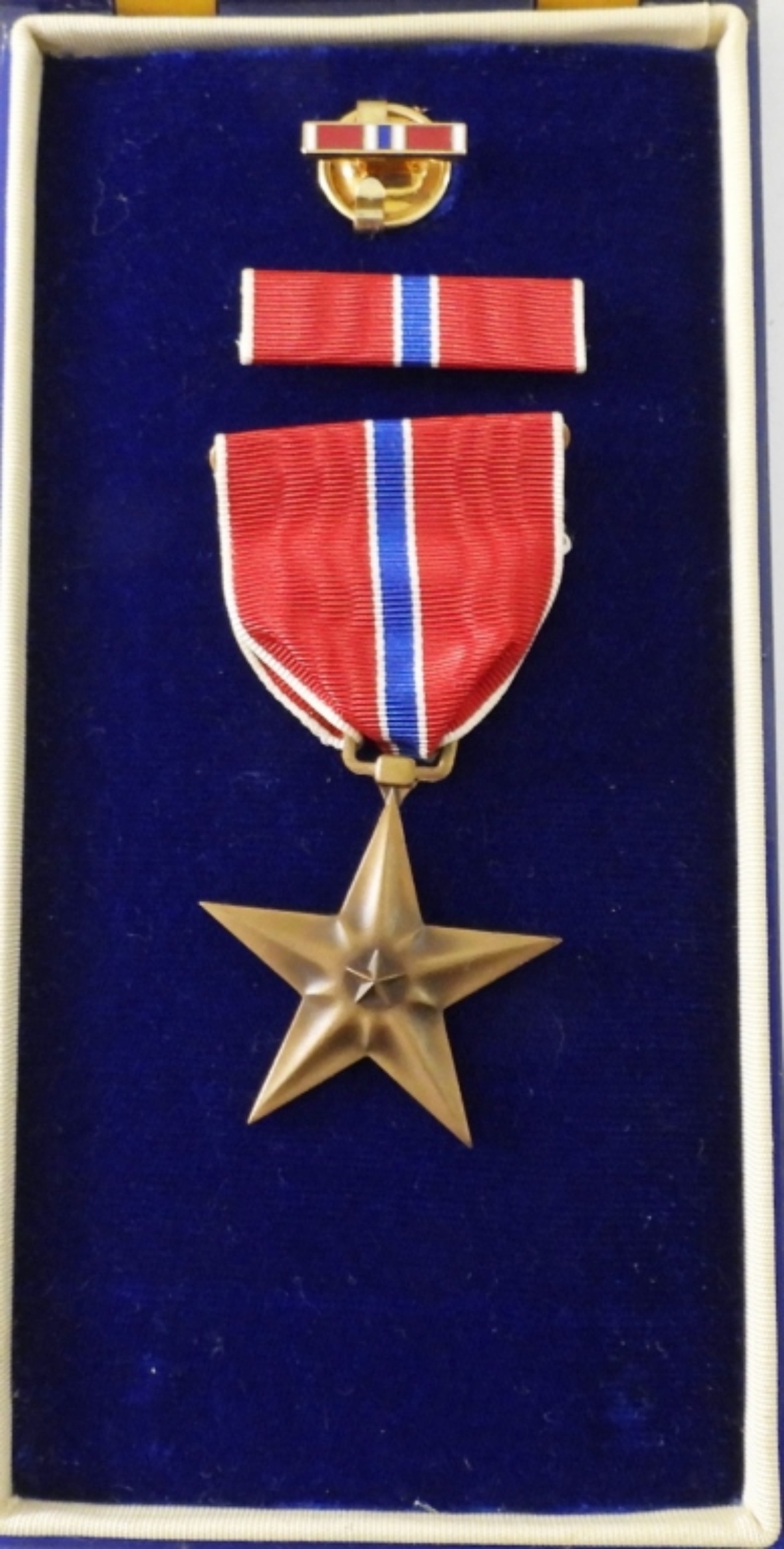 WWII US BRONZE STAR MEDAL ,LAPEL PIN AND COFFIN BOX