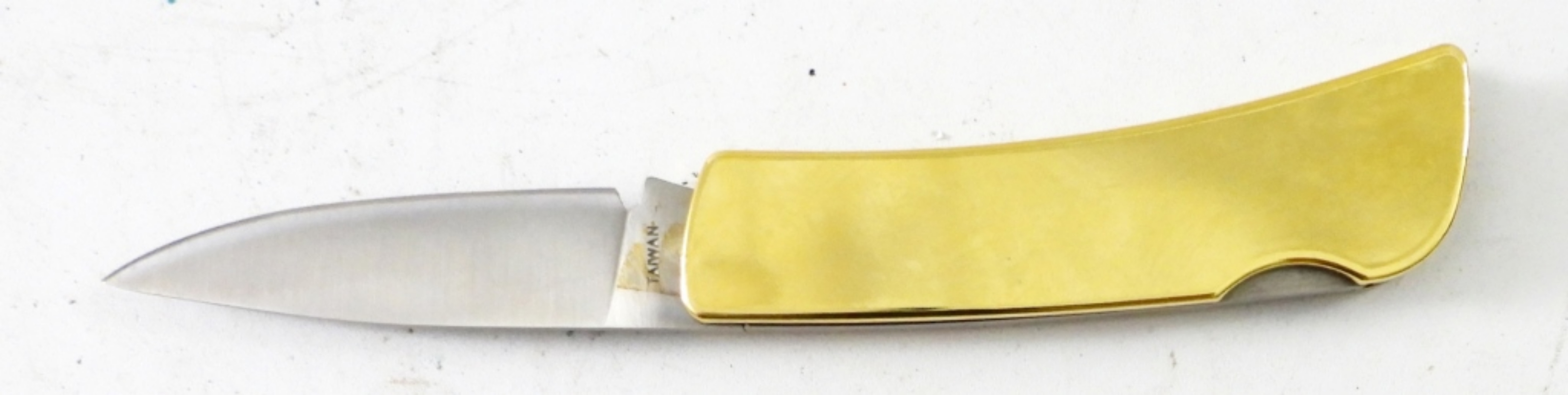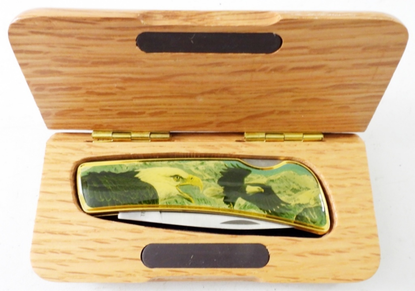 VINTAGE VANADIUM POCKET KNIFE WITH WOODEN CASE. GOLD TONE WITH BALD EAGLE STAINLESS STEEL