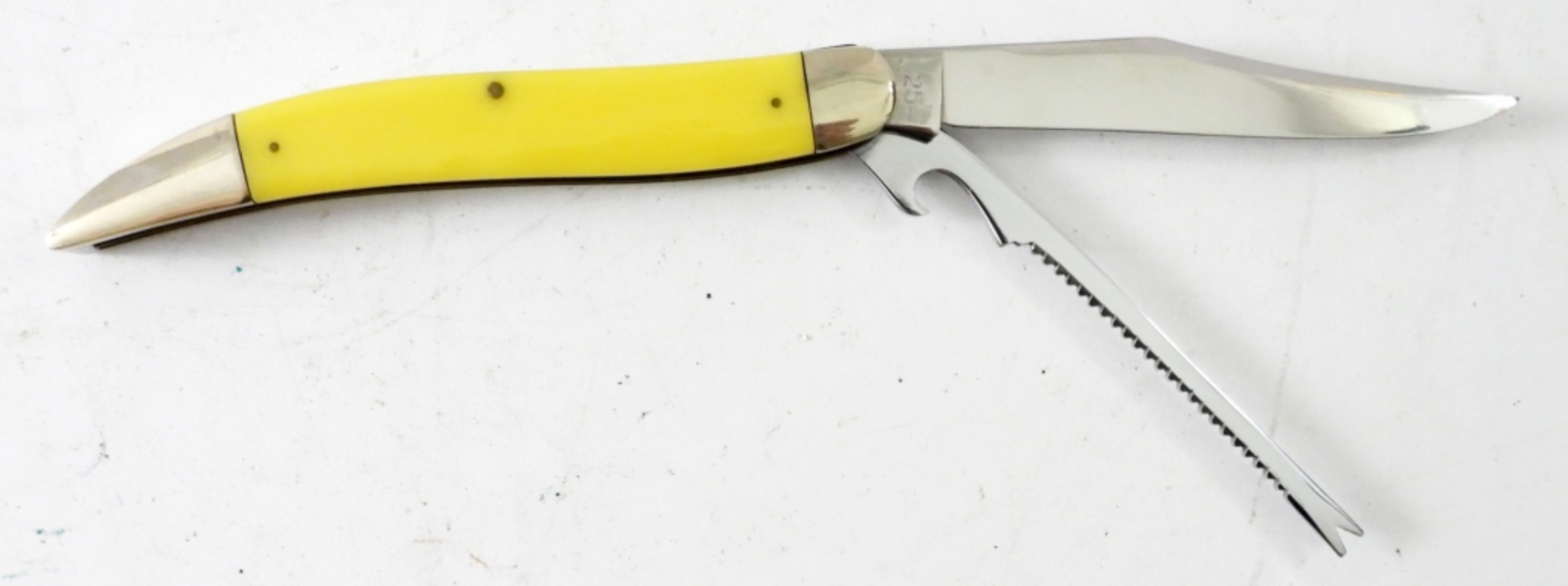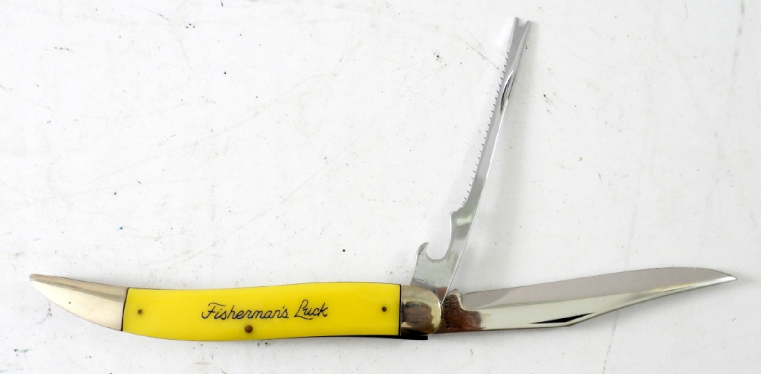 VINTAGE CAMILLUS FISHERMAN’S LUCK POCKET KNIFE, HOOK REMOVER( 9″ KNIFE, 4: BLADE ) YELLOW HANDLE