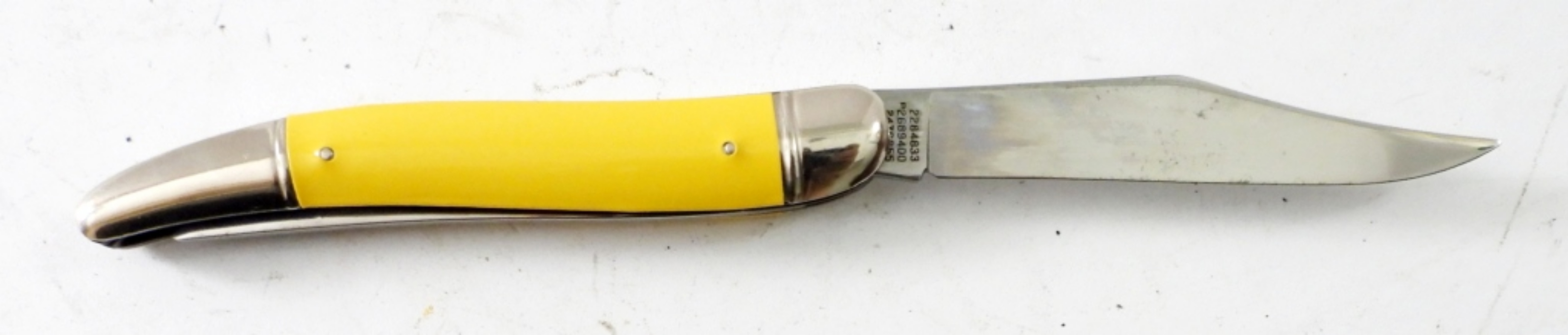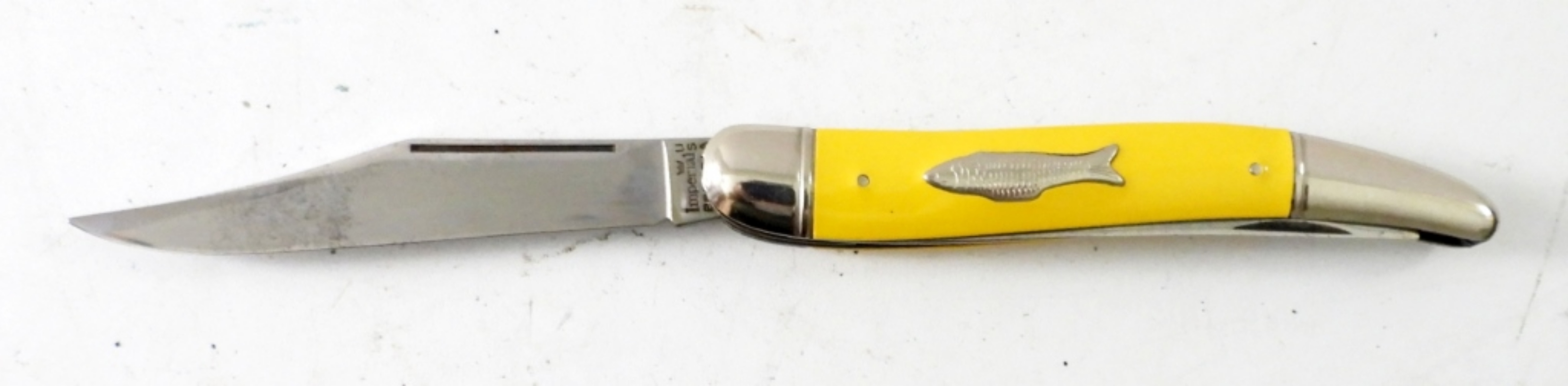 VINTAGE IMERIAL PROV RI USA FISHING KNIFE YELLOW HANDLE WITH FISH ON IT .3 1/2 ” BLADE WOTH A HOOK REMOVER