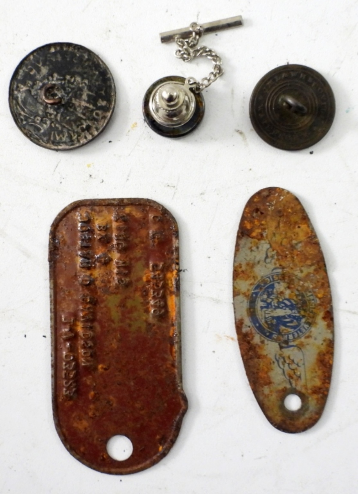 ANCIENT COIN BUTTON, METAL DOG TAGS & VETERANS SERVICE METAL TAG plus MEXICO COIN TIE PIN
