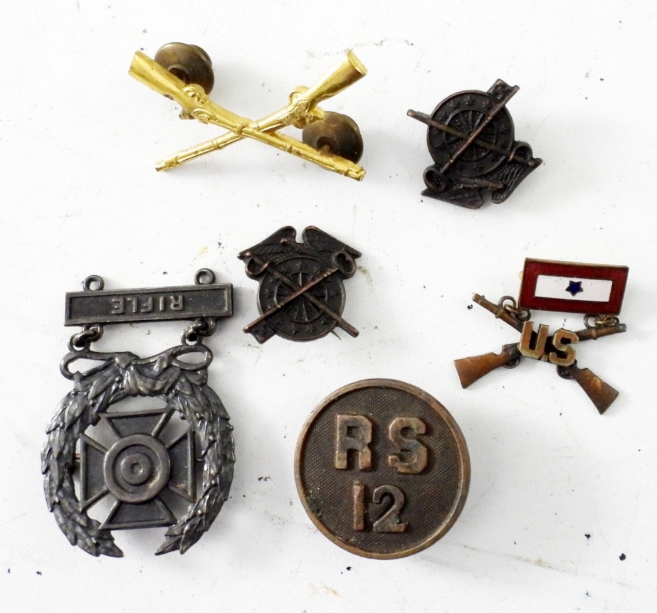 INFANTRY SWEETHEART PIN, plus (3) CROSS RIFLE PINS (1) SHARPSHOOTER RIFLE & RS 12 SCREWBACK PIN
