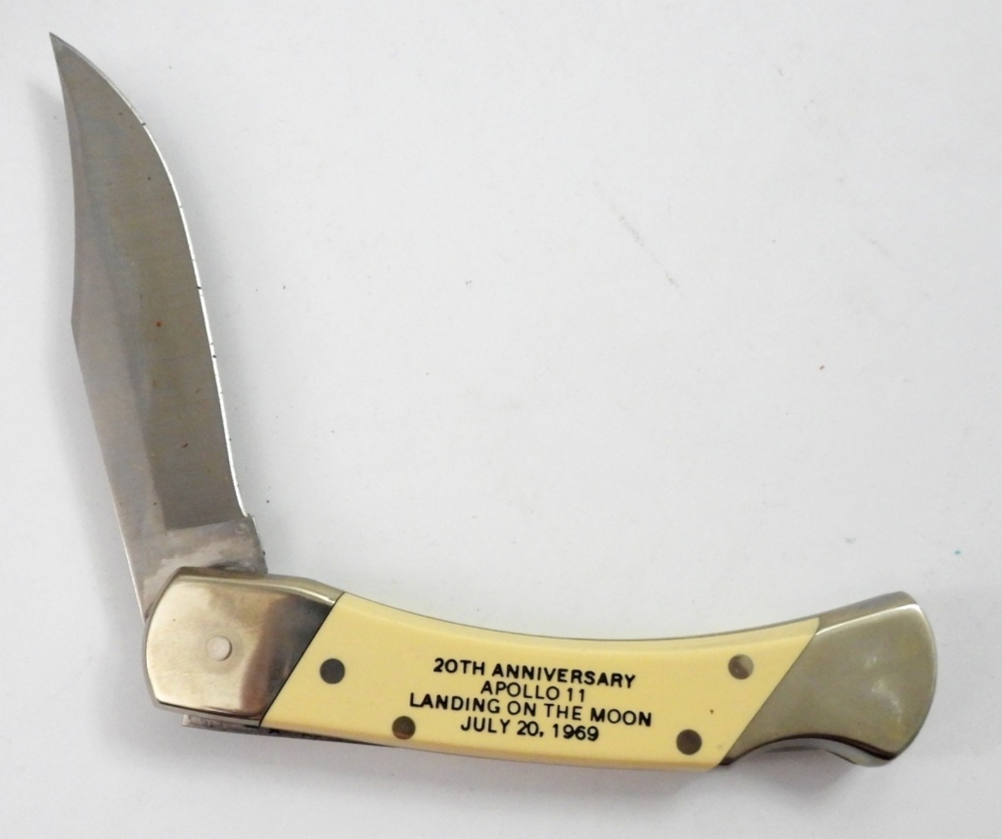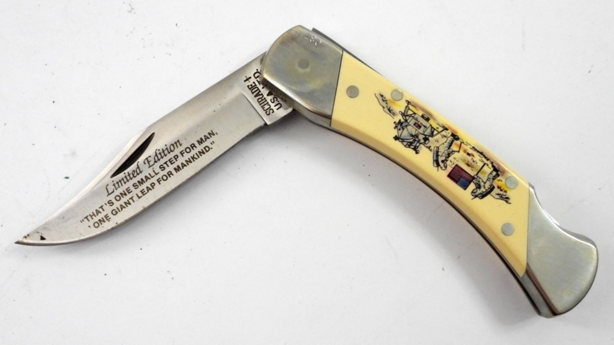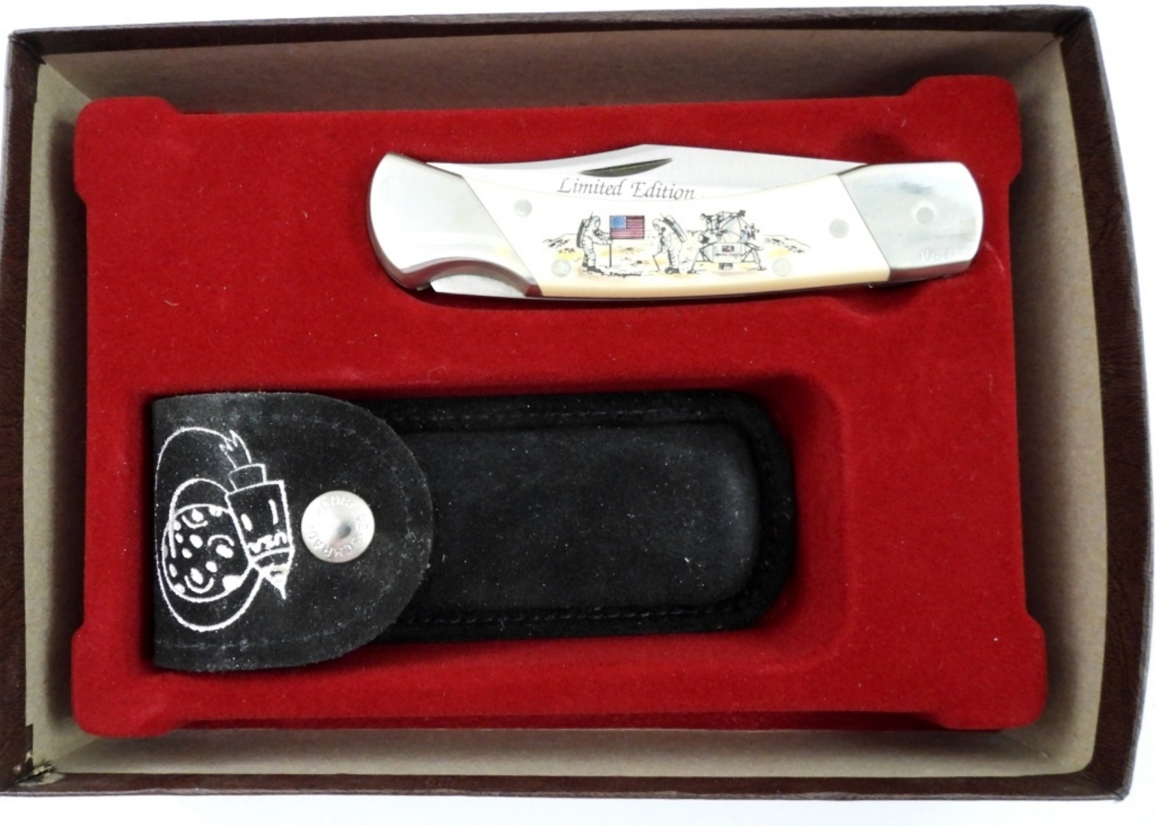 SCHRADE LTD THE EAGLE HAS LANDED BOX SET COMMEMORATIVE SCRIMSHAW SINGLE BLADE KNIFE AND LEATHER CASE. CIRCA 1989.