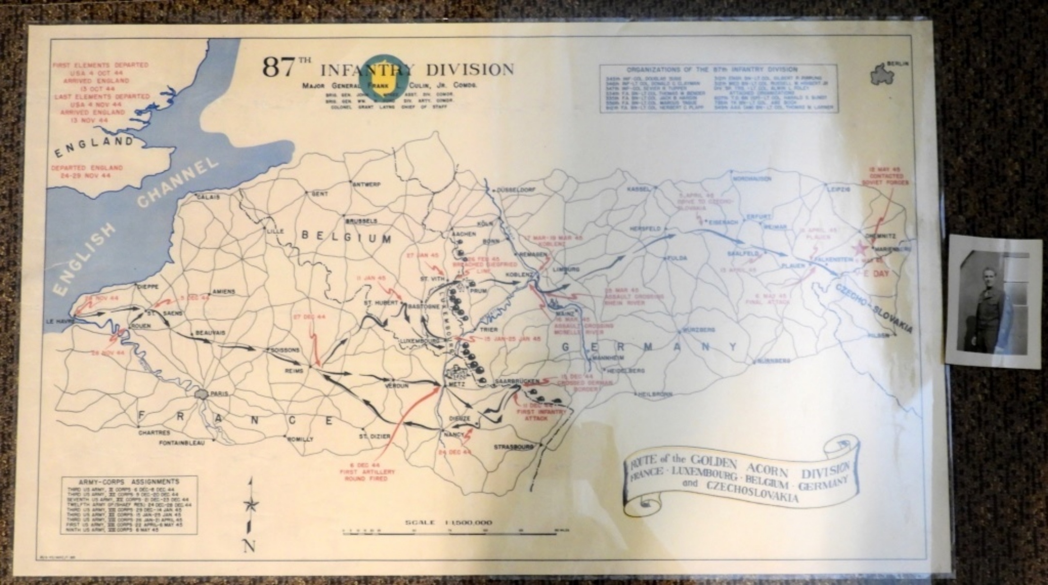 1944-45 US WWII 87 INFANTRY DIVISION BATTLE OPERATIONS MAP. ROUTE OF GOLDEN ACORN (LAMINATED)