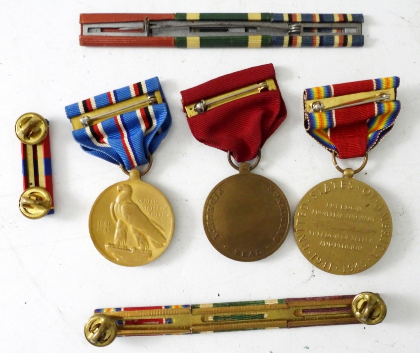 (6) VINTAGE WWII ERA US MILITARY RIBBONS, BARS& MEDALS. AMERICAN CAMPAIGN OLD SERVICE MEDAL, NAVY GOOD CONDUCT MEDAL, VICTORY MEDAL ,3 MILITARY RIBBON BARS