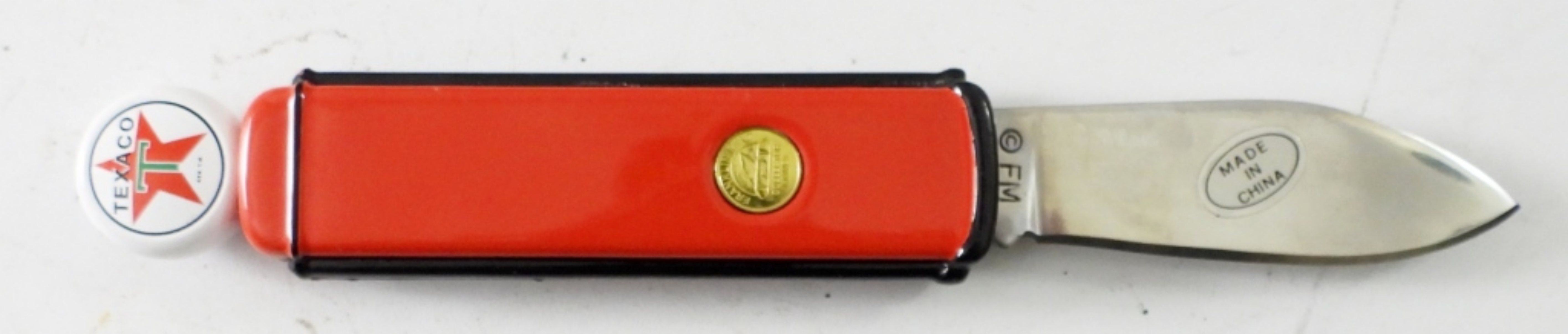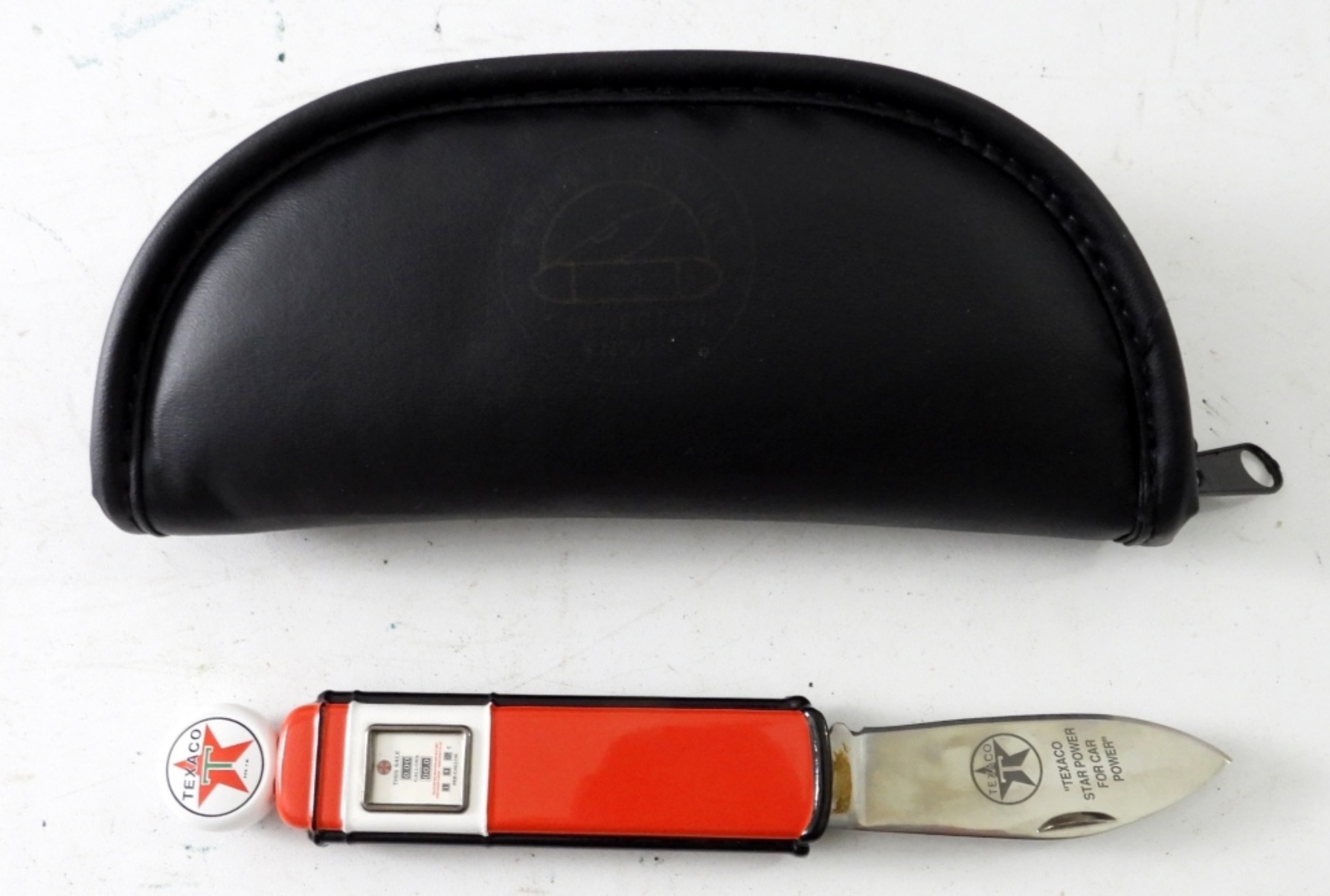 FRANKLIN MINT TEXICO RED GAS PUMP POCKET KNIFE , 7″ KNIFE w /2 1/2″ BLADE. STAR POWER FOR CAR POWER ENGRAVED ON BLADE. COLLECTORS KNIFE & POUCH