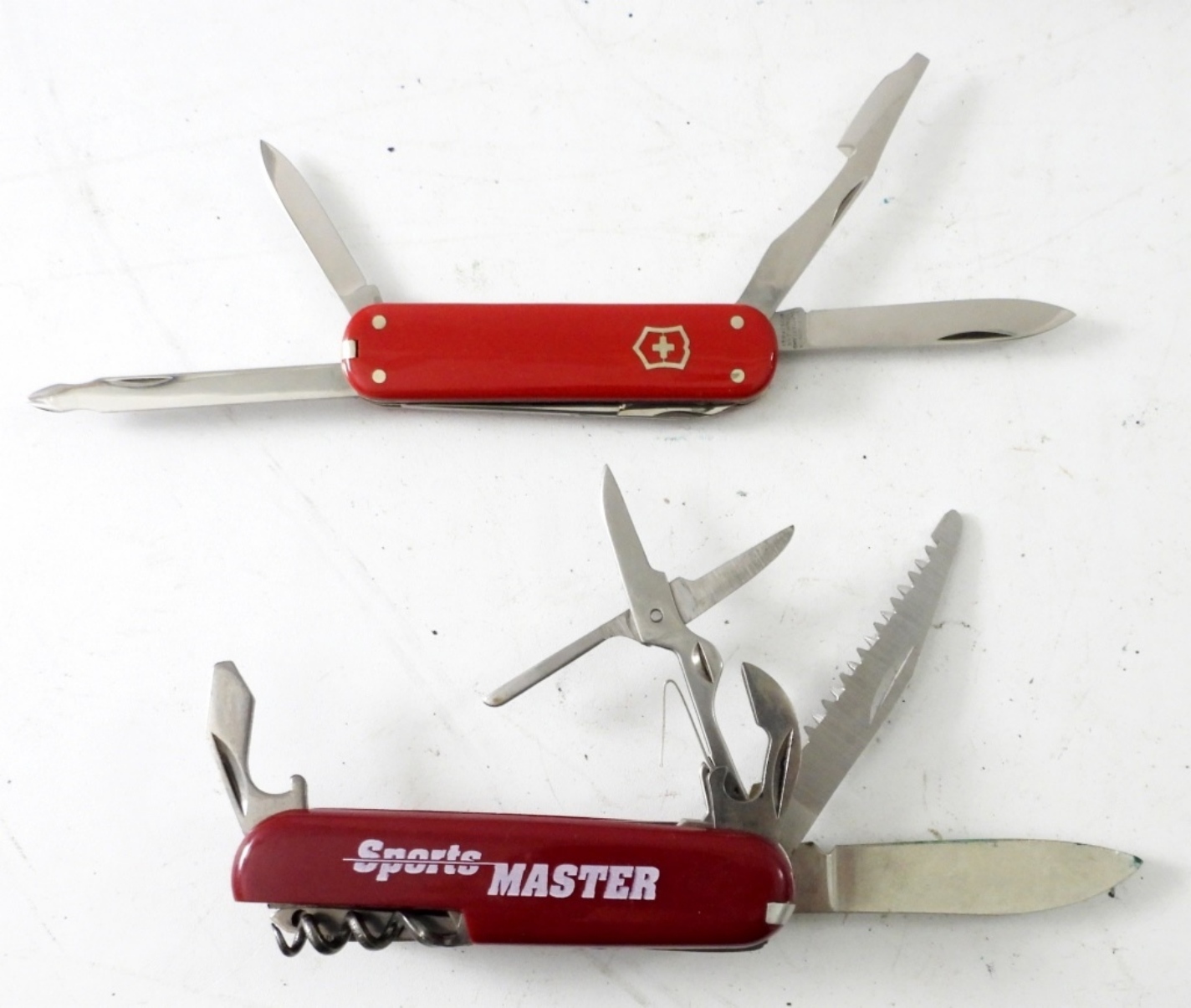 VICTORINOX SWISS ARMY KNIFE IN BOX 5″ WITH 2″ BLADE (RED), AND SPORTS MASTER 13 FUNCTION ALPINE ARMY KNIFE