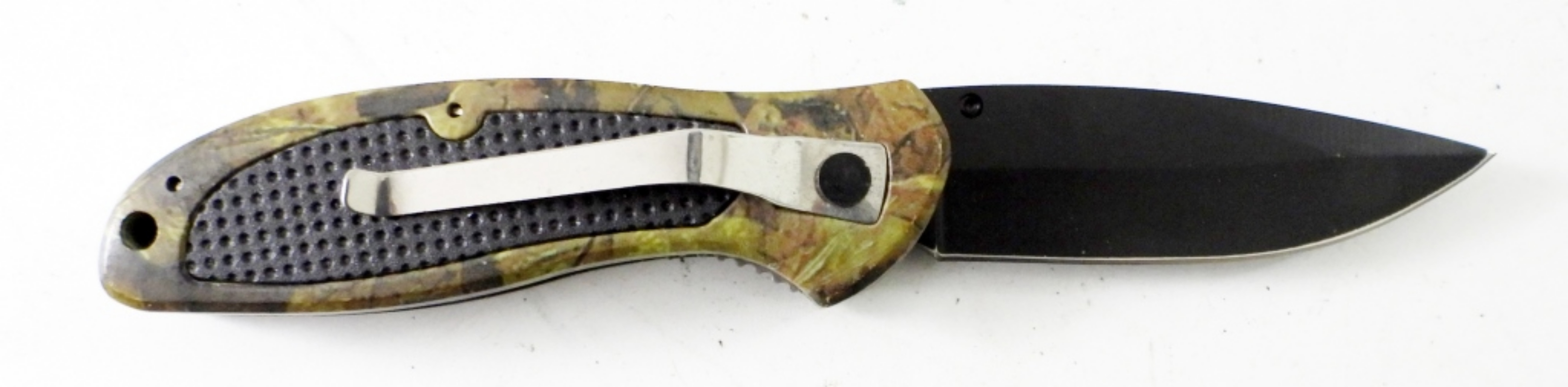CAMO FOLDING POCKET KNIFE.3″ BLACK BLADE GREEN CAMO HANDLES , IN BOX