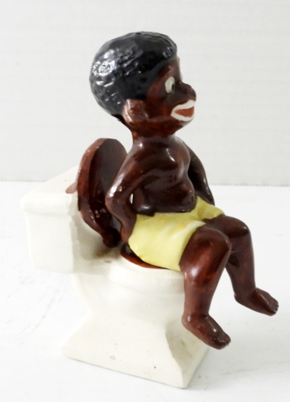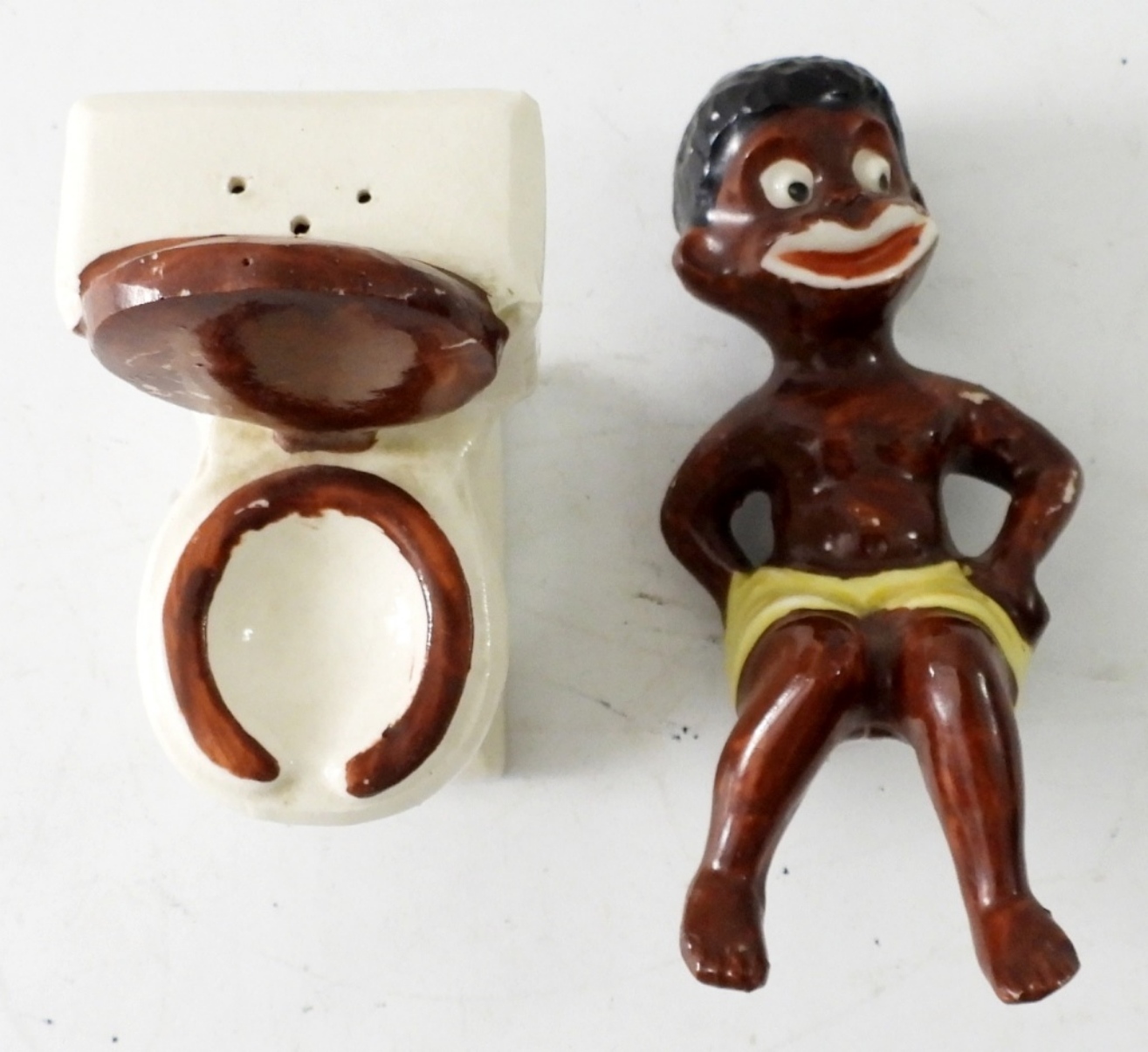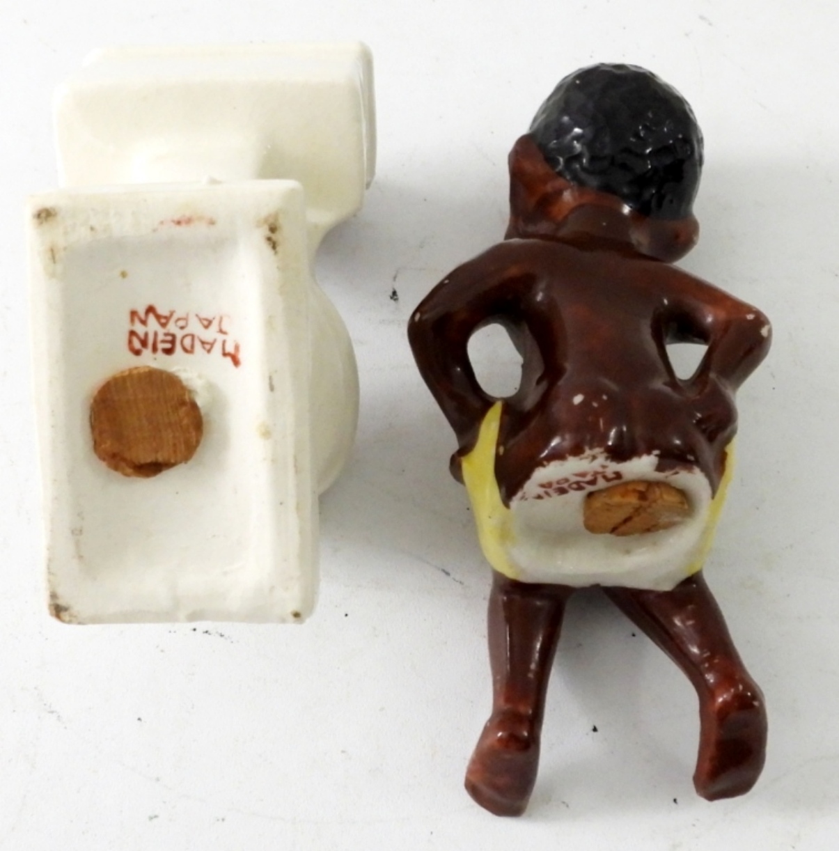 VINTAGE PORCELAIN BOY ON TOILET SALT AND PEPPER SHAKERS (5 IN TALL) MADE IN JAPAN