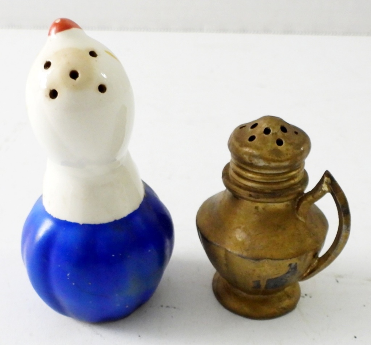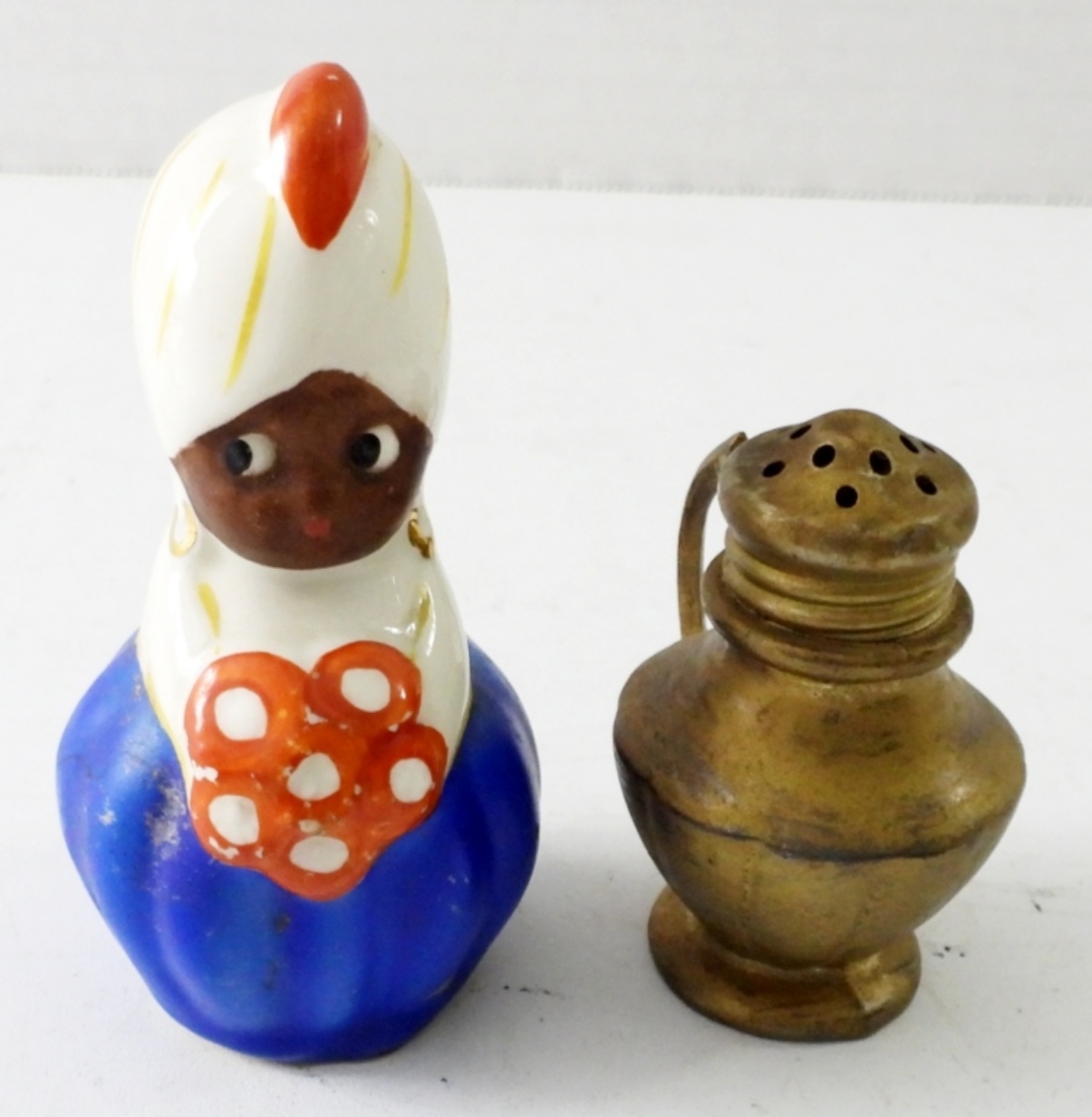 2 PIECE VINTAGE GERMAN SALT & PEPPER SHAKERS LADY AND VASE (4 IN TALL) BEAUTIFUL COLORS