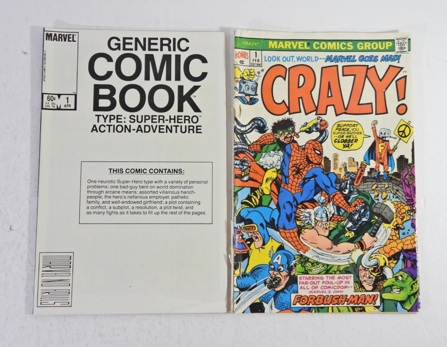 MARVEL “CRAZY” ISSUE #1, 1972 VG. MARVEL “GENERIC COMIC BOOK” #1, 1984 NM.