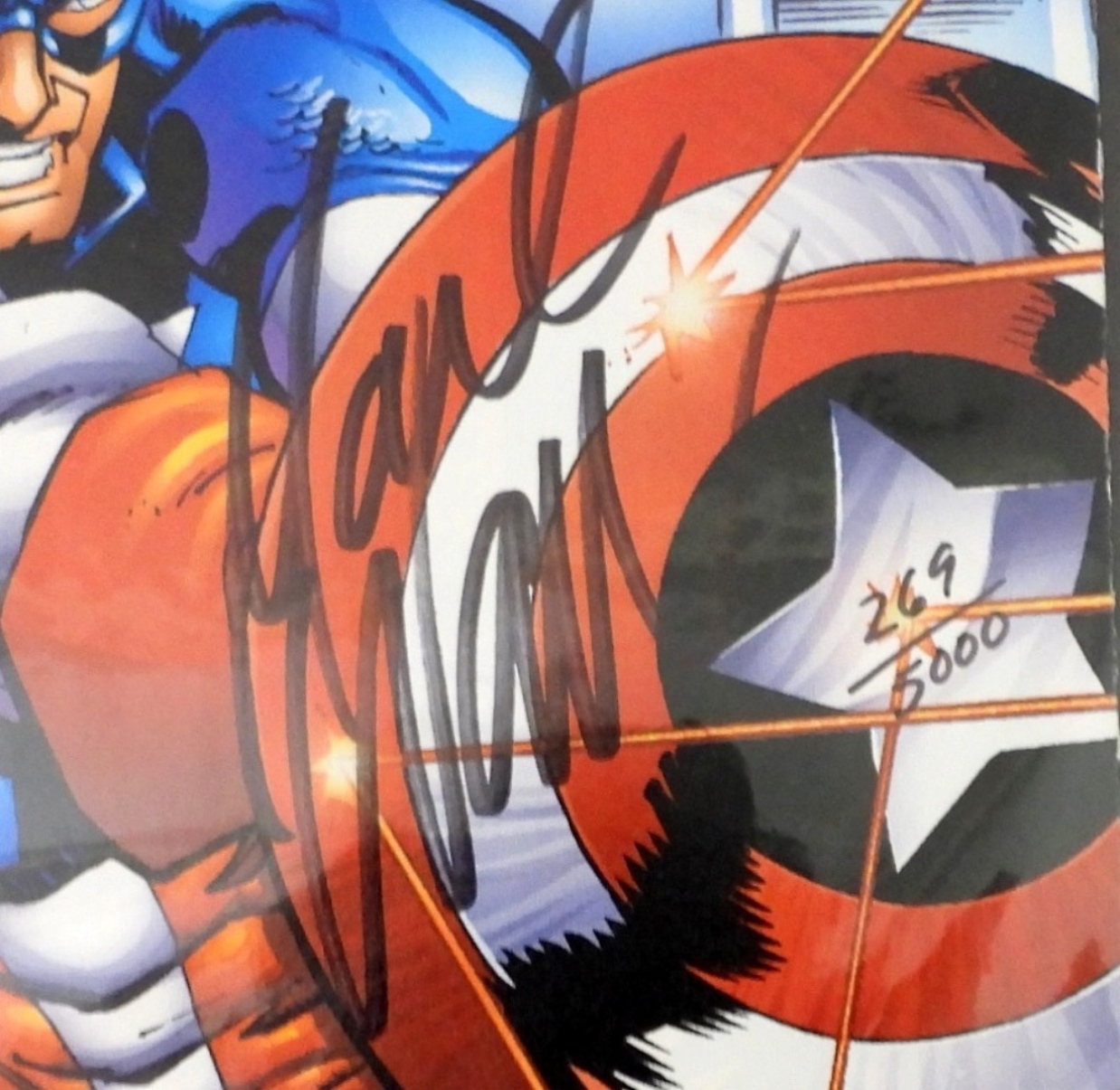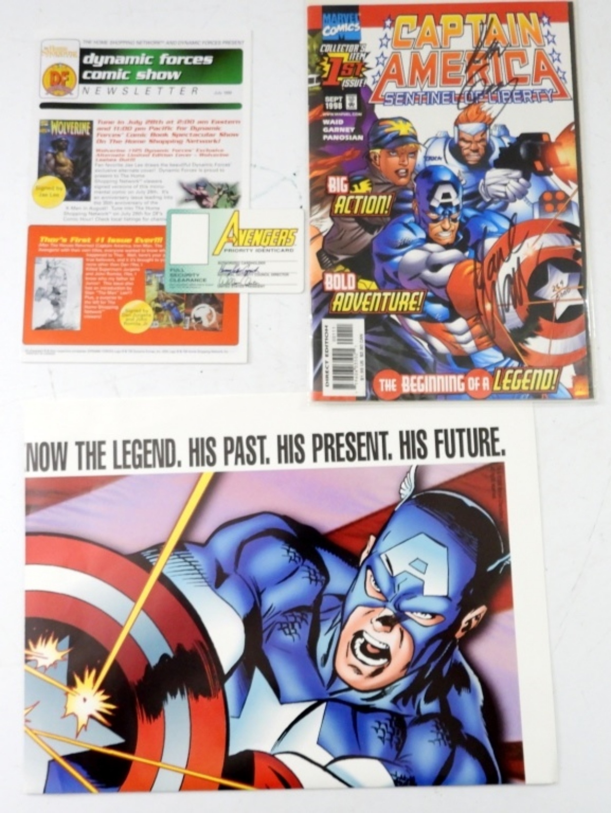 1998 CAPTAIN AMERICA SENTINEL OF LIBERTY AUTOGRAPHED BY MARK WAID AND RON GARNEY, 0269/5000 COA FROM DYNAMIC FORCES, ALSO COMES WITH A POSTER AND MARVEL CARD, ALL IN VG OR BETTER CONDITION