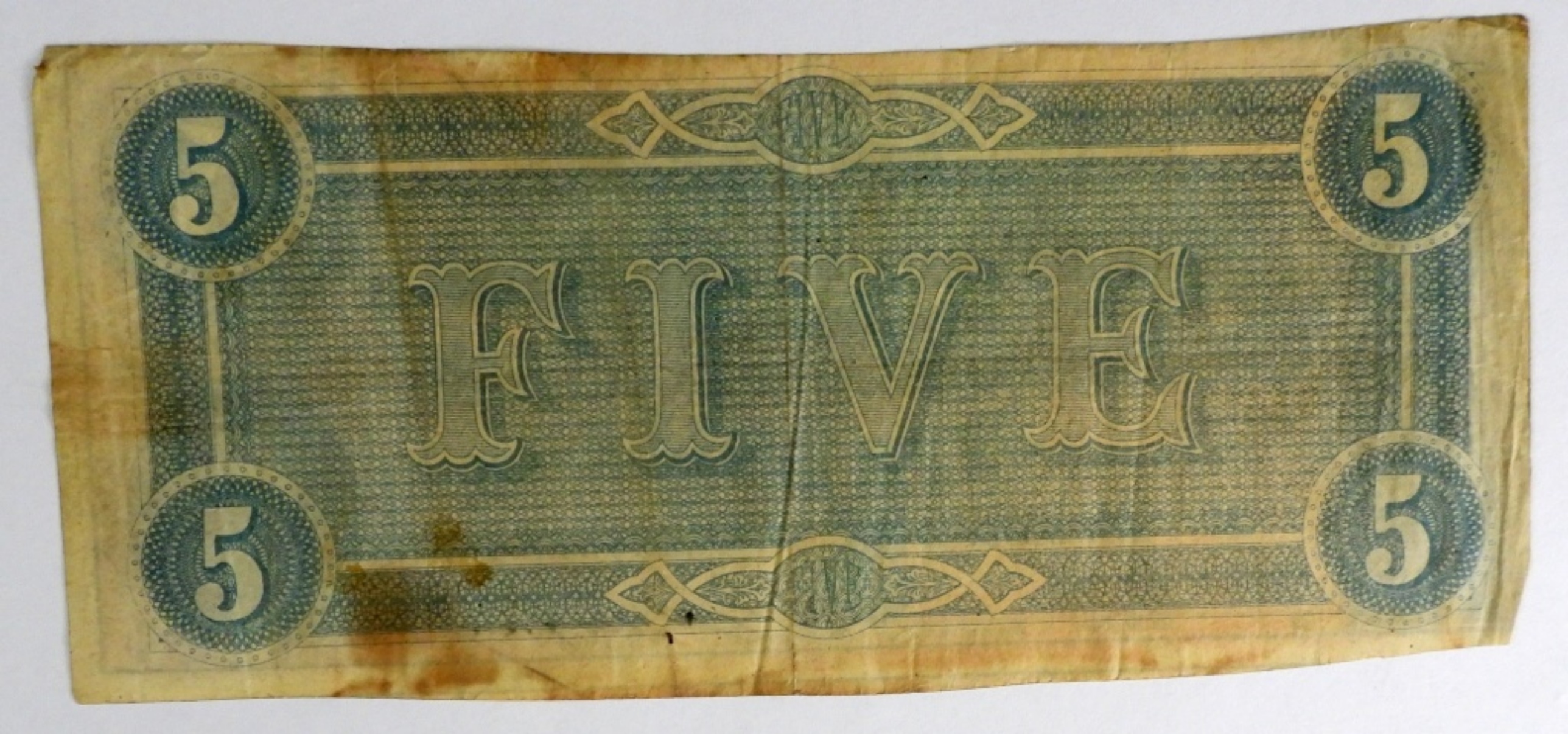 FEB 17TH 1864 $5 CONFEDERATE STATE OF AMERICA NOTE, RICHMOND VA . NICE NOTE