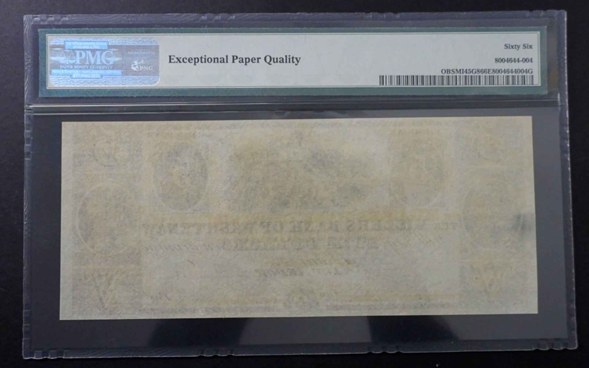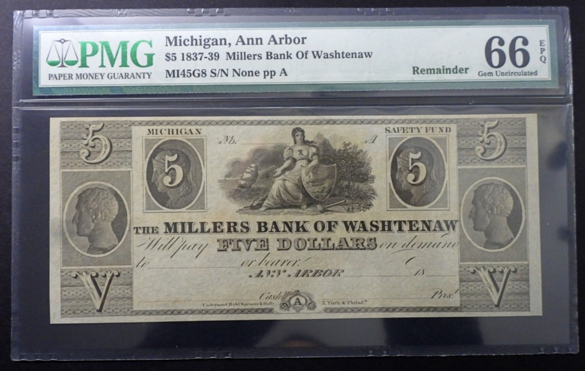 FIVE DOLLARS, MILERS BANK OF WASHTENAW, MI45G8 S/N NONE PP A, 66 GEM UNCIRCULATED, REMAINDER
