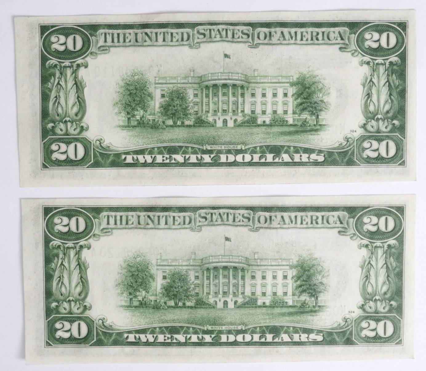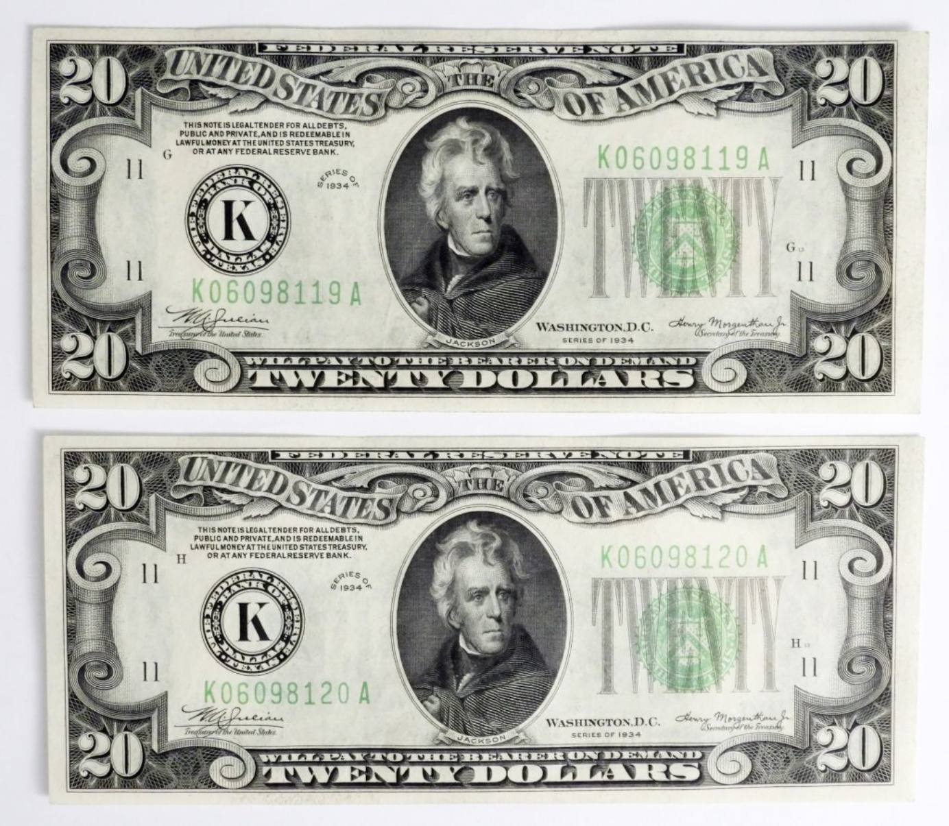 (2) 1934 US $20 FEDERAL RESERVE NOTE, CONSECUTIVE NUMBERS, AU