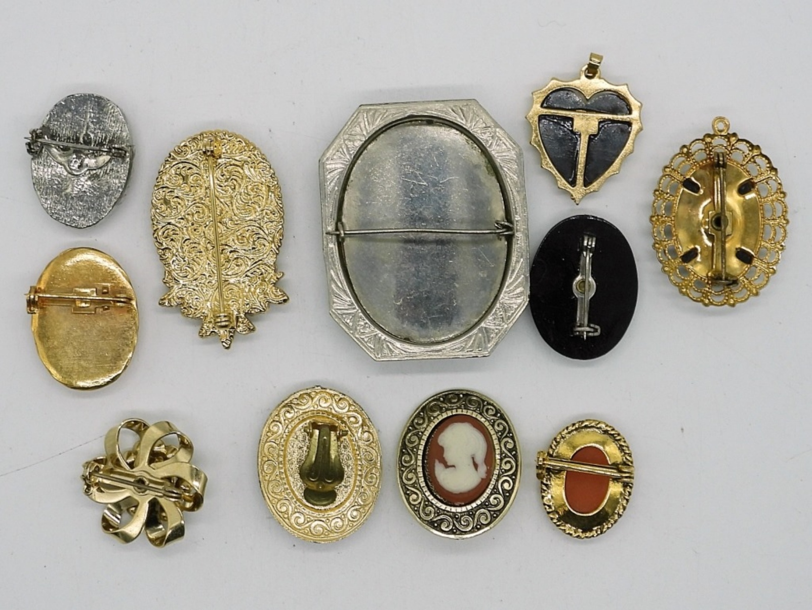 EIGHT CAMEO BROOCHES, ONE PAIR OF CAMEO CLIP ON EARRINGS AND ONE CAMEO PENDANT. GOLD AND SILVER TONES.