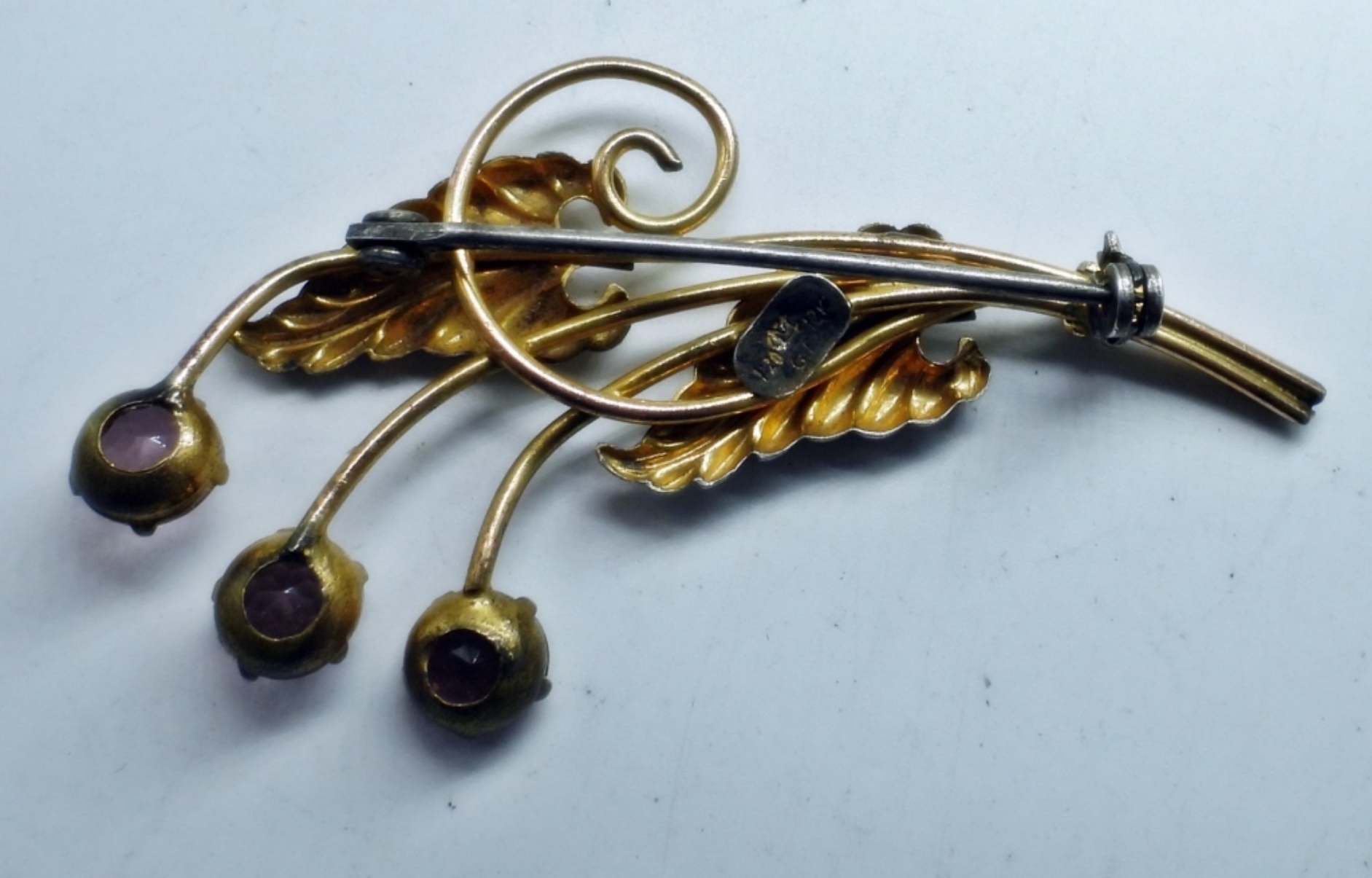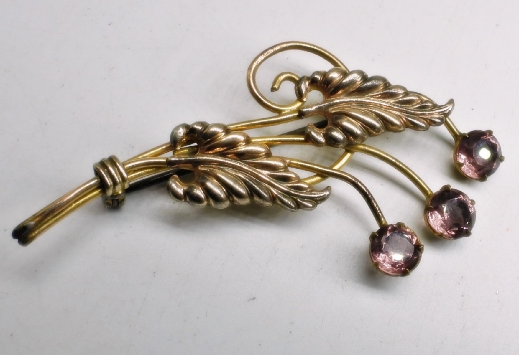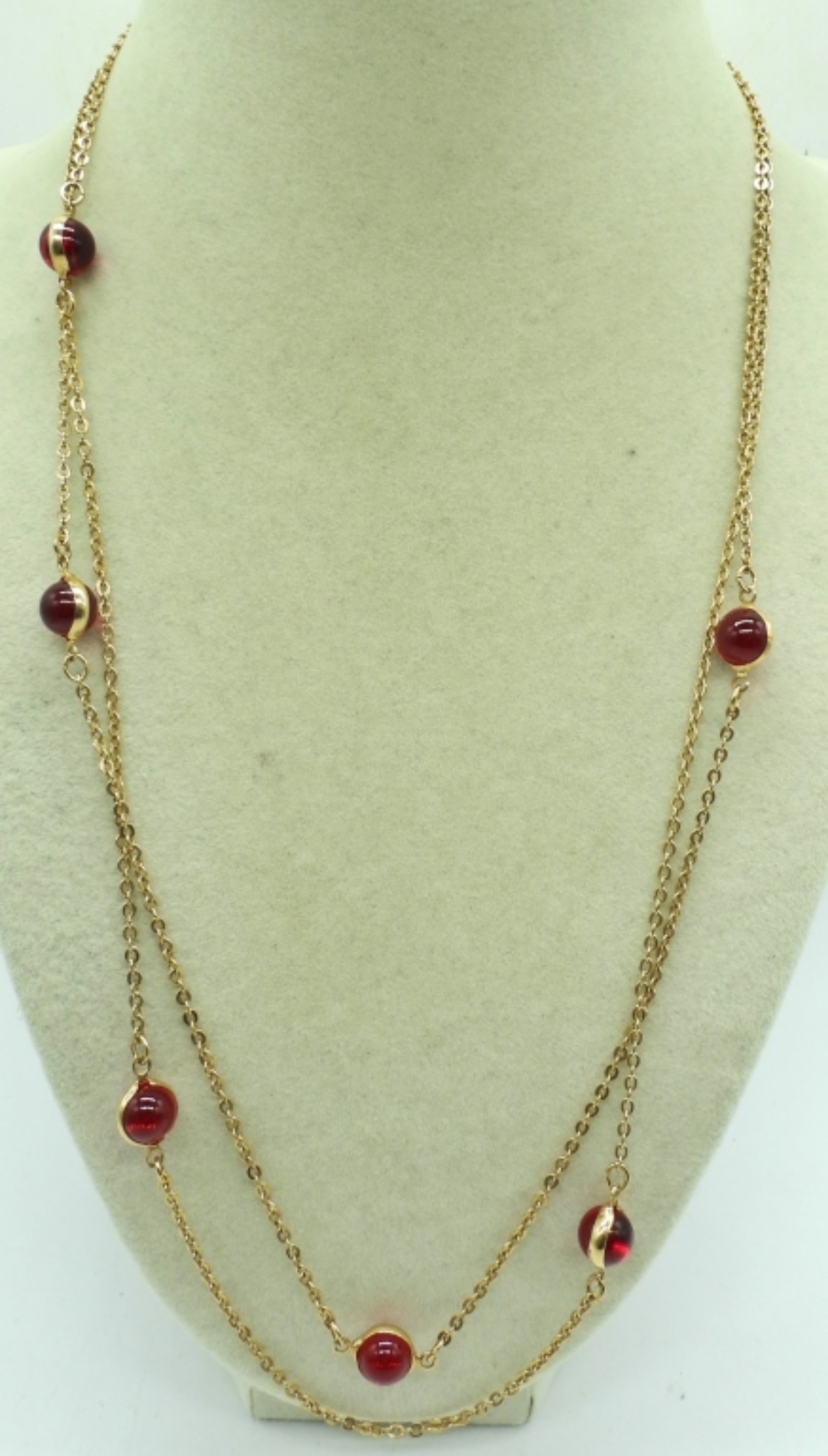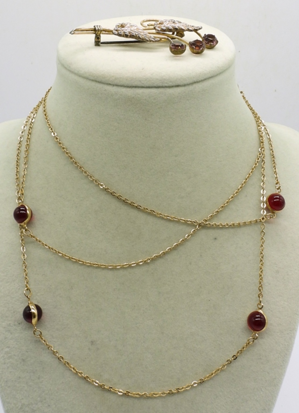 Vintage Gold Tone AVON Necklace, 42″ with Red Beads. Floral Gold Tone Vintage Brooch with Pink Rhinestones.