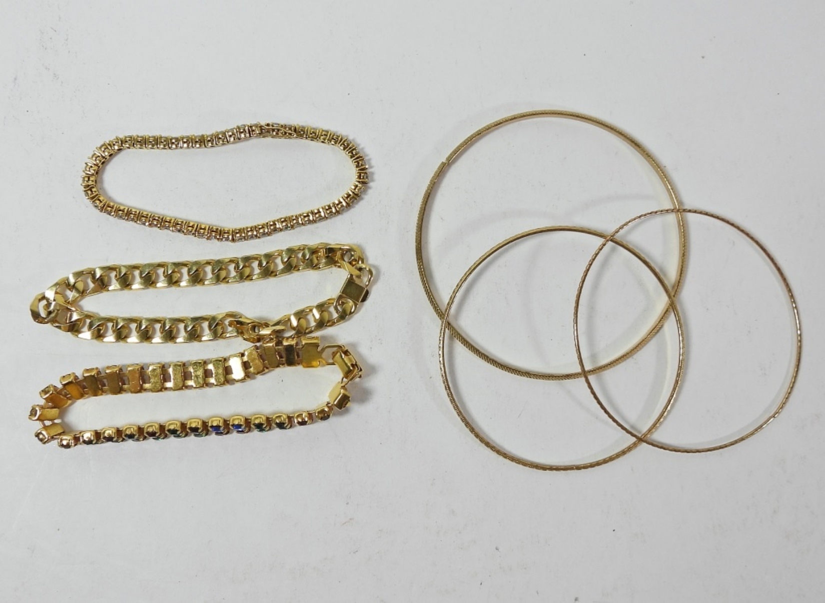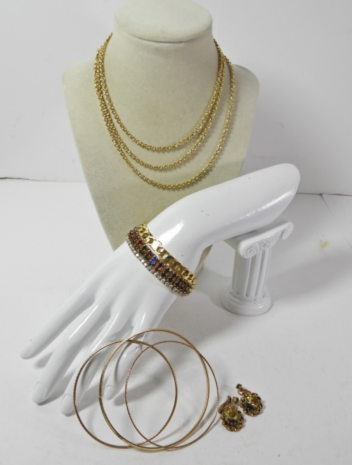 6 VINTAGE GOLD TONE BRACELETS 6″, VINTAGE GOLD TONE NECKLACE 44″, A PAIR OF VINTAGE EARRINGS