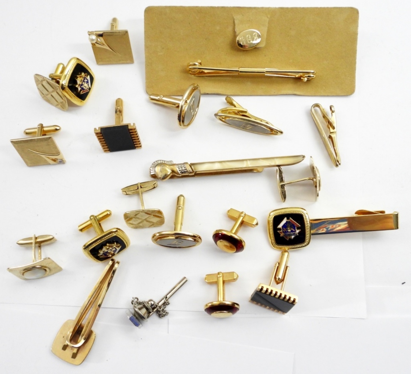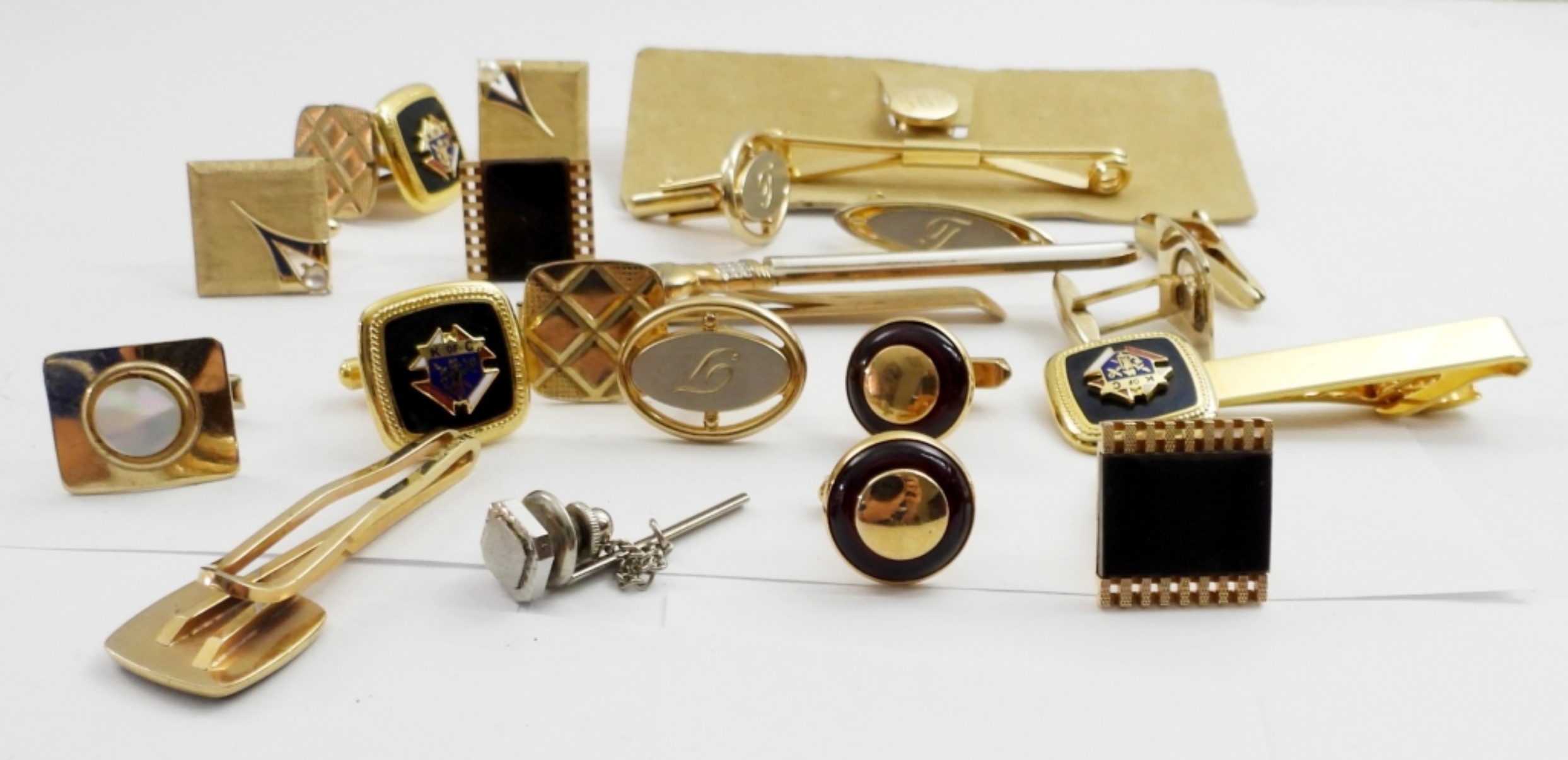 8 PAIR GOLD TONE CUFFLINKS,5 TIE CLIPS GOLD TONE