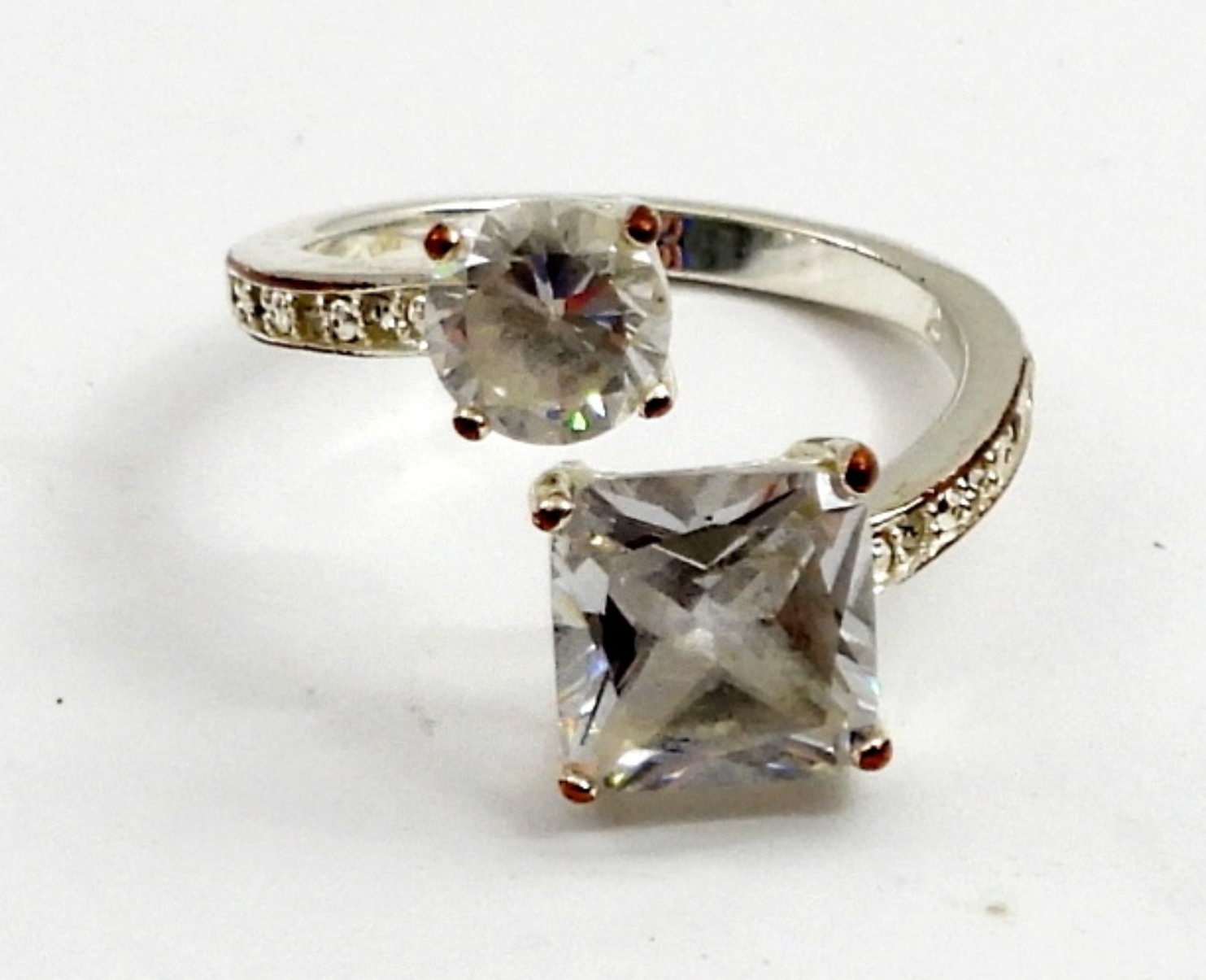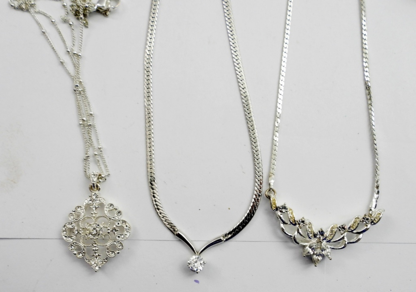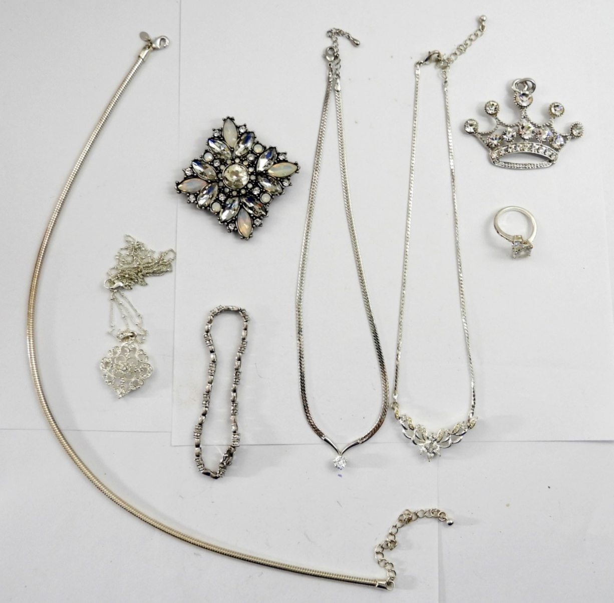 4 VINTAGE RHINESTONE SILVER TONE NECKLACES 14″-18″,SILVER TONE BRACELET WITH FAUX DIAMONDS s 6″, SIZE 8 FAUX DIAMOND SILVER TONE RING ,AND A SILVER TONE RHINESTONE BROOCH