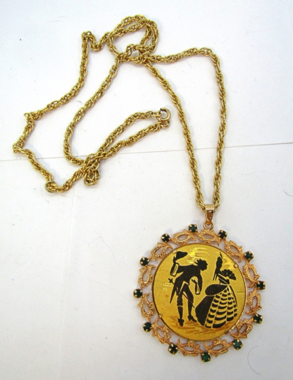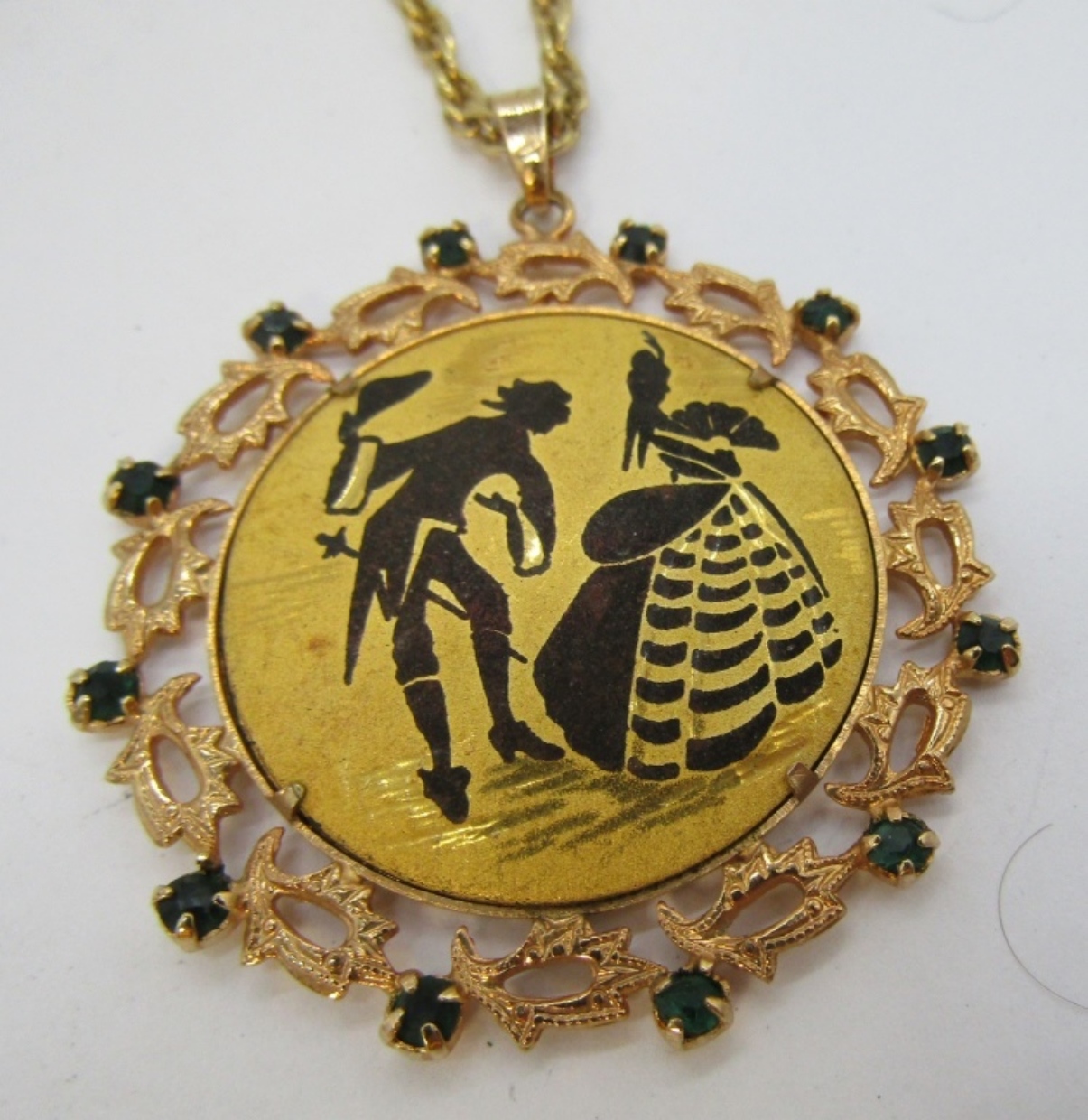 MADE IN SPAIN, DAMASCENE COURTING COUPLE PENDANT & GOLD TONE CHAIN.23″.