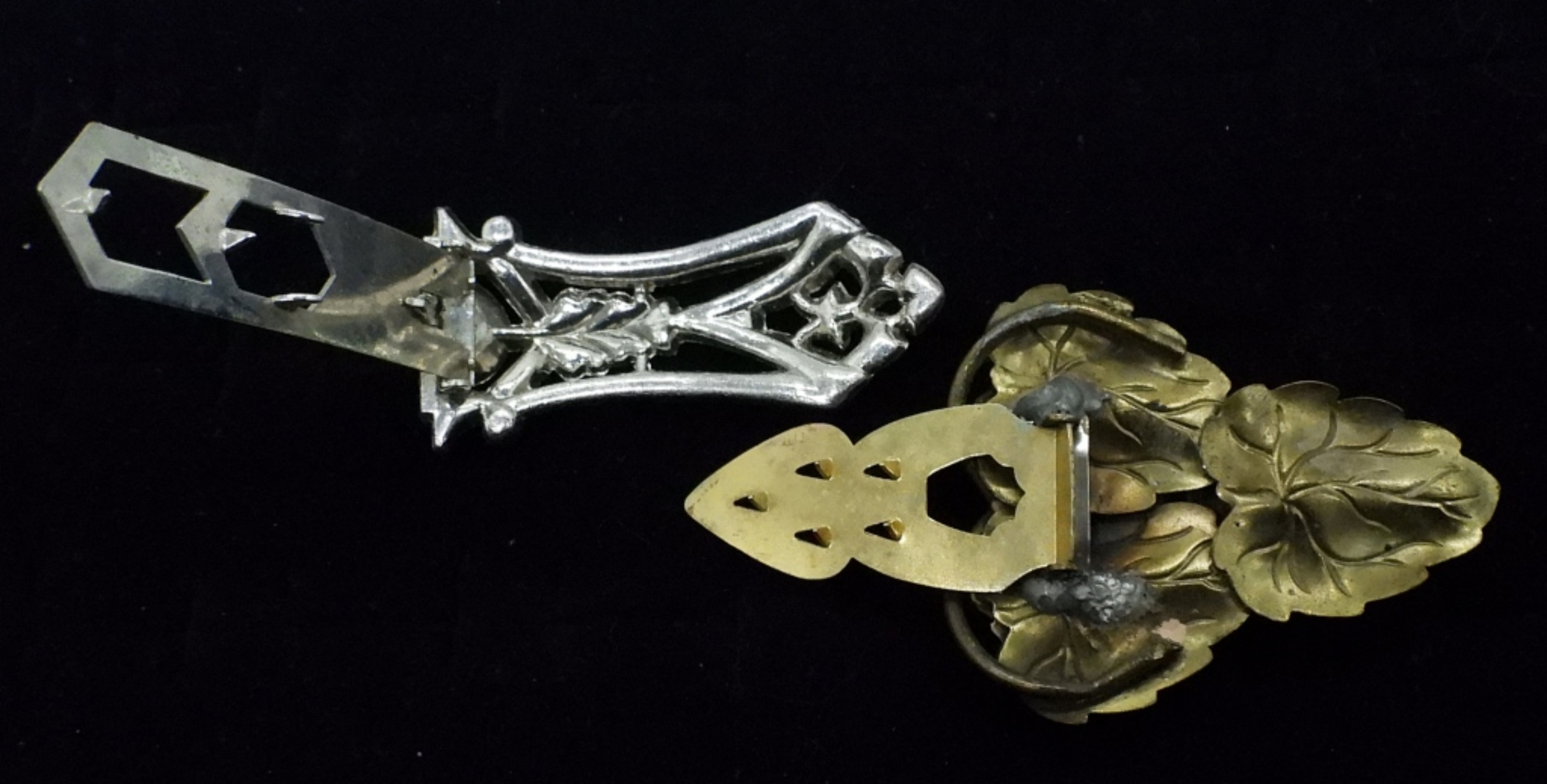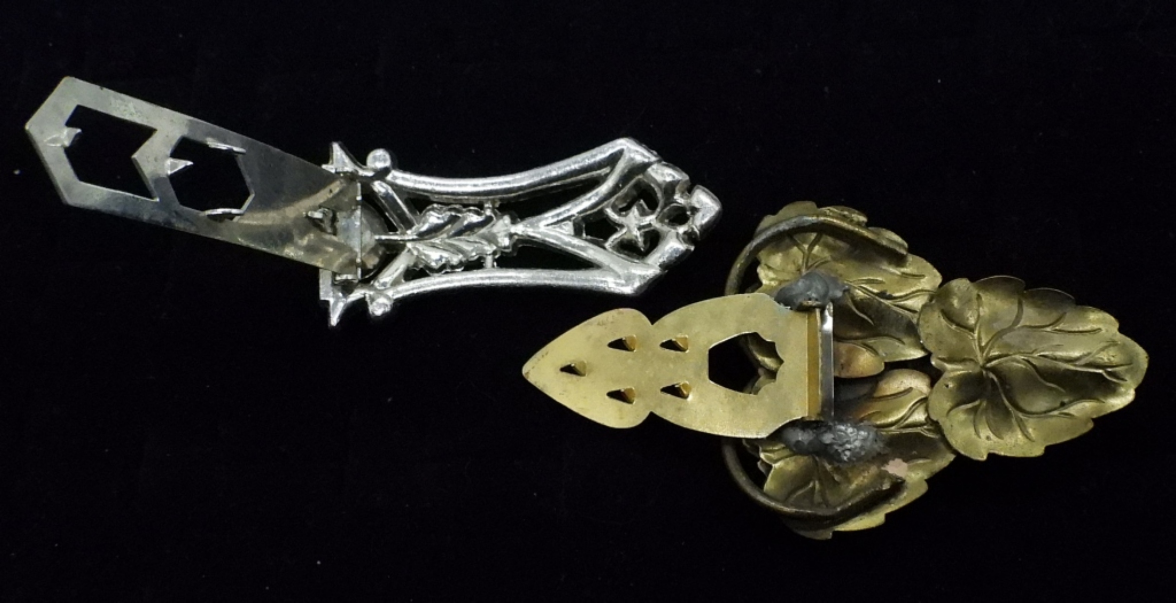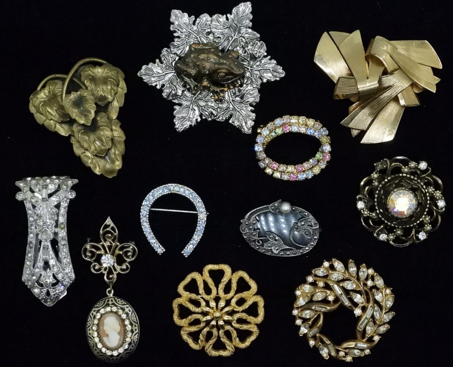 ELEVEN VINTAGE GOLD AND SILVER TONE BROOCHES & CLIPS. LARGEST IS 2.5″