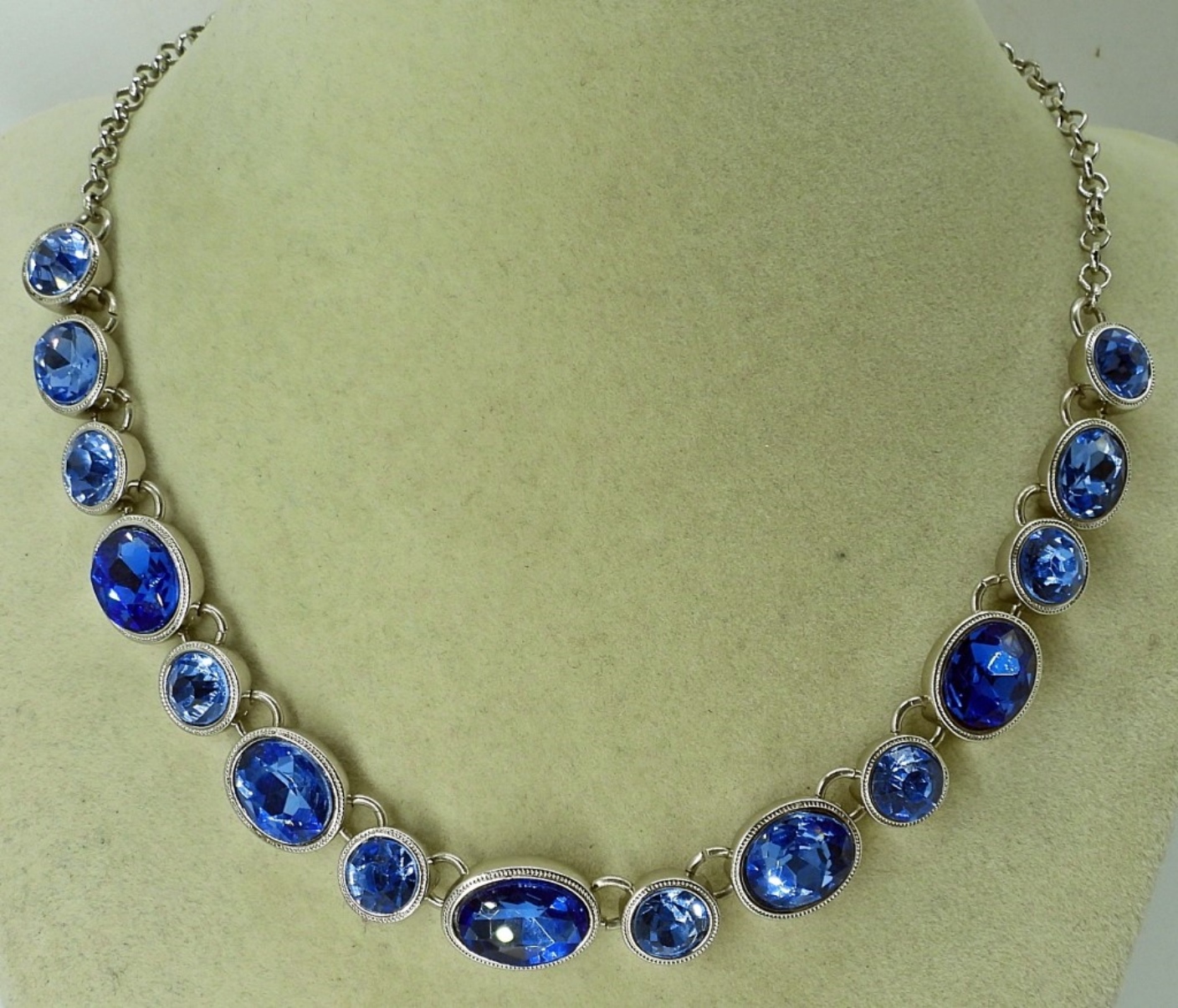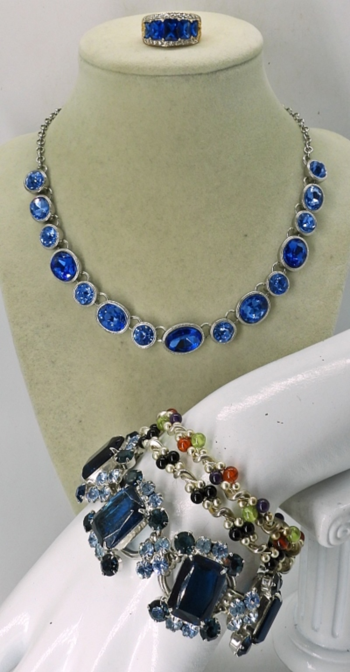NECKLACE, BRACELET & RING WITH BEAUTIFUL BLUE SAPPHIRE COLORED GEMSTONES, 18″, 9″ & RING SIZE 9. TWO WIRE BEADED BRACELETS, 7″.