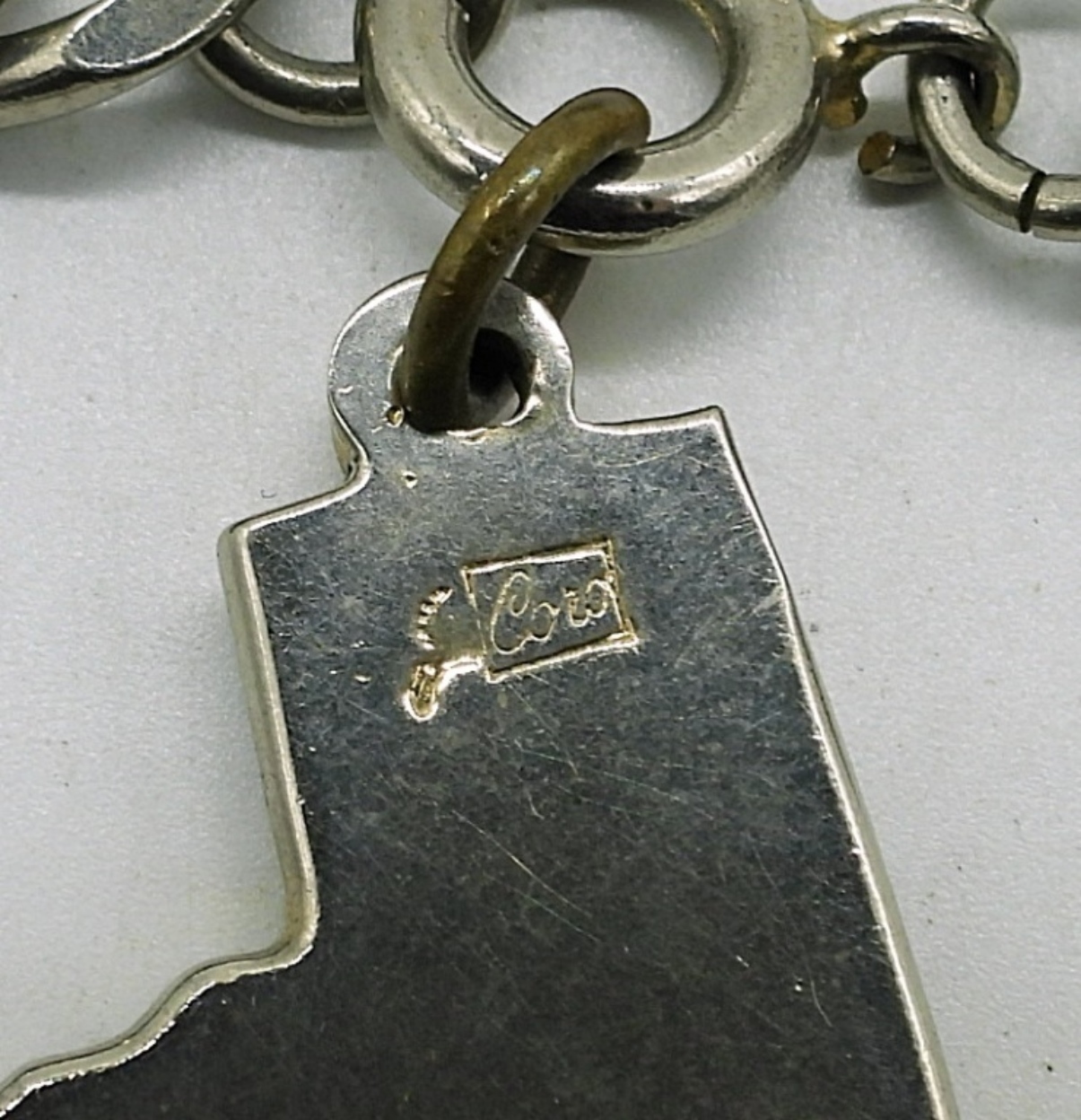 Vintage CORO Silver Tone Bracelet, 7″. Large Texas Shaped Charm on a Chain Bracelet. Charm Measures 1.5″ x 1.5″.