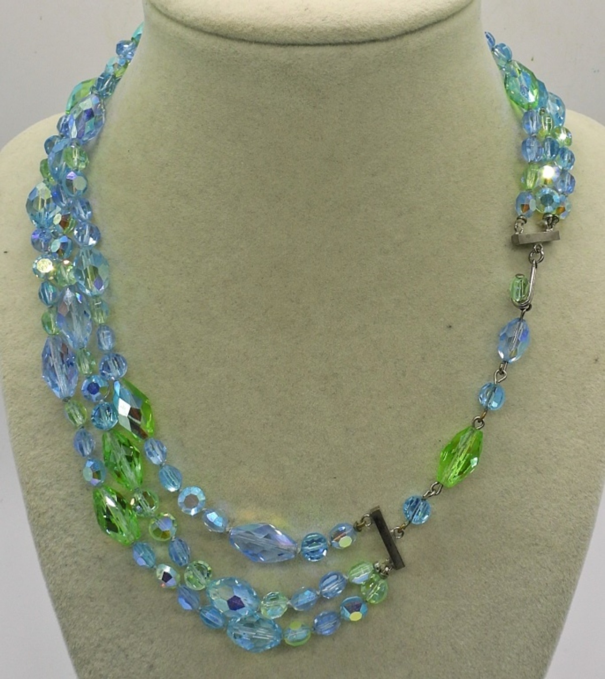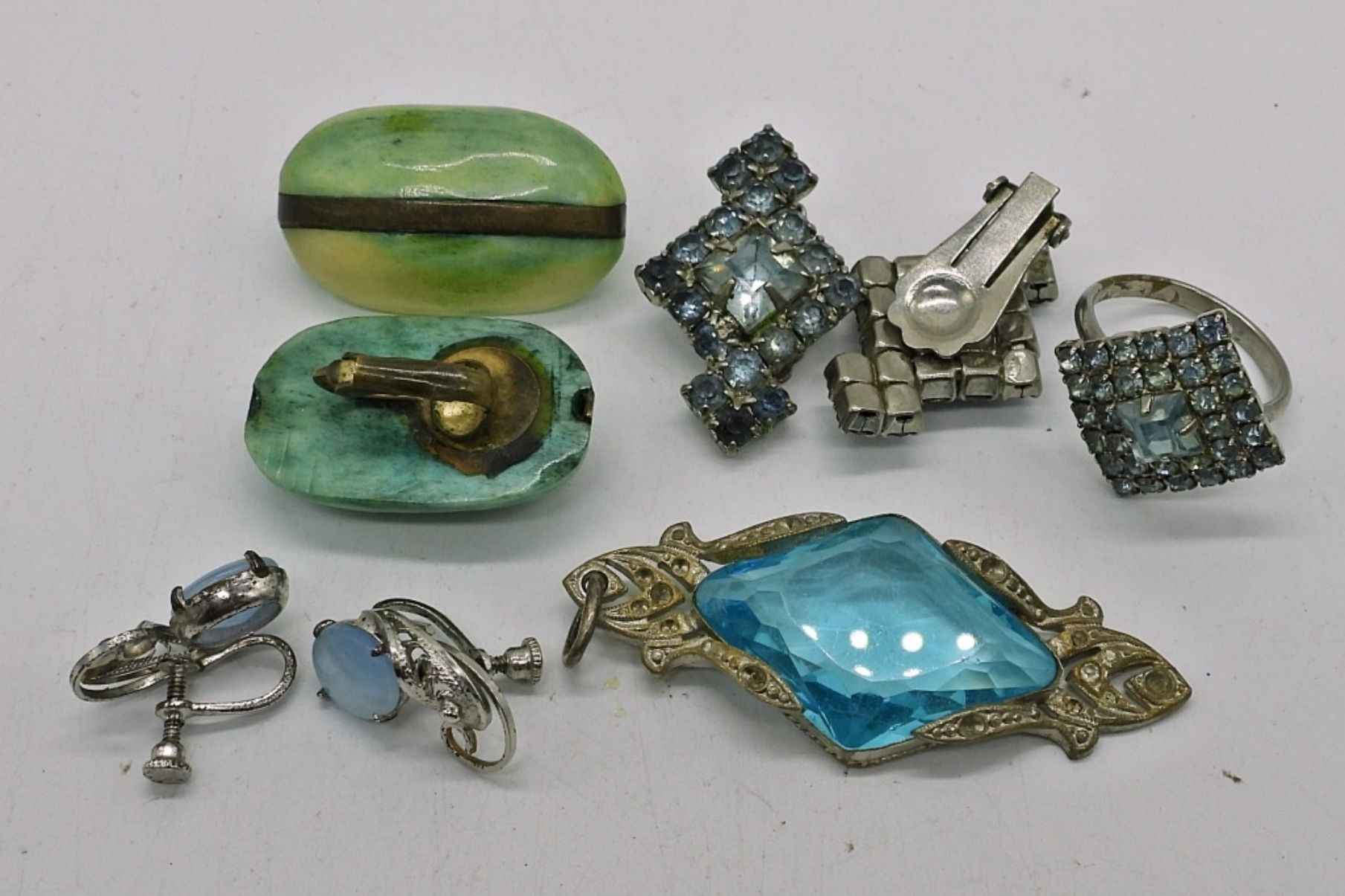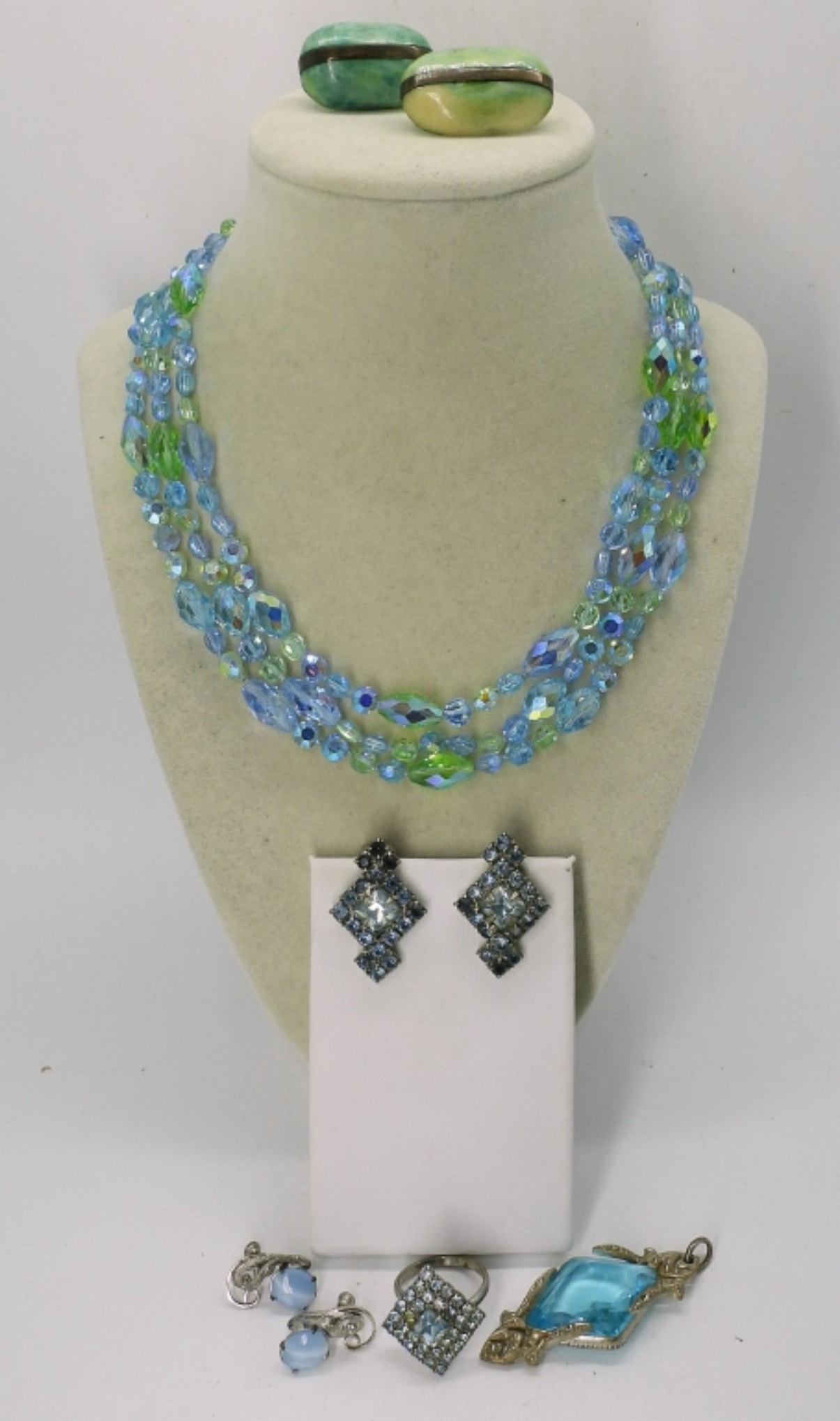 VINTAGE BLUE AND GREEN GEMSTONE / RHINESTONE JEWELRY. RINGS SIZE 8. PENDANT 2″. NECKLACE 16″.