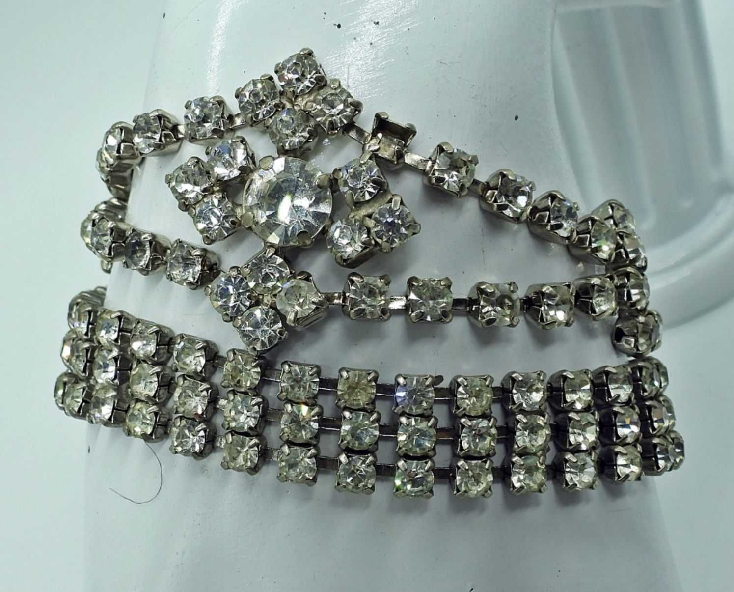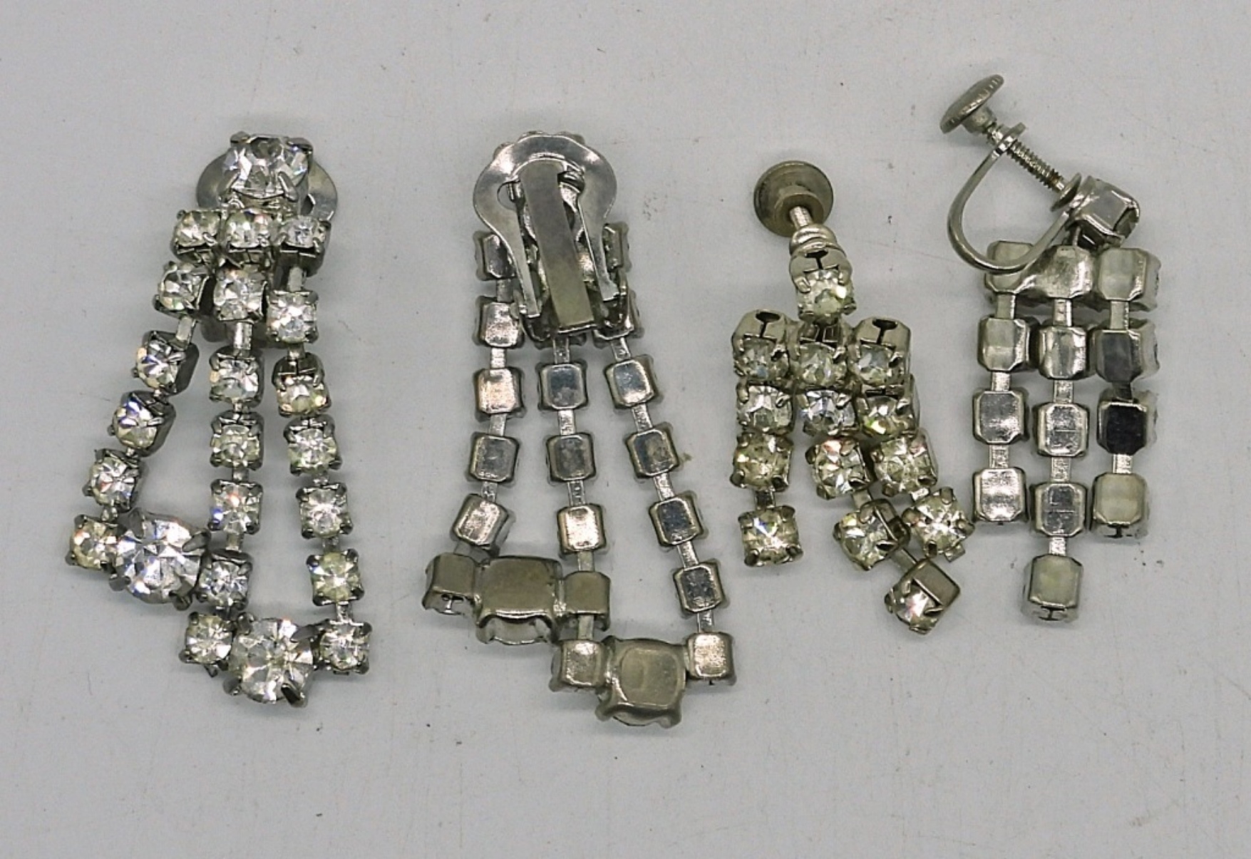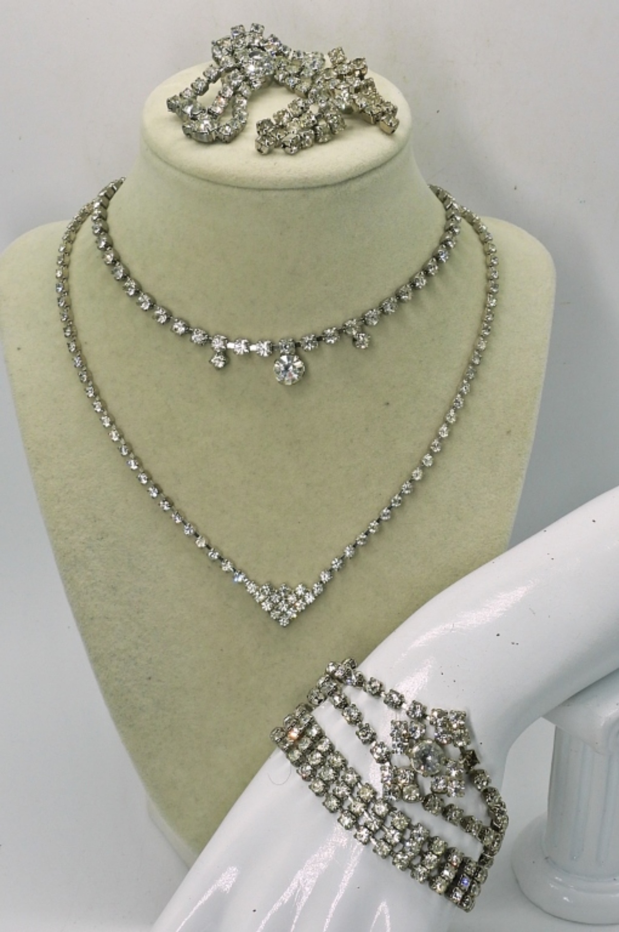 VINTAGE WHITE RHINESTONE SETS. TWO PAIR OF CLIP ON EARRINGS, TWO NECKLACES, 15″ & 17″. TWO BRACELETS, 7″. TWO PAIR EARRINGS .