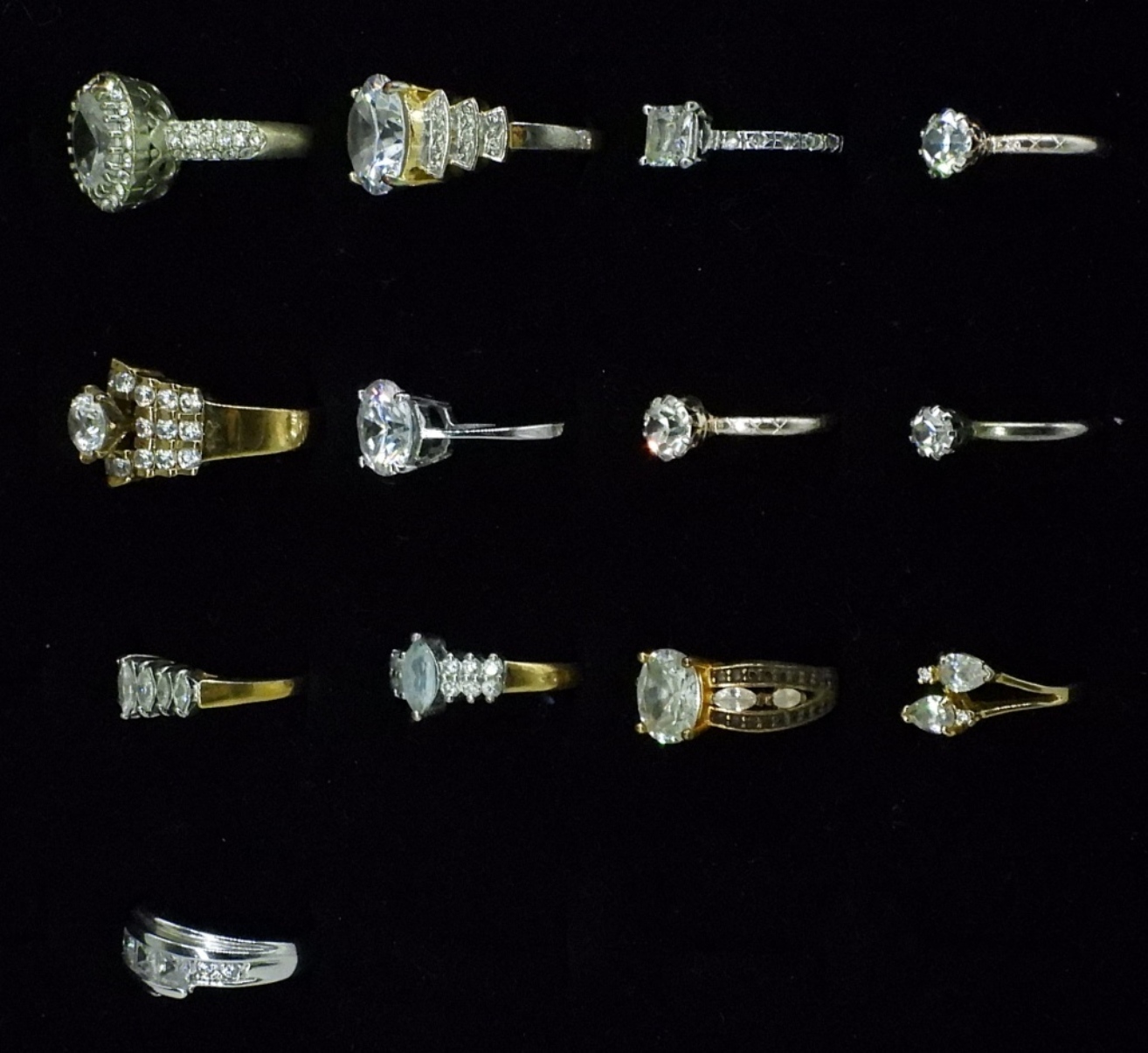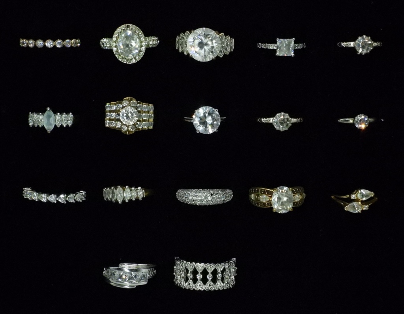 SEVENTEEN GOLD AND SILVER TONE BRIDAL STYLE FASHION RINGS. SIZES RANGE FROM 5-10.