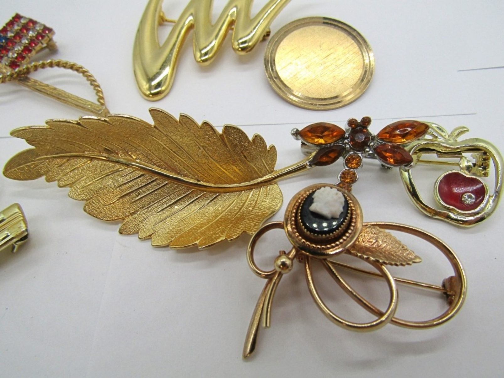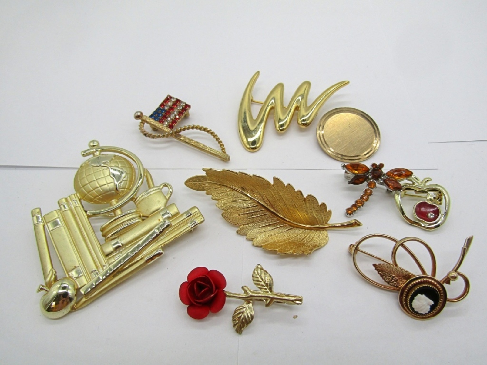 NINE VINTAGE GOLD TONE BROOCHES AND PINS. CAMEO IS PARTIALLY BROKEN. LARGEST BROOCH MEASURES 2.5″ x 3″.