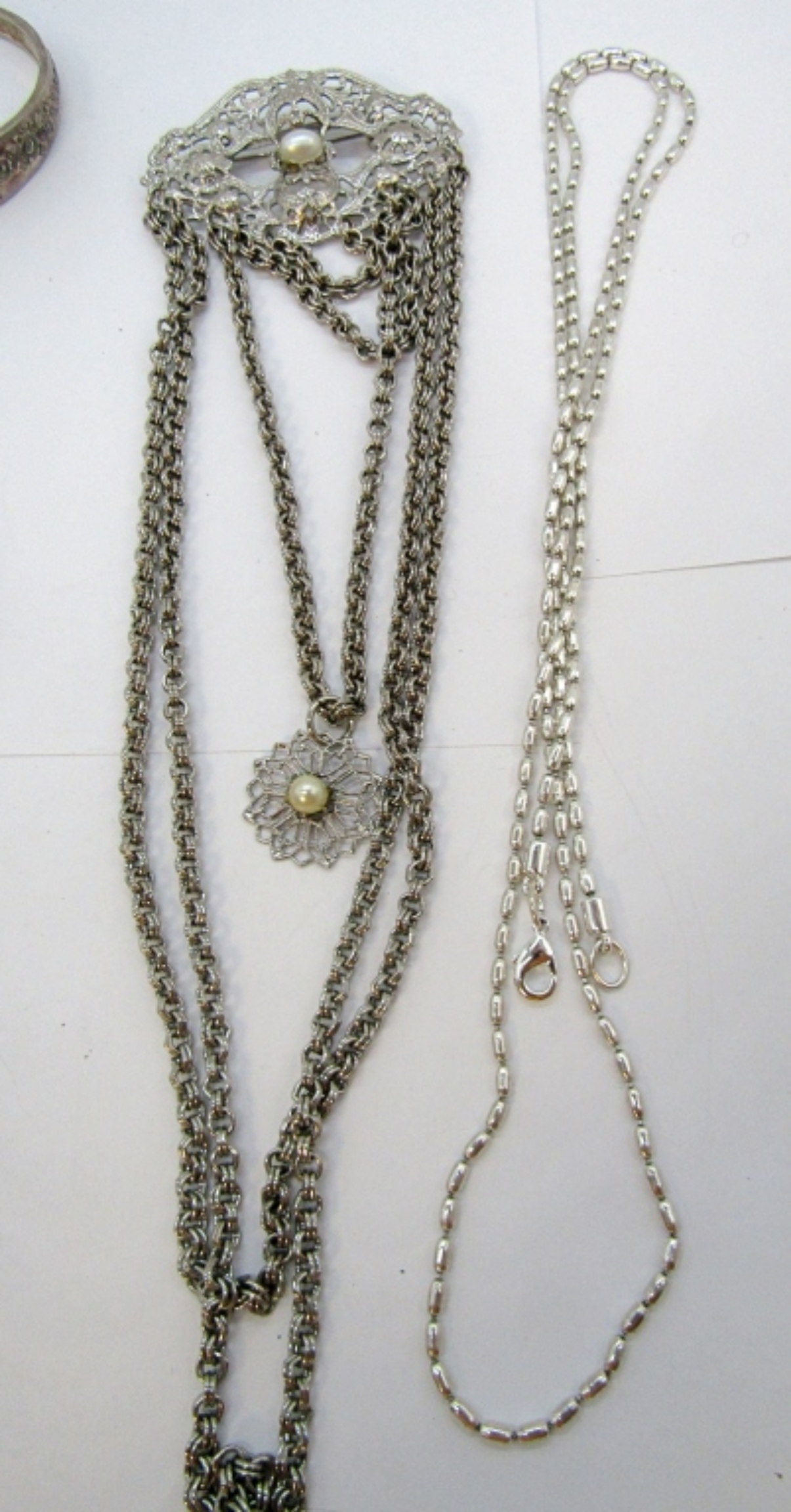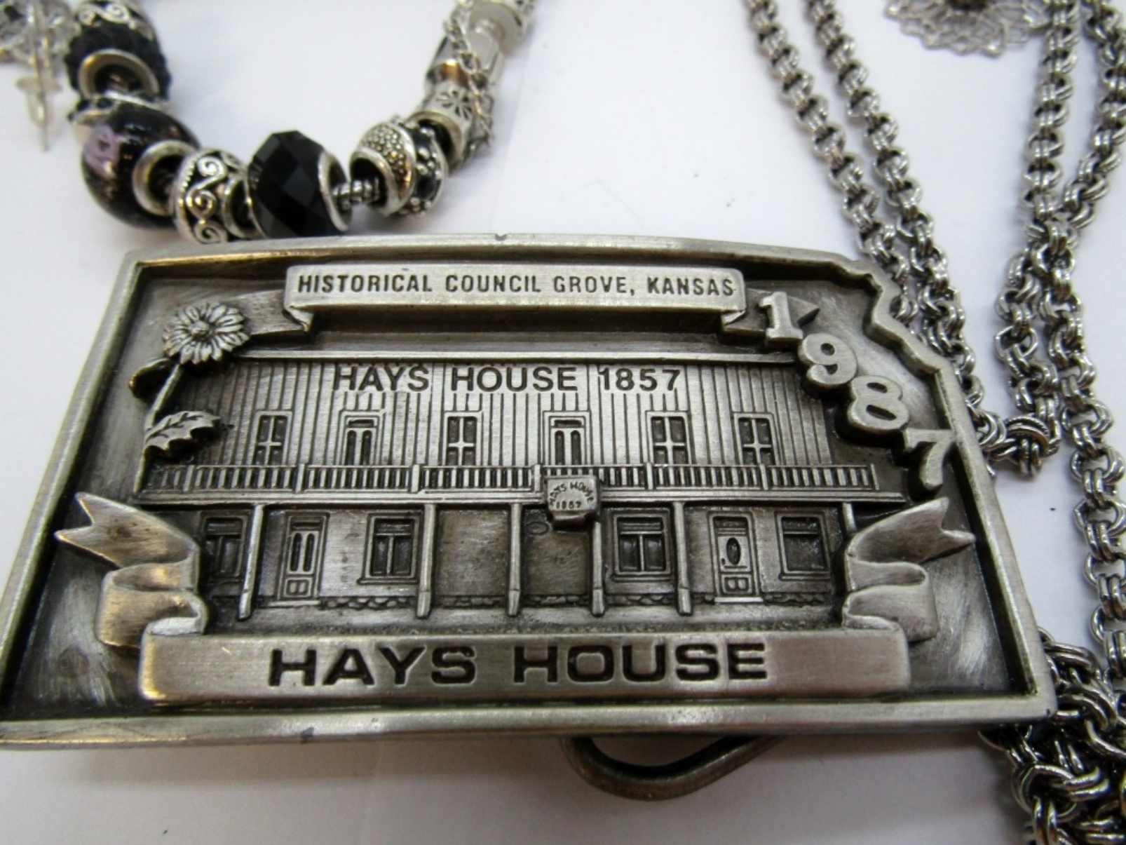 HAYS HOUSE BELT BUCKLE, 3″x1.5″. TWO BROOCHES, 3 BRACELETS (7″). ONE NECKLACE, 36″.3 PAIR OF PIERCED EARRINGS.