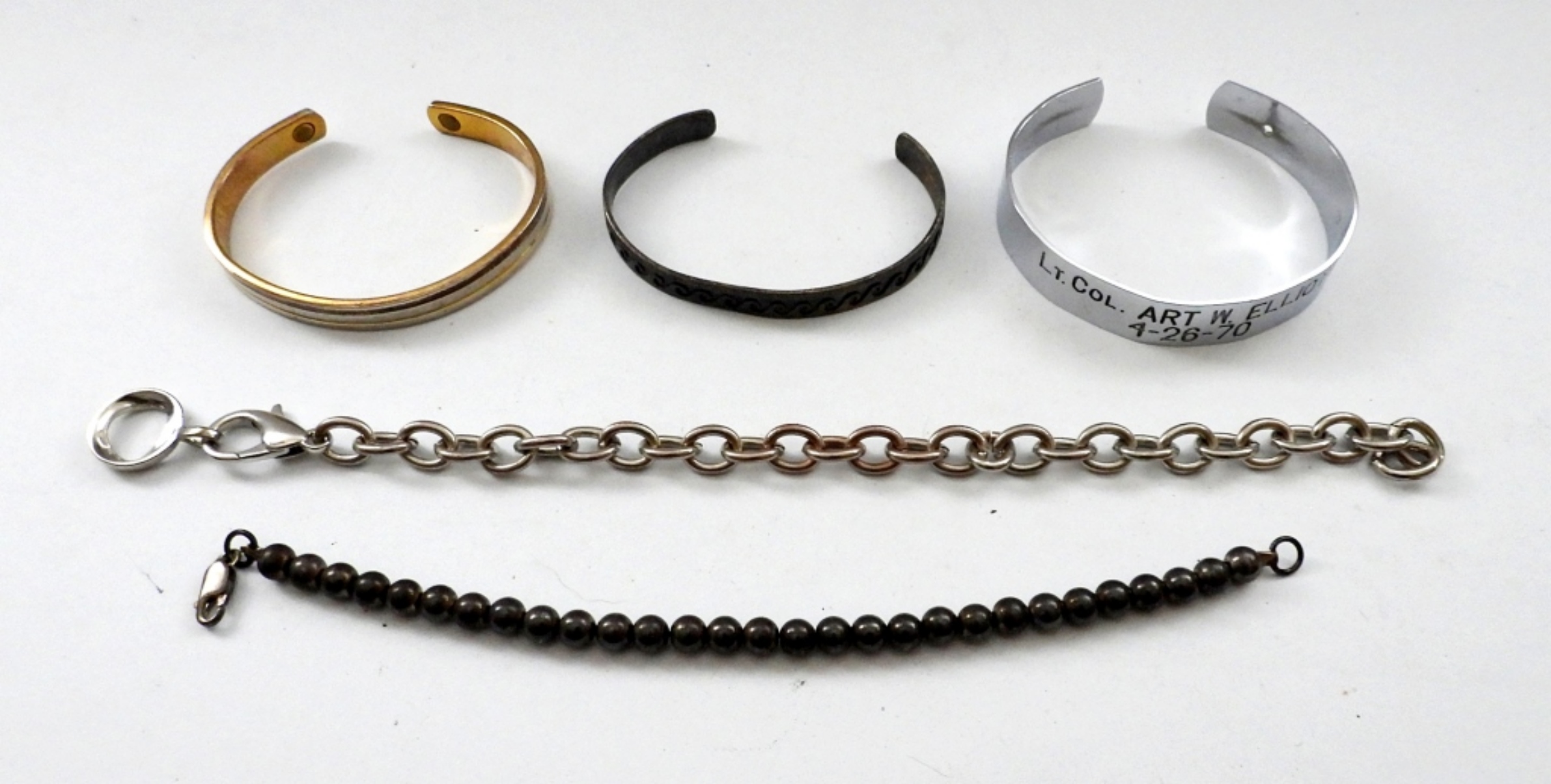 7″ & 9″ CHAIN BRACELETS; (3) CUFF STYLE BRACELETS WITH ENGRAVING (1- STAMPED 24K GOLD ELECTROPLATED)