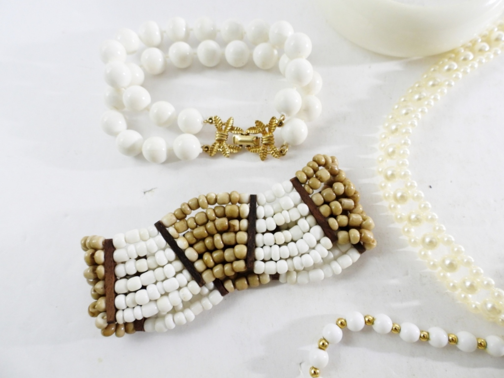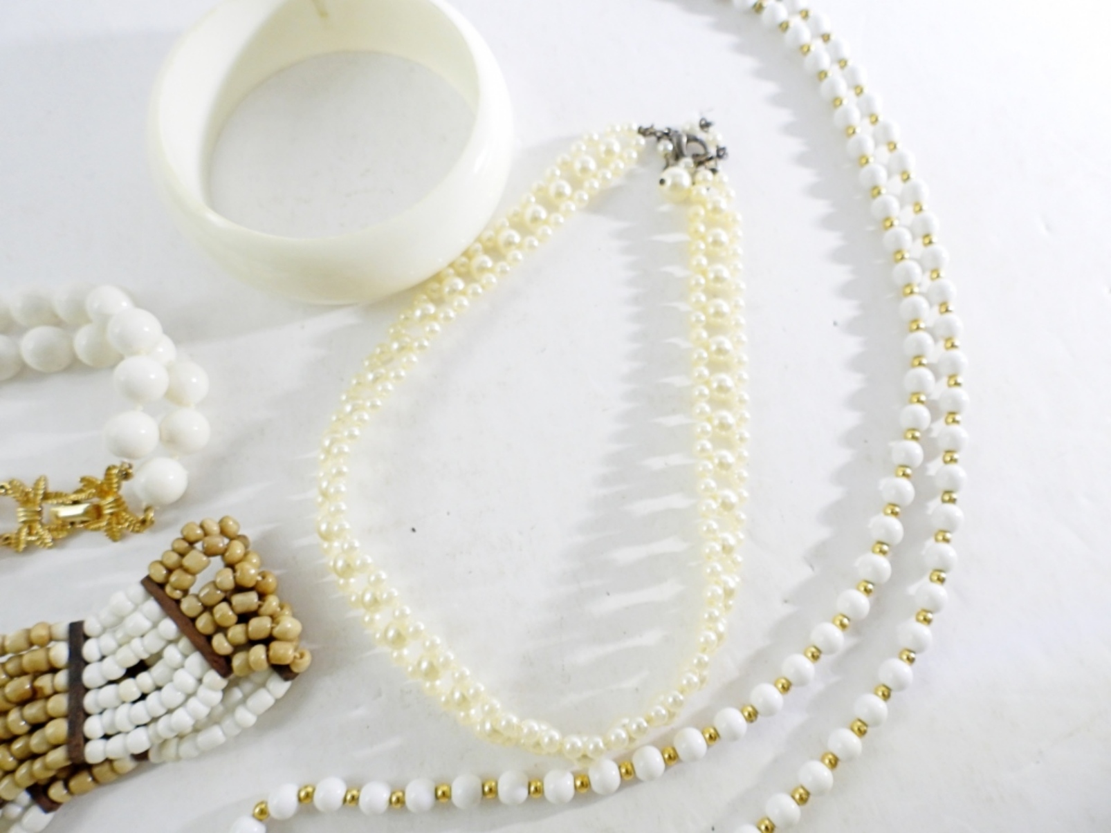 TWO NECKLACES, 26″ & 32″. THREE BRACELETS, HARD WHITE PLASTIC BANGLE, WHITE BEADED WITH GOLD CLASP 8″. STRETCHY WHITE AND TAN BEADED 8″.
